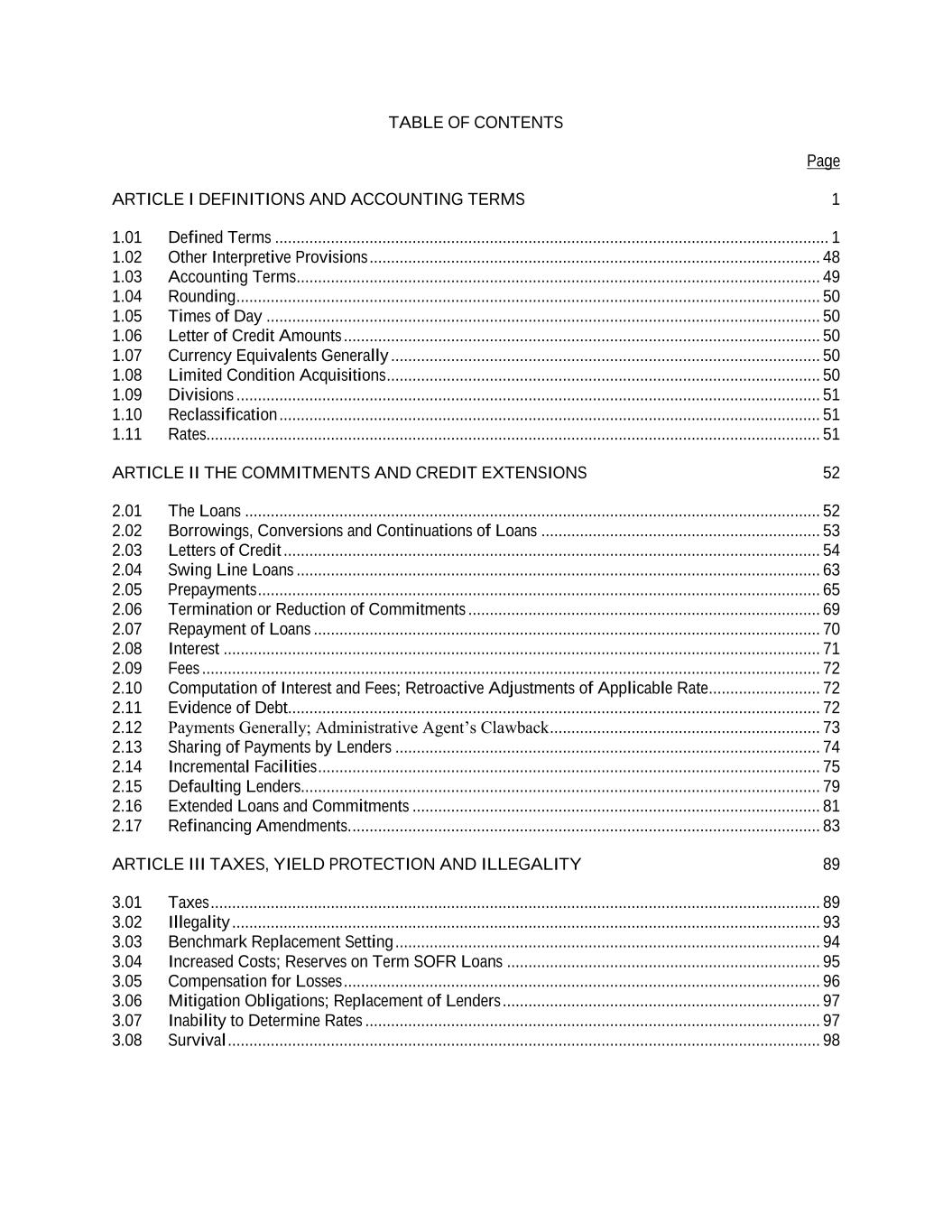 目录页第一条定义和会计术语11.01定义术语.................................................................................................................... 11.02其他解释性规定.......................................................................................................48 1.03会计术语....................................................................................................................49 1.04四舍五入....................................................................................................................50 1.05天的次数....................................................................................................50 1.06信用证金额....................................................................................50 1.07货币等价物一般....................................................................................50 1.08有限条件收购....................................................................................50 1.09司....................................................................................................................51 1.10重分类....................................................................................................................................................51 1.11利率...................................................................................................................................…………………………………………………………………………………………………………………………………………………………………………………………………………………………………………………………………………………………贷款的转换和续贷...................................................................53 2.03信用证...................................................................................................................54 2.04周转额度贷款...................................................................................................................63 2.05预付款项.......................................................................................................................65 2.06终止或减少承诺...................................................................................................................69 2.07偿还贷款...................................................................................................................70 2.08利息...................................................................................................................7 12.09费用....................................................................................................................................72 2.10利息和费用的计算;适用利率的追溯调整....................................72 2.11债务的证据................................................................................................................72 2.12一般付款;行政代理人的追回....................................................................73 2.13贷款人分担付款mitments.................................................................................................81 2.17再融资修正案。.....................................................................................................83第三条税收, 收益保护和违法893.01税收......................................................................................................................................89 3.02违法...................................................................................................................93 3.03基准替换设定...................................................................................................94 3.04成本增加;定期SOFR贷款准备金...................................................................95 3.05损失赔偿...................................................................................96 3.06缓解义务;更换贷款人...................................................................................97 3.07无法确定利率...................................................................................................................97 3.08生存情况.......................................................................................................................98
