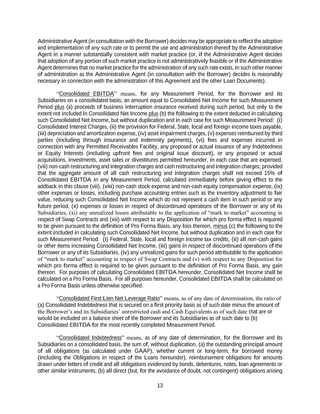 13行政代理人(与借款人协商)决定可能适当反映任何此类费率的采用和实施情况,或允许行政代理人以与市场惯例基本一致的方式使用和管理该费率(或者,如果行政代理人决定采用此类市场惯例的任何部分在行政上不可行,或者如果行政代理人确定不存在任何此类费率管理的市场惯例,以行政代理人(与借款人协商)认为与本协议和其他贷款文件的管理合理必要的其他管理方式)。“合并EBITDA”是指,就任何计量期间而言,对于借款人及其在合并基础上的子公司而言,金额等于该计量期间的合并净收益加上(a)在该期间收到的营业中断保险收益,但仅限于未计入合并净收益的范围内加上(b)在计算该合并净收益时扣除的以下范围,但不重复,并且在每种情况下该计量期间:(i)合并利息费用,(ii)应付联邦、州、地方和外国所得税的准备金,(iii)折旧和摊销费用,(iv)资产减值费用,(v)由第三方偿还的费用(包括通过保险和赔偿付款),(vi)与任何许可的应收账款融资、任何拟议或实际发行的任何债务或股权(包括预付费用和原始发行折扣),或根据本协议允许的任何拟议或实际收购、投资、资产出售或资产剥离相关的费用和开支,在每种情况下均已计入费用,(vii)非现金重组和整合费用以及现金重组和整合费用;但所有现金重组和整合费用的总额不得超过紧接本条款(vii)中的加回生效前计算的任何计量期间合并EBITDA的15%,(viii)非现金股票费用和非现金股权补偿费用,(ix)其他费用或损失,包括存货调整至公允价值等采购会计分录,减少该期间或未来任何期间不代表现金项目的合并净收益,(x)与借款人或其任何子公司的已终止经营有关的费用或损失,(xi)可归因于对掉期合同适用“按市值计价”会计的任何未实现损失,以及(xii)与根据备考基础的定义需要给予备考影响的任何处置有关的任何损失,其任何损失,减去(c)在计算该综合净收入时包括的范围内的以下各项,但不重复,并且在每种情况下为该计量期:(i)联邦、州、地方和外国所得税抵免,(ii)所有非现金收益或其他增加合并净收益的项目,(iii)与借款人或其任何子公司的已终止经营业务有关的收益,(iv)因对掉期合同适用“按市值计价”会计而在该期间产生的任何未实现收益,以及(v)就根据备考基础定义需要给予备考效果的任何处置而言,任何由此产生的收益。为计算本协议项下的合并EBITDA,合并净收益应按备考基准计算。就本协议下的所有目的而言,除非另有说明,合并EBITDA应按备考基准计算。“合并第一留置权净杠杆比率”是指,截至任何确定日期,(a)截至该日期以第一优先权为基础担保的合并债务减去截至该日期已或将在借款人及其子公司的资产负债表中包括的借款人及其子公司的非限制性现金和现金等价物的金额与(b)最近完成的计量期的合并EBITDA的比率。“合并债务”是指,截至任何确定日期,对于借款人及其在合并基础上的子公司而言,(a)所有债务(无论是根据公认会计原则计算的)的未偿本金(无论是当期债务还是长期债务)的总和(包括与本协议项下贷款有关的债务)、根据信用证提取的金额的偿付义务以及由债券、债权证、票据、贷款协议或其他类似工具证明的所有义务,(b)产生的所有直接(但为免生疑问,不是或有)义务
