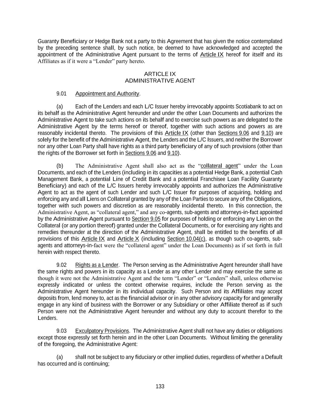 133已发出上句所设想的通知的非本协议当事人的担保受益人或对冲银行,应根据该通知,被视为已承认并接受根据本协议第九条条款为其本身及其附属公司指定的行政代理人,如同其是本协议的“贷款人”一方。第九条行政代理人9.01任命和权限。(a)每一贷款人和每一信用证发行人在此不可撤销地指定丰业银行代表其作为本协议项下和其他贷款文件项下的行政代理人行事,并授权该行政代理人代表其采取行动并行使本协议或其条款授予该行政代理人的权力,以及合理附带的行动和权力。本条第九条的规定(第9.06和9.10条除外)完全是为了行政代理人、贷款人和信用证发行人的利益,借款人或任何其他贷款方均不得享有任何此类规定的第三方受益人权利(第9.06和9.10条规定的借款人权利除外)。(b)行政代理人还应担任贷款文件项下的“抵押代理人”,而每一贷款人(包括以其作为潜在对冲银行、潜在现金管理银行、潜在信用额度银行和潜在特许人贷款融资担保受益人的身份)和每一信用证发行人在此不可撤销地指定并授权行政代理人作为该贷款人和该信用证发行人的代理人,以获取,持有并强制执行任何贷款方为担保任何债务而授予的抵押品上的任何和所有留置权,以及合理附带的权力和酌处权。对此,行政代理人作为“抵押代理人”以及行政代理人根据第9.05条为持有或强制执行根据抵押文件授予的抵押品(或其任何部分)上的任何留置权,或根据行政代理人的指示行使根据该抵押品下的任何权利和补救办法而指定的任何共同代理人、次级代理人和事实上的律师,均有权享有本条第九条和第十条(包括第10.04(c)条,如同这些共同代理人、次级代理人和事实上的律师是贷款文件下的“抵押代理人”)的所有条款的利益,如同本文对此的完整规定一样。9.02作为贷款人的权利。担任本协议项下行政代理人的人,以贷款人身份享有与任何其他贷款人相同的权利和权力,可以行使与其不是行政代理人相同的权利和权力,而“贷款人”或“贷款人”一词,除非另有明确说明或文意另有所指,应包括以个人身份担任本协议项下行政代理人的人。该人士及其附属公司可接受借款人或其任何附属公司或其他附属公司的存款、出借款项、担任财务顾问或任何其他顾问身份,并一般与借款人或其任何附属公司或其他附属公司从事任何种类的业务,犹如该人并非本协议项下的行政代理人一样,亦无任何责任向贷款人交代。9.03开脱罪责的规定。行政代理人除在本文件和其他借款文件中明确规定的以外,不承担任何职责和义务。在不限制前述一般性的情况下,行政代理人:(a)不受任何受托责任或其他默示责任的约束,无论违约是否已经发生并仍在继续;