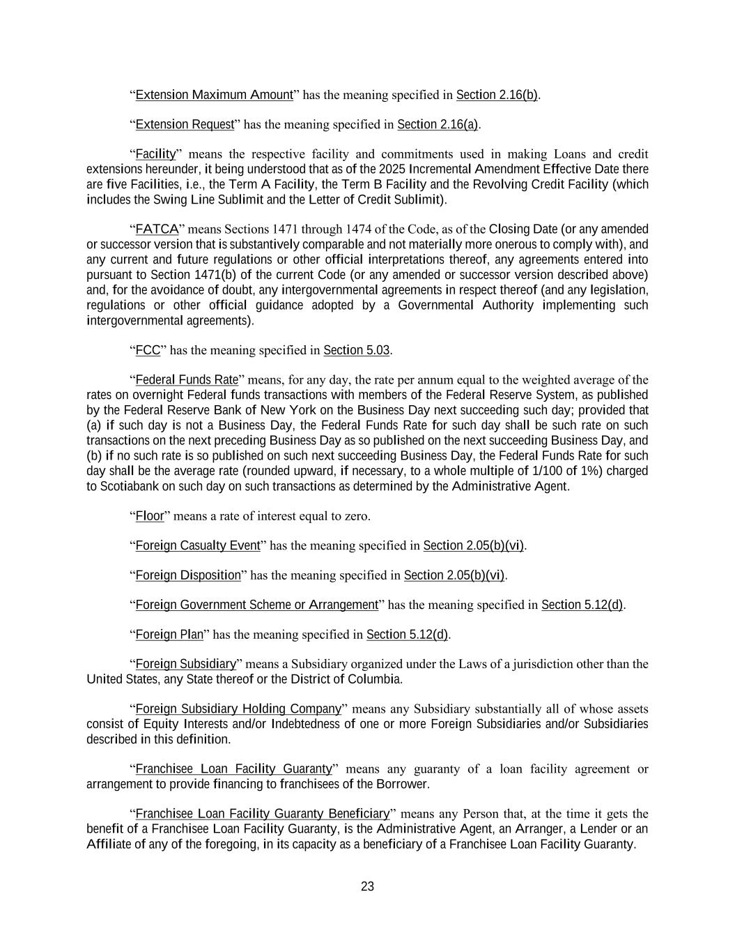 23“延期最高金额”具有第2.16(b)节规定的含义。“延期请求”具有第2.16(a)节规定的含义。“融资”是指在本协议项下进行贷款和信贷展期所使用的各自融资和承诺,据了解,截至2025年增量修正生效日期,共有五项融资,即A期融资、B期融资和循环信贷融资(其中包括周转额度分限额和信用证分限额)。“FATCA”是指截至截止日期的《守则》第1471至1474条(或实质上具有可比性且遵守起来并无实质性更繁重的任何修订或后续版本),以及任何当前和未来的条例或对其的其他官方解释,根据现行《守则》第1471(b)条(或上述任何修订或后续版本)订立的任何协议,以及为免生疑问,与此相关的任何政府间协议(以及实施此类政府间协议的政府当局通过的任何立法、条例或其他官方指南)。“FCC”具有第5.03条规定的含义。“联邦基金利率”是指,在任何一天,等于纽约联邦储备银行在该日下一个营业日公布的与联邦储备系统成员进行的隔夜联邦基金交易利率加权平均数的年利率;但(a)如果该日不是营业日,则该日的联邦基金利率应为在下一个营业日如此公布的前一个营业日的此类交易的利率,(b)如果在下一个营业日没有如此公布此类利率,则该日的联邦基金利率应为行政代理人确定的交易在该日向丰业银行收取的平均费率(如有必要,向上四舍五入至1%的1/100整倍)。“下限”是指利率等于零。“外国伤亡事件”具有第2.05(b)(vi)节规定的含义。“外国处置”具有第2.05(b)(vi)节规定的含义。“外国政府计划或安排”具有第5.12(d)节规定的含义。“外国计划”具有第5.12(d)节规定的含义。“外国子公司”是指根据美国、其任一州或哥伦比亚特区以外的司法管辖区的法律组建的子公司。“外国子公司控股公司”是指任何子公司,其资产基本上全部由一个或多个外国子公司和/或本定义所述子公司的股权和/或债务组成。“加盟商贷款融资担保”是指为向借款人的特许经营商提供融资的贷款融资协议或安排的任何担保。“特许经营商贷款融资担保受益人”是指在获得特许经营商贷款融资担保的利益时,以特许经营商贷款融资担保受益人身份作为上述任何一项的行政代理人、安排人、贷款人或关联机构的任何人。