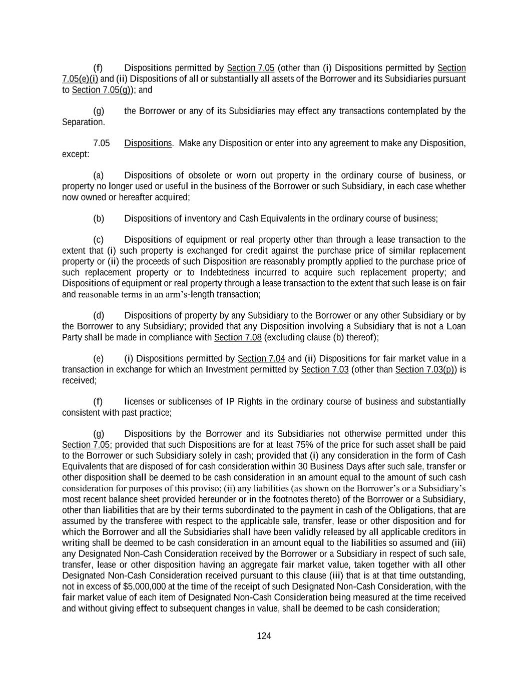 124(f)第7.05条允许的处分(除(i)第7.05(e)(i)条允许的处分和(ii)根据第7.05(g)条处置借款人及其附属公司的全部或基本全部资产外);(g)借款人或其任何附属公司可实施分立所设想的任何交易。7.05处置。作出任何处置或订立任何协议以作出任何处置,但以下情况除外:(a)在正常经营过程中处置过时或磨损的财产,或不再在借款人或该附属公司的业务中使用或有用的财产,在每种情况下,无论是现在拥有的还是以后获得的;(b)在正常业务过程中处置库存和现金等价物;(c)在(i)此类财产以类似置换财产的购买价格换取信贷或(ii)此类处置的收益被合理地迅速用于此类置换财产的购买价格或用于获得此类置换财产所产生的债务的情况下,通过租赁交易处置设备或不动产的情况此类租赁在公平交易中以公平合理的条款进行;(d)任何附属公司对借款人或任何其他附属公司或借款人对任何附属公司的财产处分;但涉及附属公司的任何处分不是贷款方的,应根据第7.08条(不包括其(b)条)作出;(e)(i)第7.04条允许的处置和(ii)在收到第7.03条允许的投资(第7.03(p)条除外)的交换交易中以公平市场价值处置;(f)在正常业务过程中并与过去惯例基本一致的知识产权许可或分许可;(g)借款人及其子公司根据第7.05条未另有许可的处置;规定该等处置至少为该资产价格的75%,应仅以现金方式支付给借款人或该附属公司;但(i)在该出售后30个营业日内以现金对价方式处置的任何现金等价物形式的对价,转让或其他处置应被视为现金对价,金额相当于就本但书而言的该现金对价金额;(ii)借款人或子公司的任何负债(如借款人或子公司根据本协议或其脚注提供的最近资产负债表所示),但根据其条款从属于以现金支付债务的负债,由受让方就适用的出售、转让承担的负债除外,凡借款人及所有附属公司应已获所有适用债权人以书面有效解除的租赁或其他处分,应视为现金代价,金额相等于如此承担的负债,及(iii)借款人或附属公司就该等出售、转让、租赁或其他具有合计公平市场价值的处置而收到的任何指定非现金代价,连同当时根据本条款(iii)收到的所有其他指定非现金代价,在收到此种指定非现金对价时不超过5,000,000美元,且在收到时以每一项指定非现金对价的公允市场价值计量且不影响后续价值变动的情况下,应被视为现金对价;