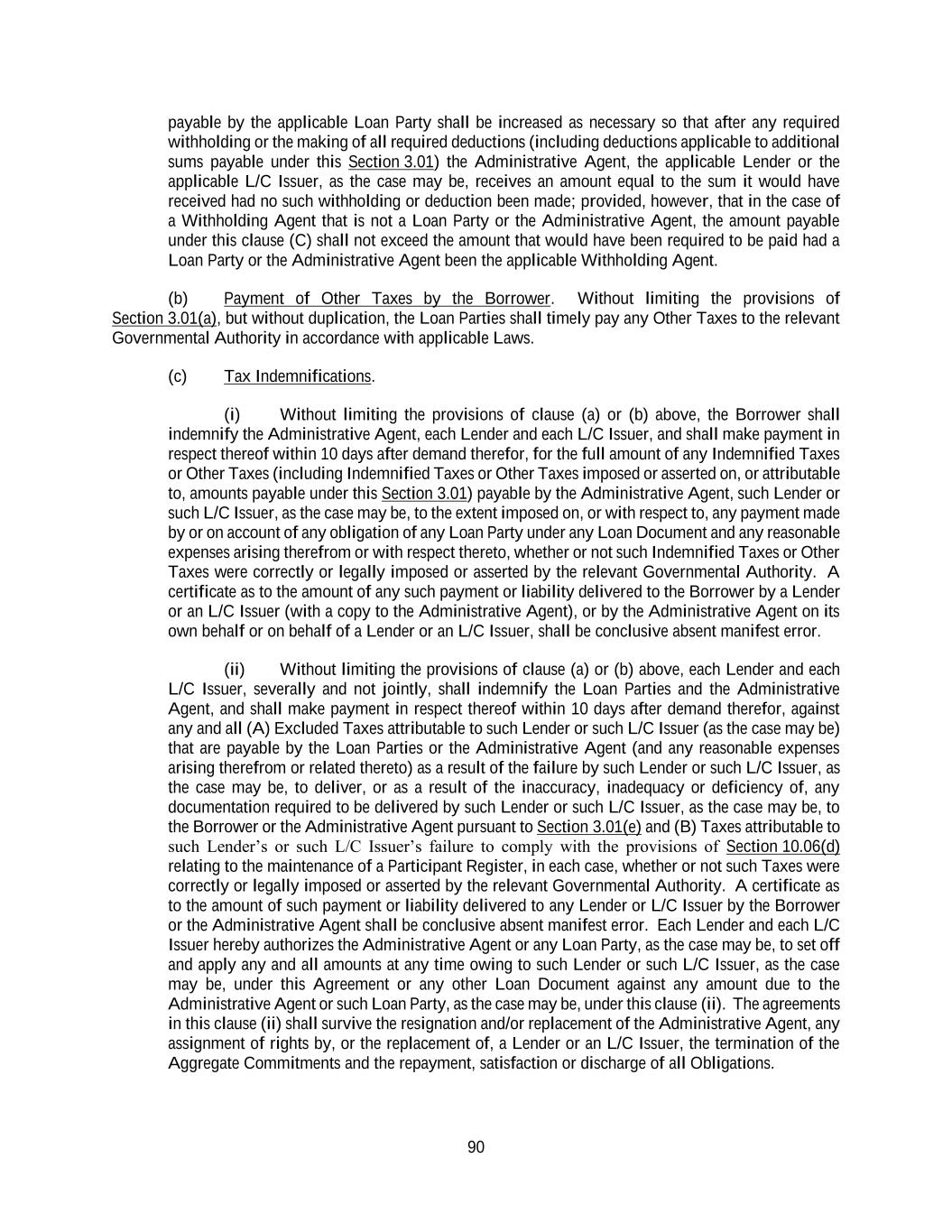 适用的贷款方应付的90应视需要增加,以便在任何规定的预扣或作出所有规定的扣除(包括适用于根据本条第3.01条应付的额外款项的扣除)后,行政代理人、适用的贷款人或适用的信用证发行人(视情况而定)收到的金额等于其在没有进行此种预扣或扣除的情况下本应收到的金额;但条件是,在扣款代理人不是贷款方或行政代理人的情况下,根据本条款(C)应付的金额不得超过如果贷款方或行政代理人是适用的扣缴代理人本应被要求支付的金额。(b)借款人缴纳其他税款。在不限制第3.01(a)节的规定、但不重复的情况下,贷款方应根据适用的法律及时向相关政府当局缴纳任何其他税款。(c)税务赔偿。(i)在不限制上述(a)或(b)条的规定的情况下,借款人须向行政代理人、每名贷款人及每名信用证发行人作出赔偿,并须在提出要求后10天内,就行政代理人、该贷款人或该信用证发行人(视属何情况而定)须支付的任何获弥偿税款或其他税款(包括就根据本条第3.01条规定的应付款项征收或主张征收或可归因于该等应付款项的获弥偿税款或其他税款)的全数,在所施加的范围内或就,任何贷款方根据任何贷款文件所承担的任何义务而作出或因此而作出的任何付款,以及由此产生或与之相关的任何合理开支,不论有关政府当局是否正确或合法地征收或主张此类弥偿税款或其他税款。贷款人或信用证发行人交付给借款人的任何此类付款或负债的金额证明(附一份副本给行政代理人),或由行政代理人代表自己或代表贷款人或信用证发行人交付给借款人的证明,在没有明显错误的情况下,应为结论性证明。(ii)在不限制上述(a)或(b)条条文的规定下,每名贷款人及每名信用证发行人须分别而非共同向贷款方及行政代理人作出赔偿,并须在要求后10天内就有关款项作出支付,以抵销因贷款方或行政代理人的失败而应由贷款方或行政代理人支付的任何及所有(a)可归属于该贷款人或该信用证发行人(视属何情况而定)的除外税款(以及由此产生或与之有关的任何合理开支),(视属何情况而定)根据第3.01(e)及(b)条向借款人或行政代理人交付或由于该等贷款人或该信用证发行人(视属何情况而定)须交付的任何文件的不准确、不充分或不足而交付或由于该等文件的不准确、不充分或不足而交付的任何文件,在每种情况下,不论有关政府当局是否正确或合法地征收或主张征收该等税款,均可归因于该贷款人或该信用证发行人未能遵守第10.06(d)条有关维持参与者名册的规定。借款人或行政代理人交付给任何贷款人或信用证发行人的有关该等付款或责任金额的证明,无明显错误即为结论性证明。每名贷款人及每名信用证发行人特此授权行政代理人或任何贷款方(视属何情况而定)随时根据本协议或任何其他贷款文件抵销及适用根据本条款(ii)项应付该行政代理人或该贷款方(视属何情况而定)的任何款项,以抵销及适用任何及所有款项。本条款(ii)中的约定在行政代理人辞职和/或更换、贷款人或信用证发行人的任何权利转让或更换、合计承诺的终止以及所有义务的偿还、清偿或解除后仍然有效。