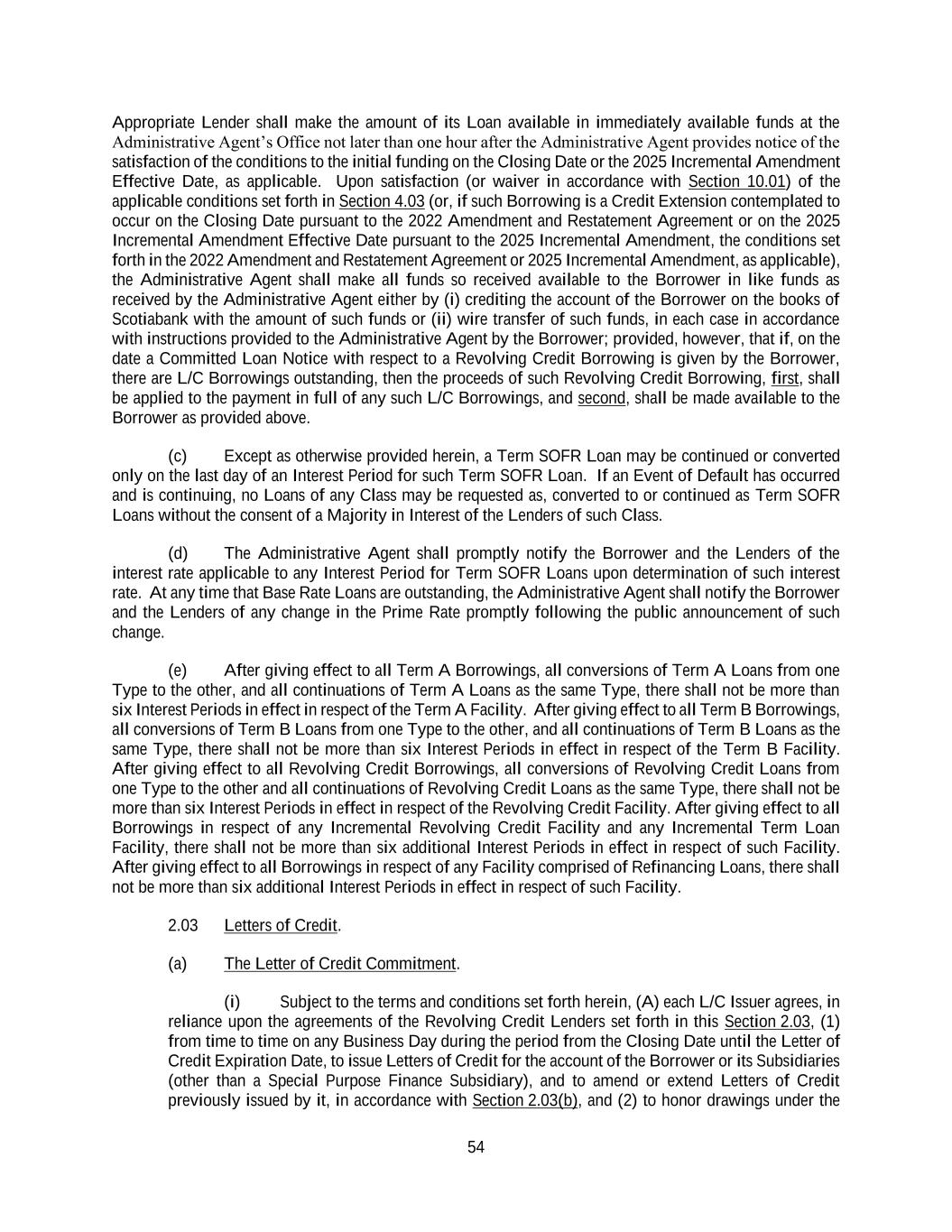 54适当贷款人应不迟于行政代理人在截止日期或适用的2025年增量修正生效日期向初始资金提供条件满足通知后一小时内,在行政代理人办公室以即时可用资金提供其贷款金额。一旦满足(或根据第10.01条放弃)第4.03条规定的适用条件(或者,如果此类借款是根据2022年修订和重述协议在截止日期或根据2025年增量修订生效日期预期发生的信贷展期,则2022年修订和重述协议或2025年增量修订(如适用)中规定的条件),行政代理人应通过以下方式将如此收到的所有资金以行政代理人收到的相同资金提供给借款人:(i)将此种资金的金额记入丰业银行账簿上的借款人账户,或(ii)电汇此种资金,在每种情况下均按照借款人向行政代理人提供的指示;但条件是,如果在借款人就循环信贷借款发出承诺贷款通知之日,有未偿还的信用证借款,然后,此种循环信用借款的收益,第一,应用于全额支付任何此类信用证借款,第二,应按上述规定提供给借款人。(c)除本文另有规定外,定期SOFR贷款只能在该定期SOFR贷款的利息期的最后一天继续或转换。如果违约事件已经发生并且仍在继续,未经此类类别的贷款人的多数利益同意,不得要求将任何类别的贷款作为、转换为或继续作为定期SOFR贷款。(d)行政代理人在确定定期SOFR贷款的任何利息期适用的利率时,应及时通知借款人和贷款人。在任何时候有基准利率贷款未偿还时,行政代理人应在公开宣布最优惠利率变动后立即通知借款人和贷款人。(e)在所有A期借款、A期贷款从一种类型转换为另一种类型以及A期贷款作为同一类型的所有延续生效后,就A期贷款而言,有效的利息期不得超过六个。在所有B期借款、所有B期贷款从一种类型转换为另一种类型以及所有B期贷款作为同一类型的延续生效后,就B期贷款而言,有效的利息期不得超过六个。在所有循环信用借款、所有循环信用贷款从一种类型转换为另一种类型以及所有循环信用贷款作为同一类型的延续生效后,循环信贷融资的有效计息期不得超过六个。在任何增量循环信贷融资和任何增量定期贷款融资的所有借款生效后,就该融资有效的额外利息期不得超过六个。在就由再融资贷款组成的任何融资的所有借款生效后,就该融资有效的额外利息期不得超过六个。2.03信用证。(a)信用证承诺。(i)在符合本条款及条件下,(a)各信用证发行人依据本条第2.03条所载循环信贷贷款人的协议,同意(1)在截止日至信用证到期日期间的任何营业日,不时为借款人或其附属公司(特殊目的融资附属公司除外)开立信用证,并根据第2.03(b)条修订或延长其先前签发的信用证,及(2)根据第