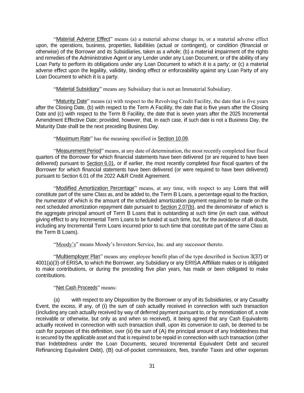 31“重大不利影响”是指(a)借款人及其子公司作为一个整体的运营、业务、财产、负债(实际或或有的)或状况(财务或其他)发生重大不利变化或产生重大不利影响;(b)行政代理人或任何贷款人在任何贷款文件下的权利和补救措施,或任何贷款方履行其作为一方当事人的任何贷款文件下义务的能力发生重大损害;或(c)对合法性、有效性、其作为一方的任何贷款文件对任何贷款方具有约束力或可执行性。“重大附属公司”是指任何不属于非重大附属公司的附属公司。“到期日”是指(a)就循环信贷融资而言,截止日期后五年的日期,(b)就期限A融资而言,截止日期后五年的日期,以及(c)就期限B融资而言,2025年增量修订生效日期后七年的日期;但条件是,在每种情况下,如果该日期不是一个工作日,则到期日应是前一个工作日。“最高额”具有第10.09节规定的含义。“计量期”是指,在任何确定日期,根据第6.01节已交付(或被要求已交付)财务报表的借款人最近完成的四个财政季度,或者如果更早,则是根据2022年A & R信贷协议第6.01节已交付(或被要求已交付)财务报表的借款人最近完成的四个财政季度。“修正摊销百分比”是指,在任何时候,对于将构成与B期贷款相同类别的一部分并将被添加到B期贷款中的任何贷款,一个百分比等于该分数,其分子是根据第2.07(b)节要求在下一个预定摊销偿还日期支付的预定摊销付款的金额,其分母是当时未偿还的B期贷款的本金总额(在每种情况下,不会使在该时间提供资金的任何增量定期贷款生效,但为免生疑问,包括在该时间之前发生的构成与B期贷款相同类别的任何增量定期贷款)。“穆迪”是指穆迪投资者服务公司及其任何继任者。“多雇主计划”是指ERISA第3(37)或4001(a)(3)节所述类型的任何雇员福利计划,借款人、任何子公司或任何ERISA关联公司向其作出或有义务作出供款,或在前五个计划年度内已作出或有义务作出供款。“现金收益净额”是指:(a)就借款人或其任何子公司的任何处置或任何伤亡事件而言,(i)与该交易有关的实际收到的现金总额(包括根据应收票据或其他方式延期付款或通过货币化实际收到的任何现金,但仅限于收到时)的超出部分(如有),经商定,与该交易有关的任何实际收到的现金等价物在转换为现金时,就本定义而言应被视为现金,超过(ii)(a)由适用资产作担保的任何债务的本金金额(贷款文件项下的债务、有担保的增量等值债务和有担保的再融资等值债务除外)的总和,(b)自付佣金、费用、转让税和其他费用