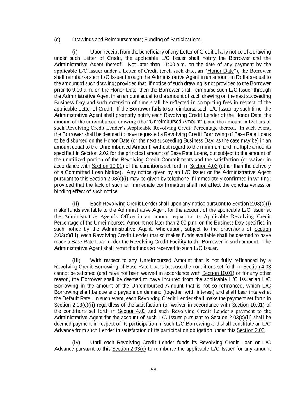 58(c)提款和偿还;参与的资金。(i)在收到任何信用证的受益人根据该信用证提款的任何通知后,适用的信用证开证人应将此通知通知借款人及其行政代理人。不迟于适用的信用证发行人根据信用证进行任何付款之日上午11:00(每个该等日期,一个“到期日”),借款人应通过行政代理人向该信用证发行人偿还金额等于该提款金额的美元;但如未在到期日上午9:00之前向借款人提供该等提款通知,则借款人应通过行政代理人在下一个营业日以等于该提款金额的金额偿还该信用证开证人,且该延长时间应反映在适用信用证的计算费用中。借款人未能在该时间前如此偿付该信用证发行人的,行政代理人应及时将履约日、未偿付的提款金额(“未偿付金额”)以及该循环信贷贷款人适用的循环信贷百分比的美元金额通知各循环信贷贷款人。在这种情况下,借款人应被视为请求在履约日(或随后的下一个营业日,视情况而定)以等于未偿还金额的金额进行基准利率贷款的循环信用借款,而不考虑第2.02节中规定的基准利率贷款本金金额的最低和倍数,但以循环信贷承诺的未使用部分的金额和满足(或根据第10.01节放弃)第4.03节规定的条件(承诺贷款通知的交付除外)为准。信用证签发人或行政代理人依据本条第2.03(c)(i)款发出的任何通知,如立即得到书面确认,可通过电话发出;但如没有立即得到确认,则不影响该通知的结论性或约束力。(ii)每名循环信贷贷款人须在依据第2.03(c)(i)条发出任何通知后,在行政代理人办事处为适用的信用证发行人的帐户提供资金,金额相等于其适用的循环信贷占未偿还金额的百分比,不迟于该行政代理人在该通知所指明的营业日下午2时,据此,在符合第2.03(c)(iii)条规定的情况下,每个如此提供资金的循环信贷贷款人应被视为已根据循环信贷安排向借款人提供了该金额的基准利率贷款。行政代理人应当将如此收到的资金汇给该信用证开证人。(iii)对于因无法满足第4.03条规定的条件(且未根据第10.01条被放弃)或由于任何其他原因而未通过基准利率贷款的循环信用借款完全再融资的任何未偿还金额,借款人应被视为已向适用的信用证发行人发生未如此再融资的未偿还金额金额的信用证借款,该信用证借款应到期并应按要求支付(连同利息),并应按违约率计息。在这种情况下,每个循环信贷贷款人应支付第2.03(c)(ii)节规定的款项,而不论第4.03节规定的条件是否满足(或根据第10.01节放弃),并且该循环信贷贷款人根据第2.03(c)(ii)节为该信用证发行人的账户向行政代理人支付的款项应被视为就其参与该信用证借款而支付的款项,并应构成该贷款人为履行其根据本条第2.03节规定的参与义务而提供的信用证预付款。(四)直至每个循环信贷贷款人根据本条第2.03(c)款为其循环信贷贷款或信用证预付款提供资金,以偿还适用的信用证发行人的任何金额
