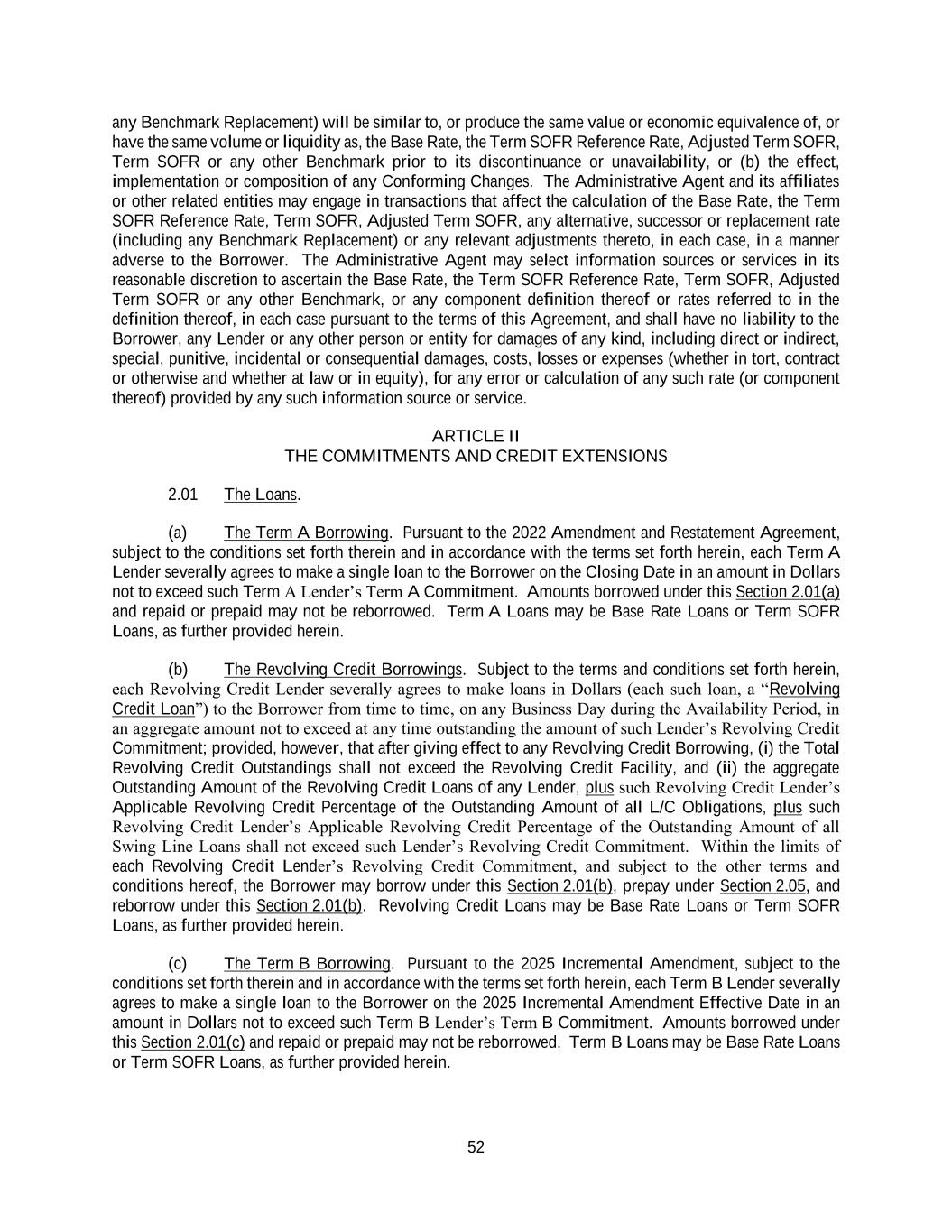 52任何基准替换)将与基本利率、定期SOFR参考利率、调整后的定期SOFR、定期SOFR或任何其他基准在其终止或不可用之前相似,或产生相同的价值或经济等价,或具有相同的数量或流动性,或(b)任何一致变化的效果、实施或组成。行政代理人及其附属机构或其他相关实体可以在每种情况下以对借款人不利的方式从事影响计算基本利率、定期SOFR参考利率、定期SOFR、调整后的定期SOFR、任何替代、继承或替代利率(包括任何基准替代)或对其进行任何相关调整的交易。行政代理人可根据本协议的条款,在其合理的酌处权范围内选择信息来源或服务,以确定基本利率、期限SOFR参考利率、期限SOFR、调整后期限SOFR或任何其他基准,或其任何组成部分定义或其定义中提及的费率,在每种情况下,均不对借款人、任何贷款人或任何其他个人或实体承担任何损害赔偿责任,包括直接或间接、特殊、惩罚性、附带或后果性损害、成本、损失或费用(无论是侵权行为,合同或其他方式,无论是在法律上还是在公平上),针对任何此类信息源或服务提供的任何此类费率(或其组成部分)的任何错误或计算。第二条承诺和信贷展期2.01贷款。(a)期限A借款。根据2022年修订和重述协议,在符合其中规定的条件的情况下,并根据本协议规定的条款,每一期限的贷款人各自同意在截止日期向借款人提供一笔金额为美元的贷款,金额不超过该期限的贷款人的期限A承诺。根据本条第2.01(a)款借入并已偿还或预付的金额不得再借。A期贷款可以是基准利率贷款或定期SOFR贷款,如本文进一步提供的。(b)循环信贷借款。在符合本协议规定的条款和条件的情况下,每个循环信贷贷款人各自同意在可用期内的任何营业日不时向借款人提供美元贷款(每笔此类贷款,“循环信贷贷款”),总金额不超过在任何时候未偿还的该贷款人循环信贷承诺的金额;但条件是,在任何循环信贷借款生效后,(i)循环信贷未偿还总额不得超过循环信贷融资,(ii)任何贷款人的循环信贷贷款的未偿还总额,加上该循环信贷贷款人对所有信用证债务未偿还金额的适用循环信贷百分比,加上该循环信贷贷款人对所有周转额度贷款未偿还金额的适用循环信贷百分比,不得超过该贷款人的循环信贷承诺。在每个循环信贷贷款人的循环信贷承诺的限额内,并在符合本协议其他条款和条件的情况下,借款人可以根据本条第2.01(b)款借款,根据第2.05款预付款项,并根据本条第2.01(b)款再借款。循环信用贷款可以是基本利率贷款或定期SOFR贷款,如本文进一步提供的。(c)B项借款。根据2025年增量修订,在符合其中规定的条件的情况下,并根据此处规定的条款,每个B期贷款人各自同意在2025年增量修订生效日期向借款人提供单笔贷款,金额以美元计,不超过该B期贷款人的B期承诺。根据本条第2.01(c)款借入并已偿还或预付的款项不得再借。B期贷款可以是基准利率贷款或SOFR定期贷款,如本文进一步提供的。
