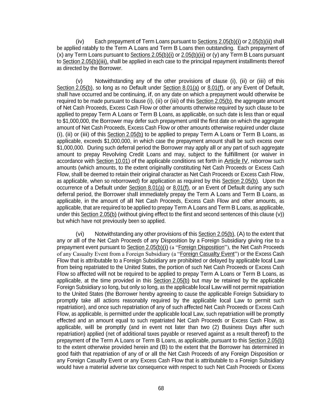 68(iv)根据第2.05(b)(i)或2.05(b)(ii)条提前偿还定期贷款,须按比例适用于当时尚未偿还的A期贷款及B期贷款。根据第2.05(b)(i)或2.05(b)(ii)或(y)条根据第2.05(b)(iii)条进行的(x)任何定期贷款的每笔提前还款,须按借款人的指示在每宗个案中适用于其本金偿还分期。(v)尽管有本条第2.05(b)条第(i)、(ii)或(iii)款的任何其他条文,但只要没有根据第8.01(a)或8.01(f)条发生违约,或任何违约事件,即已发生并仍在继续,但如在根据本条第2.05(b)条第(i)、(ii)或(iii)条原本须作出预付款项的任何日期,则该等条款另有规定须适用于预付A期贷款或B期贷款(如适用)的净现金收益、超额现金流量或其他金额的总额,在该日期少于或等于1,000,000美元时,借款人可将此种提前还款推迟至适用于预付A期贷款或B期贷款(如适用)的本条第(i)、(ii)或(iii)款规定的净现金收益、超额现金流量或其他金额总额超过1,000,000美元的第一个日期,在这种情况下,提前还款金额应为超过1,000,000美元的超额部分。在该延期期间,借款人可将该总额的全部或任何部分用于预付循环信用贷款,并可在满足(或根据第10.01节豁免)第四条规定的适用条件的情况下,将该等金额(该金额,在最初构成现金收益净额或超额现金流量的范围内,应被视为在如此重新借出时保留其作为现金收益净额或超额现金流量(如适用)的原始性质)按照本条第2.05(b)款的要求申请。一旦发生第8.01(a)或8.01(f)节规定的违约,或在任何此类延期期间发生违约事件,借款人应立即预付A期贷款和B期贷款(如适用)的金额,金额为根据本条第2.05(b)节规定的所有现金收益净额、超额现金流量和适用于预付A期贷款和B期贷款的其他金额(如适用),但以前未如此适用的金额(不影响本条款(v)的第一句和第二句)。(vi)尽管有本条第2.05(b)、(a)条的任何其他规定,但在外国子公司根据第2.05(b)(i)条引起预付款事件的任何处置的任何或全部现金收益净额、外国子公司的任何伤亡事件的现金收益净额(“外国伤亡事件”)或归属于外国子公司的超额现金流量被适用的当地法律禁止或延迟汇回美国的情况下,受此影响的这类净现金收益或超额现金流部分将不需要在本节2.05(b)规定的时间(如适用)用于预付A期贷款或B期贷款,但可由适用的外国子公司保留很长时间,但仅限于适用的当地法律不允许汇回美国(借款人在此同意促使适用的外国子公司迅速采取适用的当地法律合理要求的一切行动以允许汇回),一旦根据适用的当地法律允许将任何此类受影响的净现金收益或超额现金流量(如适用)汇回,则将立即进行此类汇回,并将立即(如果不迟于此类汇回后的两(2)个工作日)将相当于此类汇回的净现金收益或超额现金流量的金额(如适用)应用于A期贷款或B期贷款的提前还款(如适用)(扣除因此而应付或预留的额外税款),根据本条第2.05(b)款,在本条另有规定的范围内和(b)款的范围内,借款人已善意地确定,汇回任何外国处置或任何外国伤亡事件的任何或所有净现金收益或任何可归属于外国子公司的任何超额现金流量将对此种净现金收益或超额产生重大不利的税务后果