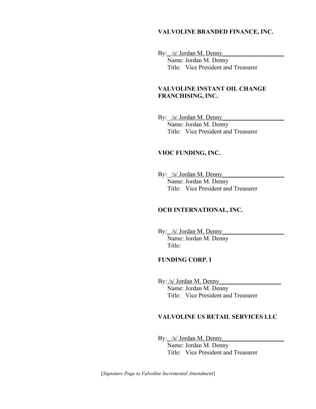 [ Valvoline增量修正的签名页] Valvoline Branded Finance,INC。作者:_/s/Jordan M. Denny __________________姓名:Jordan M. Denny职务:副总裁兼财务主管VALVOLINE INSTANT Oil CHANGE FRANCHISING,INC。作者:_/s/Jordan M. Denny __________________姓名:Jordan M. Denny职务:副总裁兼财务主管VIOC Funding,INC。作者:_/s/Jordan M. Denny __________________姓名:Jordan M. Denny职务:副总裁兼财务主管OCH INTERNATIONAL,INC。作者:_/s/Jordan M. Denny __________________姓名:Jordan M. Denny职务:Funding CORP。I by:/s/Jordan M. Denny __________________ Name:Jordan M. Denny Title:Vice President and Treasurer VALVOLINE US RETAIL SERVICES LLC by:_/s/Jordan M. Denny __________________ Name:Jordan M. Denny Title:Vice President and Treasurer