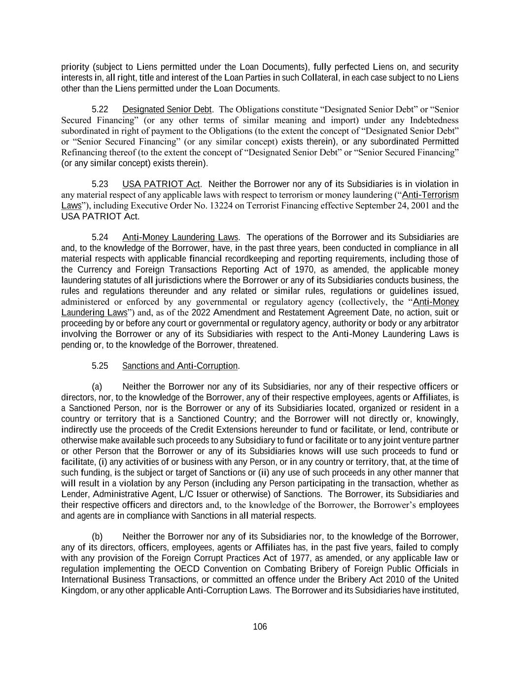 106优先权(以贷款文件允许的留置权为准),充分完善了对此类担保物上贷款方的所有权利、所有权和权益的留置权和担保权益,在每种情况下均不受贷款文件允许的留置权以外的留置权的限制。5.22指定优先债务。该等债务构成该等债务的受偿权次级债务项下的“指定优先债务”或“优先担保融资”(或任何其他类似含义和进口的术语)(以其中存在“指定优先债务”或“优先担保融资”(或任何类似概念)的范围内),或其任何次级许可再融资(以其中存在“指定优先债务”或“优先担保融资”(或任何类似概念)的范围内)。5.23美国爱国者法案。借款人及其任何子公司均未在任何重大方面违反与恐怖主义或洗钱有关的任何适用法律(“反恐怖主义法”),包括2001年9月24日生效的关于恐怖主义融资的第13224号行政命令和《美国爱国者法》。5.24反洗钱法。借款人及其子公司的业务在所有重大方面均符合适用的财务记录保存和报告要求,包括经修订的1970年《货币和外国交易报告法》、借款人或其任何子公司开展业务的所有法域的适用洗钱法规、根据这些法规制定的规则和条例以及任何政府或监管机构发布、管理或执行的任何相关或类似的规则、条例或准则(统称,“反洗钱法”)以及截至2022年修订和重述协议日期,任何法院或政府或监管机构、当局或机构或任何仲裁员就反洗钱法提出的或在其面前提出的诉讼、诉讼或程序均未待决,或据借款人所知,威胁。5.25制裁和反腐败。(a)借款人或其任何附属公司,或其各自的任何高级职员或董事,或据借款人所知,其各自的任何雇员、代理人或关联公司,均不是受制裁的人,借款人或其任何附属公司也不位于、组织或居住在属于受制裁国家或地区;且借款人不会直接或在知情的情况下间接使用本协议项下的信贷展期收益为其提供资金或便利,或出借,向任何附属公司提供或以其他方式提供该等收益,以资助或便利或向任何合营伙伴或借款人或其任何附属公司知道将使用该等收益资助或便利的其他人,(i)与任何人或在任何国家或地区的任何活动或业务,而该等活动或业务在提供该等资金时是制裁的对象或目标,或(ii)以任何其他方式使用该等收益将导致任何人(包括参与交易的任何人,不论是否作为贷款人,行政代理人、信用证签发人或其他)的制裁。借款人、其子公司及其各自的高级管理人员和董事,以及据借款人所知,借款人的雇员和代理人在所有重大方面都遵守了制裁。(b)在过去五年中,借款人或其任何子公司,或据借款人所知,其任何董事、高级职员、雇员、代理人或关联公司均未遵守经修订的1977年《外国腐败行为法》的任何规定,或执行《经合组织关于打击国际商业交易中贿赂外国公职人员的公约》的任何适用法律或条例,或犯下了《2010年反贿赂法》或任何其他适用的反腐败法规定的罪行。借款人及其子公司已制定、
