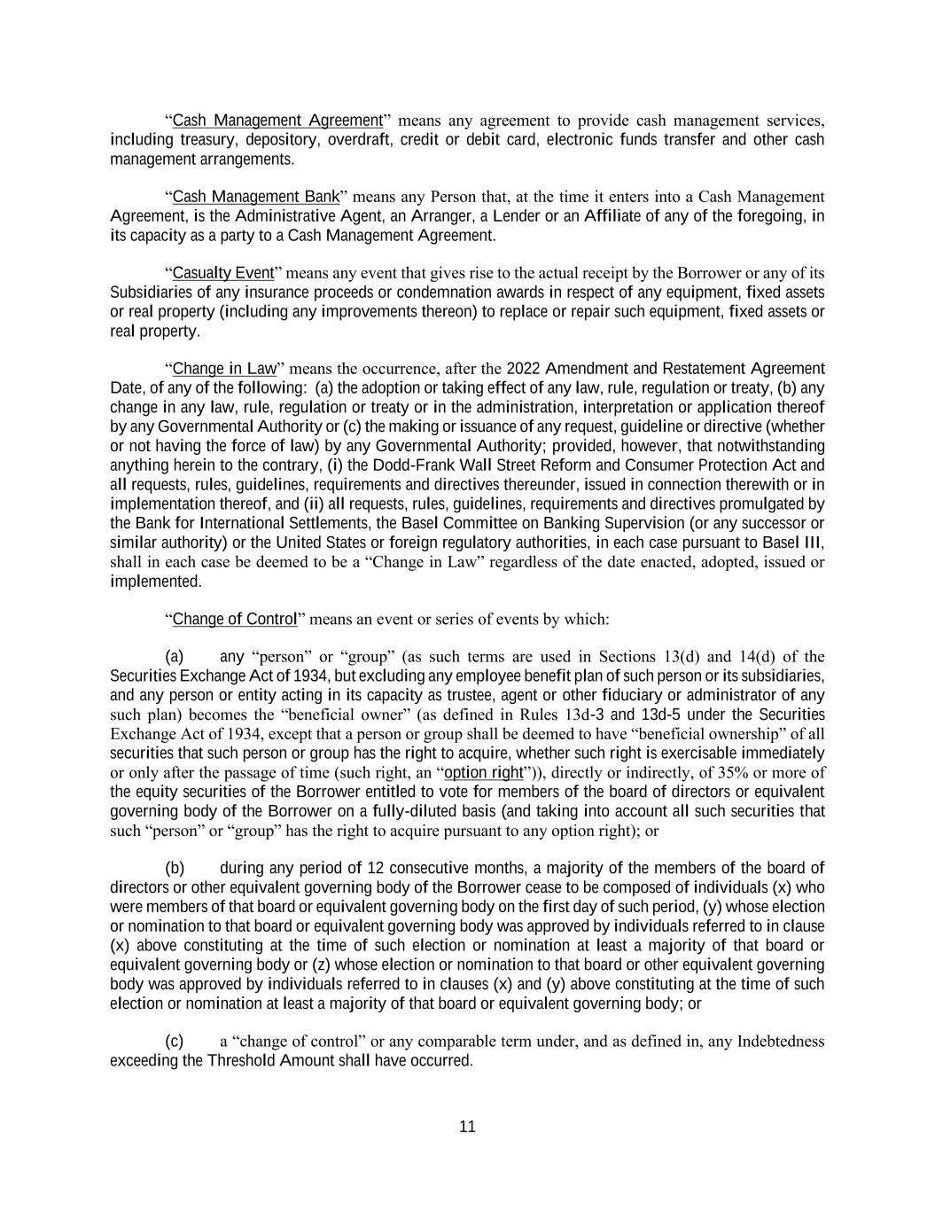 11“现金管理协议”是指提供现金管理服务的任何协议,包括金库、存管、透支、信用卡或借记卡、电子资金转账及其他现金管理安排。“现金管理银行”是指在其订立现金管理协议时,以其作为现金管理协议一方的身份作为上述任何一项的行政代理人、安排人、贷款人或关联机构的任何人。“伤亡事件”是指任何导致借款人或其任何子公司实际收到与任何设备、固定资产或不动产(包括其上的任何改进)有关的任何保险收益或谴责赔偿以更换或修理该等设备、固定资产或不动产的任何事件。“法律变更”是指在2022年修订和重述协议日期之后发生以下任何情况:(a)任何法律、规则、条例或条约的通过或生效,(b)任何法律、规则、条例或条约或任何政府当局对其行政、解释或适用的任何变更,或(c)任何政府当局提出或发布任何请求、准则或指令(无论是否具有法律效力);但是,条件是,尽管本文有任何相反的规定,(i)《多德-弗兰克华尔街改革和消费者保护法》及其下的所有请求、规则、指南、要求和指令,与之相关或在其实施中发布,以及(ii)国际清算银行、巴塞尔银行监管委员会(或任何后续或类似机构)或美国或外国监管机构根据《巴塞尔协议III》颁布的所有请求、规则、指南、要求和指令,在每种情况下,无论颁布、通过、发布或实施的日期如何,均应被视为“法律变更”。“控制权变更”是指:(a)任何“个人”或“团体”(如1934年《证券交易法》第13(d)条和第14(d)条所使用的术语,但不包括该个人或其子公司的任何员工福利计划,以及以受托人、代理人或任何此类计划的其他受托人或管理人身份行事的任何个人或实体)成为“受益所有人”(如1934年《证券交易法》第13d-3条和第13d-5条所定义,除非一个人或团体应被视为对该个人或团体有权取得的所有证券拥有“实益所有权”,无论该权利是立即行使还是仅在时间流逝后才能行使(该权利,“期权权”),直接或间接,借款人有权在完全稀释的基础上投票选举借款人的董事会或同等理事机构成员的股本证券的35%或以上(并考虑到该“人”或“集团”根据任何期权权利有权获得的所有此类证券);或(b)在连续12个月的任何期间内,借款人的董事会或其他同等理事机构的多数成员不再由在该期限的第一天担任该董事会或同等理事机构成员的个人(x)组成,(y)其对该董事会或同等理事机构的选举或提名获上文(x)条提述的个人批准,在该选举或提名时构成该董事会或同等理事机构的至少过半数,或(z)其对该董事会或其他同等理事机构的选举或提名获上文(x)及(y)条提述的个人批准,在该选举或提名时构成该董事会或同等理事机构的至少过半数;或(c)“控制权变更”或任何类似条款,并且如中所定义,任何超过阈值金额的债务应已发生。