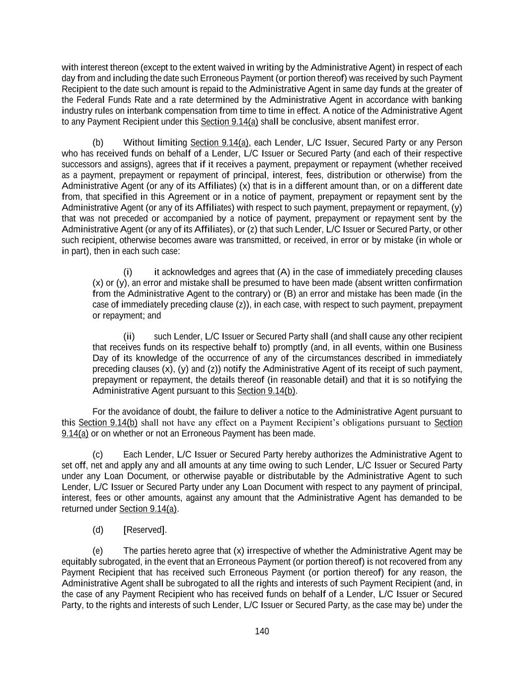 140连利息(行政代理人书面放弃的范围除外)自该付款受让人收到该错误付款(或其部分)之日起计的每一天,直至该款项按联邦基金利率和行政代理人根据不时生效的银行业同业代偿规则确定的利率两者中较高者于当日资金偿还给行政代理人之日止。行政代理人根据本条第9.14(a)款向任何付款受款人发出的通知应为结论性通知,无明显错误。(b)在不限制第9.14(a)节的情况下,每一贷款人、信用证发行人、担保方或代表贷款人、信用证发行人或担保方(及其各自的继承人和受让人)收到资金的任何人(及其各自的继承人和受让人)同意,如果其从行政代理人(或其任何关联机构)(x)收到的金额与本协议或付款通知中规定的金额不同或日期不同的付款、预付款或还款(无论是作为付款、预付款或偿还本金、利息、费用、分配或其他方式而收到的款项、预付款或还款),行政代理人(或其任何关联机构)就该等付款、预付款或还款发送的预付款或还款,(y)未在行政代理人(或其任何关联机构)发送的付款、预付款或还款通知之前或随附的,或(z)该等贷款人、信用证发行人或担保方或其他该等接收方以其他方式知悉已错误(全部或部分)传送或收到,则在每一此种情况下:(i)其承认并同意(a)在紧接前述第(x)或(y)条的情况下,应推定已作出错误和错误(未得到行政代理人的相反书面确认)或(b)已作出错误和错误(在紧接前一款(z)项的情况下),在每种情况下,就该等付款、预付款或还款而言;及(ii)该贷款人、信用证发行人或有担保方应(并应促使代表其各自收取资金的任何其他收款人)迅速(并在所有情况下,在其知悉发生紧接前一款(x)项所述任何情况的一个营业日内,(y)及(z))通知行政代理人其已收到该等付款、预付款项或还款、其详情(以合理的详细资料),而该行政代理人现已根据本条第9.14(b)款如此通知该行政代理人。为免生疑问,未依据本条第9.14(b)款向行政代理人交付通知,不对付款接受方依据第9.14(a)款承担的义务或是否已作出错误付款产生任何影响。(c)每名贷款人、信用证发行人或有担保方特此授权行政代理人根据任何贷款文件抵销、净额及在任何时间适用欠该贷款人、信用证发行人或有担保方的任何及所有款项,或行政代理人根据任何贷款文件就任何本金、利息、费用或其他款项的支付而须向该贷款人、信用证发行人或有担保方支付或分配的其他款项,抵销行政代理人根据第9.14(a)条要求退还的任何款项。(d)[保留]。(e)双方同意,(x)无论行政代理人是否可以公平代位权,在因任何原因未能向已收到该错误付款(或其部分)的任何付款受让人追回错误付款(或其部分)的情况下,行政代理人应代位行使该付款受让人的所有权益(如任何付款受让人已代表贷款人、信用证发行人或担保方收到资金,则代位行使该贷款人、信用证发行人或担保方的权益,视情况而定)根据