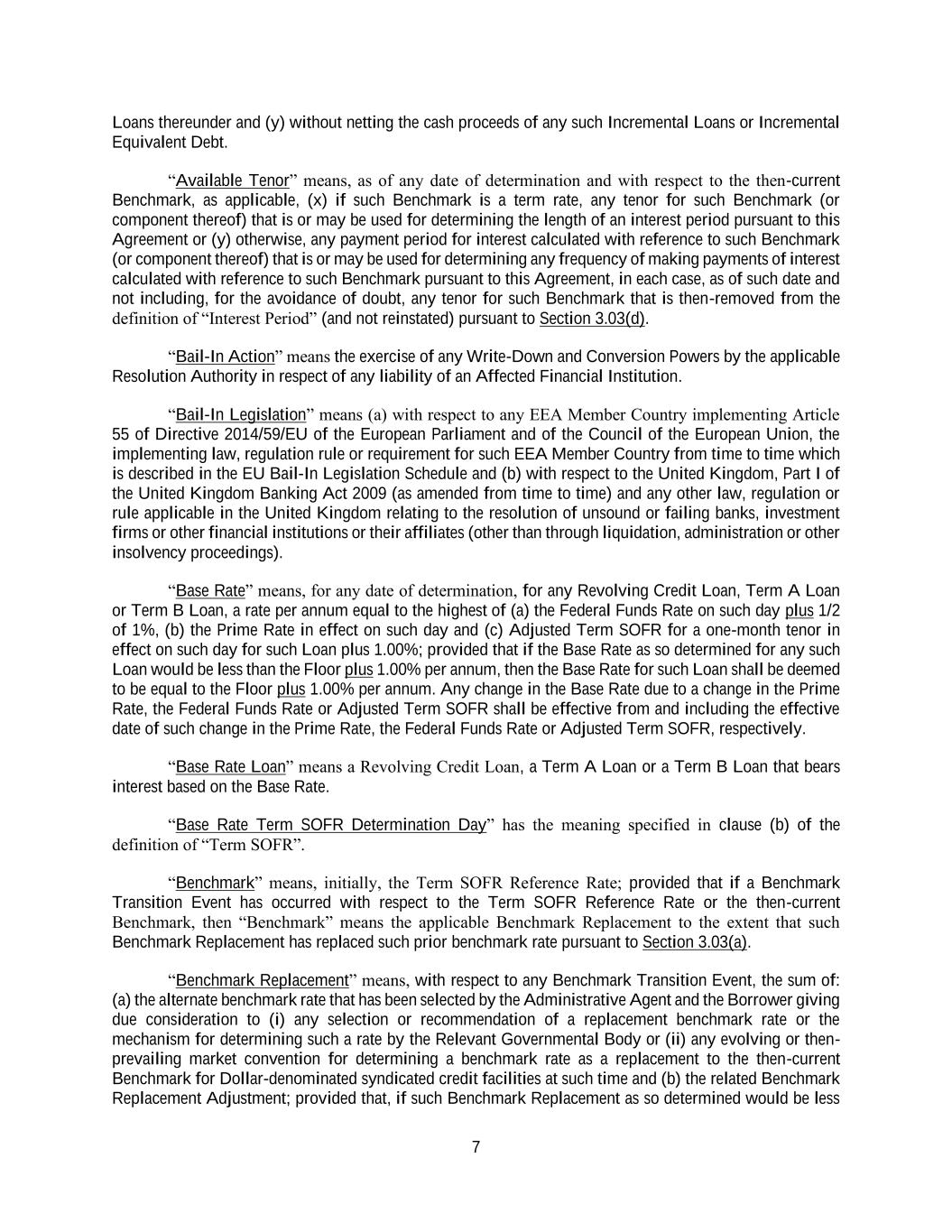 7项下的贷款和(y)不对任何此类增量贷款或增量等值债务的现金收益进行净额结算。“可用期限”是指,截至任何确定日期,就当时适用的基准而言,(x)如果该基准为定期利率,则该基准(或其组成部分)的任何期限,即目前或可能用于根据本协议确定利息期长度的任何期限,或(y)其他情况下,参照该基准(或其组成部分)计算的任何利息支付期,在每种情况下,目前或可能用于确定参照该基准计算的利息支付的任何频率,截至该日期,为免生疑问,不包括根据第3.03(d)节从“利息期”定义中删除(且未恢复)的该基准的任何期限。“纾困行动”是指适用的处置当局就受影响金融机构的任何负债行使任何减记和转换权力。“纾困立法”是指(a)就执行欧洲议会和欧盟理事会第2014/59/EU号指令第55条的任何欧洲经济区成员国而言,欧盟纾困立法附表中不时描述的对该欧洲经济区成员国的实施法律、法规规则或要求,以及(b)就英国而言,《2009年英国银行法》(不时修订)第一部分以及在英国适用的与解决不健全或破产银行有关的任何其他法律、法规或规则,投资公司或其他金融机构或其关联机构(通过清算、管理或其他破产程序除外)。“基准利率”是指,就任何确定日期而言,对于任何循环信用贷款、A期贷款或B期贷款,年利率等于(a)该日的联邦基金利率加上1%的1/2,(b)该日有效的最优惠利率,以及(c)该贷款在该日有效的一个月期限的调整后期限SOFR加上1.00%;前提是,如果如此确定的任何此类贷款的基准利率将低于下限加上每年1.00%,然后,此类贷款的基准利率应被视为等于最低利率加上每年1.00%。由于最基本利率、联邦基金利率或调整后期限SOFR的变化而导致的基准利率的任何变化应分别自并包括最基本利率、联邦基金利率或调整后期限SOFR的此类变化生效之日起生效。“基准利率贷款”是指以基准利率计息的循环信用贷款、A期贷款或B期贷款。“基准利率期限SOFR确定日”具有“期限SOFR”定义(b)条规定的含义。“基准”最初是指长期SOFR参考利率;前提是,如果就长期SOFR参考利率或当时的基准发生了基准过渡事件,那么“基准”是指适用的基准替换,只要此种基准替换已根据第3.03(a)节取代此种先前的基准利率。“基准替代”是指,就任何基准过渡事件而言,以下各项之和:(a)行政代理人和借款人在适当考虑(i)任何替代基准利率的选择或建议或相关政府机构确定此类利率的机制或(ii)任何正在演变或当时流行的确定基准利率以替代当时美元计价银团信贷便利的现行基准的市场惯例和(b)相关的基准替代调整的情况下选择的替代基准利率;但前提是,如果如此确定的这种基准更替会更少