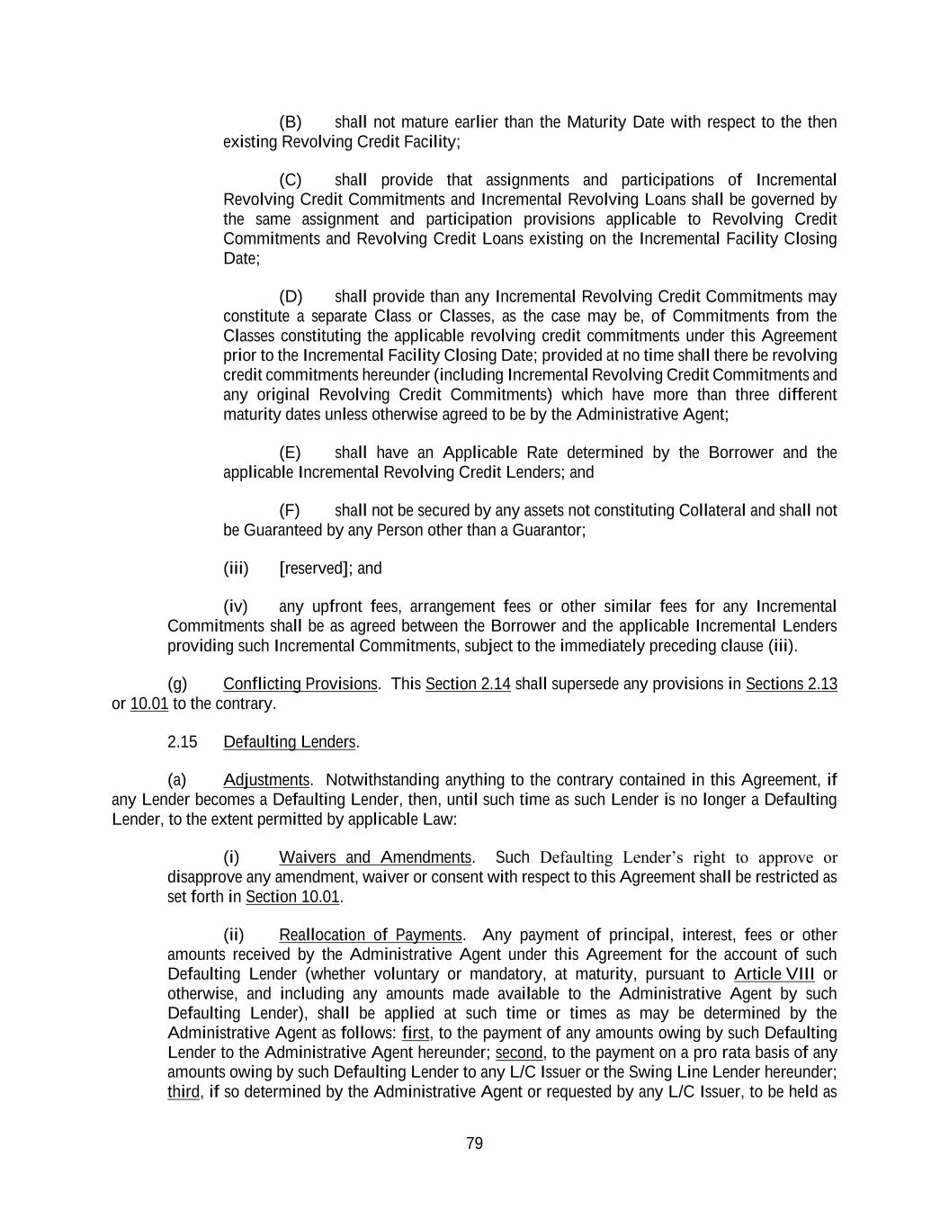 79(b)不得早于当时存在的循环信贷融资的到期日到期;(c)应规定,增量循环信贷承诺和增量循环贷款的转让和参与应受适用于增量融资截止日存在的循环信贷承诺和循环信贷贷款的相同转让和参与条款的管辖;(d)应提供比任何增量循环信贷承诺可能构成一个或多个单独类别(视情况而定),增量融资截止日之前构成本协议项下适用循环信贷承诺的类别的承诺;条件是除非行政代理人另有约定,本协议项下任何时候都不得有超过三个不同到期日的循环信贷承诺(包括增量循环信贷承诺和任何原始循环信贷承诺);(e)应有借款人和适用的增量循环信贷放款人确定的适用利率;(f)不得以不构成抵押品的任何资产作担保且不得由担保人以外的任何人提供担保;(iii)[保留];及(iv)任何增量承诺的任何预付费用、安排费或其他类似费用,应由借款人与提供该等增量承诺的适用增量贷款人之间商定,但须遵守前一条款(iii)。(g)相互冲突的规定。本条第2.14条取代第2.13或10.01条中相反的任何条文。2.15违约贷款人。(a)调整。尽管本协议中有任何相反的规定,如果任何贷款人成为违约贷款人,那么,在该贷款人不再是违约贷款人之前,在适用法律允许的范围内:(i)豁免和修订。这类违约贷款人批准或不批准与本协议有关的任何修改、放弃或同意的权利应受到第10.01节规定的限制。(二)重新分配付款。行政代理人根据本协议为该违约贷款人的账户收到的任何本金、利息、费用或其他款项(不论是自愿或强制性的、到期时、根据第八条或其他规定,包括该违约贷款人向该行政代理人提供的任何款项),应适用于行政代理人可能确定的以下时间:第一,支付该违约贷款人根据本协议欠该行政代理人的任何款项;第二,按比例支付该违约贷款人欠本协议项下任何信用证发行人或周转线贷款人的任何款项;第三,如经行政代理人如此确定或任何信用证发行人要求,须作为