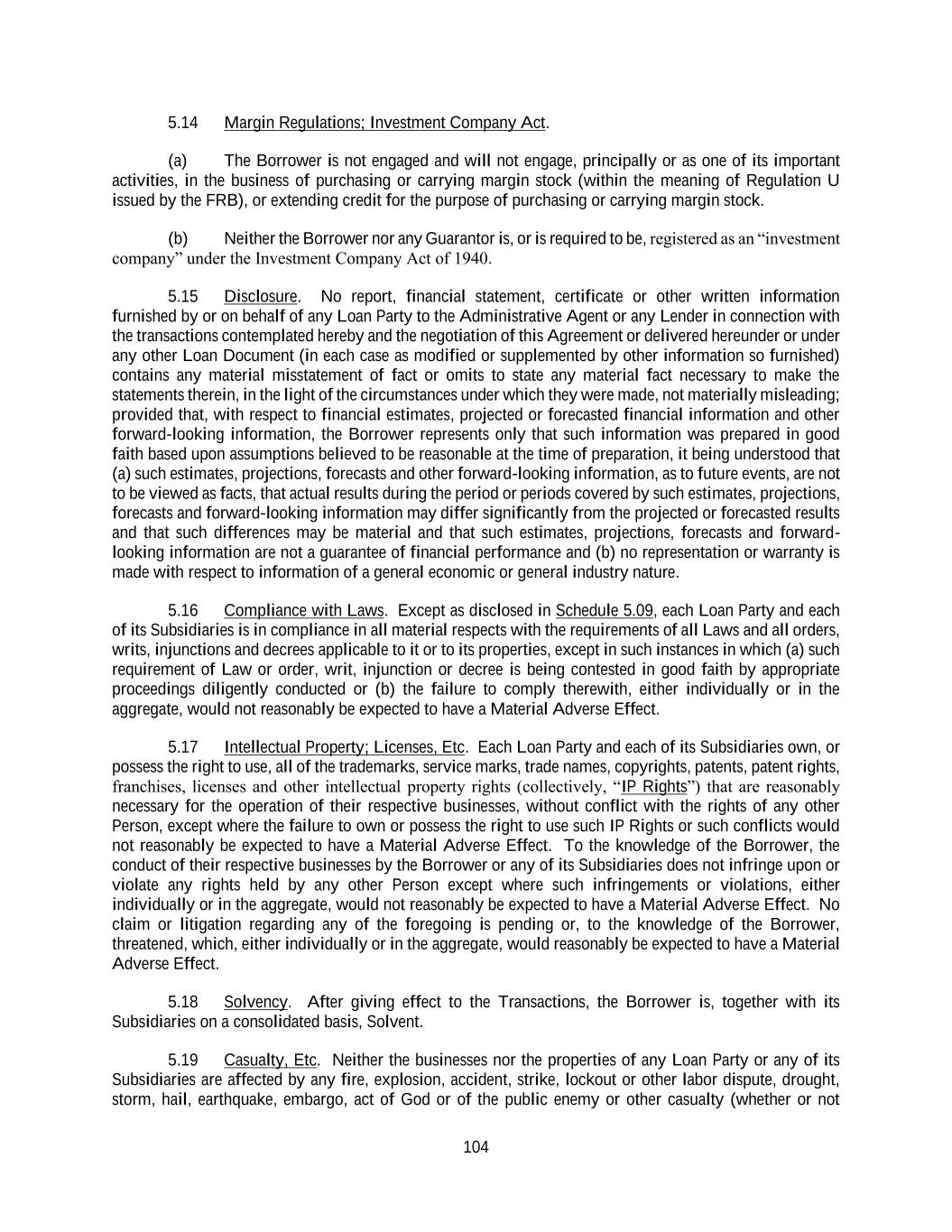 1045.14保证金条例;投资公司法。(a)借款人没有从事也不会主要或作为其重要活动之一从事购买或持有保证金股票的业务(在FRB发布的U条例的含义内),或为购买或持有保证金股票的目的提供信贷。(b)借款人或任何担保人均未根据1940年《投资公司法》注册为或被要求注册为“投资公司”。5.15披露。任何贷款方或代表任何贷款方就本协议所设想的交易和本协议的谈判向行政代理人或任何贷款人提供的报告、财务报表、证书或其他书面资料,或根据本协议或根据任何其他贷款文件(在每种情况下均经如此提供的其他信息修改或补充)交付的报告、财务报表、证书或其他书面资料,均不包含任何重大的事实错报,或根据作出这些陈述所需的任何重大事实,而不是重大误导;但前提是,关于财务估计、预计或预测的财务信息和其他前瞻性信息,借款人仅表示此类信息是根据编制时认为合理的假设善意编制的,但有一项理解,即(a)此类估计、预测、预测和其他前瞻性信息,关于未来事件,不应被视为事实,此类估计、预测、预测和前瞻性信息所涵盖的期间或期间的实际结果可能与预测或预测结果存在显着差异,并且此类差异可能是重大的,并且此类估计,预测、预测和前瞻性信息不是财务业绩的保证,(b)对于一般经济或一般行业性质的信息不作任何陈述或保证。5.16遵守法律。除附表5.09所披露的情况外,每一贷款方及其每一附属公司在所有重大方面均遵守适用于其或其财产的所有法律和所有命令、令状、强制令和法令的要求,但(a)此类法律或命令、令状、强制令或法令的要求正受到勤勉进行的适当程序的善意质疑,或(b)未能单独或总体遵守这些要求,不会合理地预期会产生重大不利影响的情况除外。5.17知识产权;许可证等。每一贷款方及其每一子公司拥有或拥有对各自业务运营合理必要的所有商标、服务标记、商号、版权、专利、专利权、特许经营权、许可和其他知识产权(统称“知识产权”)的使用权,不与任何其他人的权利发生冲突,除非未能拥有或拥有使用此类知识产权的权利或此类冲突不会被合理地预期会产生重大不利影响。据借款人所知,借款人或其任何子公司开展各自的业务并不侵犯或侵犯任何其他人所持有的任何权利,除非此类侵权或违规行为(无论是单独的还是总体的)不会被合理地预期会产生重大不利影响。关于上述任何一项的任何索赔或诉讼都没有待决,或者据借款人所知,没有受到威胁,这些索赔或诉讼无论是个别的还是总体的,都可以合理地预期会产生重大的不利影响。5.18偿债能力。在交易生效后,借款人连同其在综合基础上的附属公司具有偿付能力。5.19伤亡等。任何贷款方或其任何附属公司的业务或财产均不受任何火灾、爆炸、事故、罢工、停工或其他劳资纠纷、干旱、风暴、冰雹、地震、禁运、天灾或公敌的行为或其他伤亡(不论是否