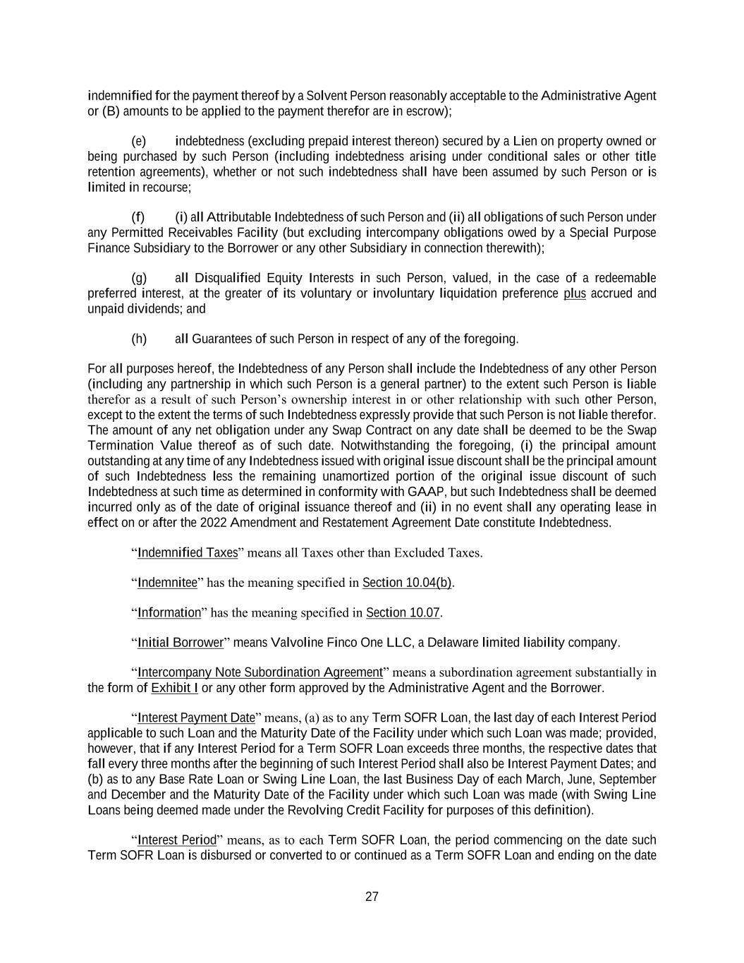 27因行政代理人合理接受的偿付能力人的偿付而获得赔偿或(b)将适用于偿付的金额处于托管状态);(e)由该人拥有或正在购买的财产的留置权担保的债务(不包括预付利息)(包括根据有条件销售或其他所有权保留协议产生的债务),不论该等债务是否已由该人承担或追索权有限;(f)(i)该人的所有应占债务及(ii)该人在任何许可应收款项融资下的所有义务(但不包括特殊目的融资附属公司欠借款人或与此有关的任何其他附属公司的公司间义务);(g)该人的所有不合格股权,在可赎回优先权益的情况下估值,以其自愿或非自愿清算优先权加上应计和未支付的股息中的较大者为准;及(h)该人就上述任何一项作出的所有担保。就本协议所有目的而言,任何人的债务应包括任何其他人(包括该人作为普通合伙人的任何合伙企业)的债务,但该人因该人在该其他人中的所有权权益或与该其他人的其他关系而对该债务承担责任的范围除外,但该债务的条款明确规定该人不对此承担责任的范围除外。任何日期的任何掉期合约项下的任何净债务的金额应被视为截至该日期的掉期终止价值。尽管有上述规定,(i)以原始发行折扣发行的任何债务在任何时间的未偿还本金金额应为该债务的本金金额减去在按照公认会计原则确定的时间该债务的原始发行折扣的剩余未摊销部分,但该债务仅应被视为在其原始发行日期发生,并且(ii)在任何情况下,在2022年修订和重述协议日期或之后生效的任何经营租赁均不构成债务。“补税”是指除排除税以外的所有税种。“受偿人”具有第10.04(b)节规定的含义。“信息”具有第10.07节规定的含义。“初始借款人”是指美国特拉华州有限责任公司Valvoline Finco One LLC。“公司间票据从属协议”是指实质上以附件 I形式或经行政代理人和借款人批准的任何其他形式的从属协议。“利息支付日”是指,(a)就任何定期SOFR贷款而言,适用于该贷款的每个利息期的最后一天,以及作出该贷款所依据的融资的到期日;但条件是,如果定期SOFR贷款的任何利息期超过三个月,则该利息期开始后每三个月的相应日期也应为利息支付日;(b)就任何基准利率贷款或周转额度贷款而言,每年3月、6月的最后一个营业日,9月和12月以及提供此类贷款所依据的融资的到期日(为本定义的目的,周转额度贷款被视为根据循环信贷融资提供)。“利息期”是指,就每笔定期SOFR贷款而言,自该定期SOFR贷款发放或转换为或继续作为定期SOFR贷款之日起至该日期止的期间