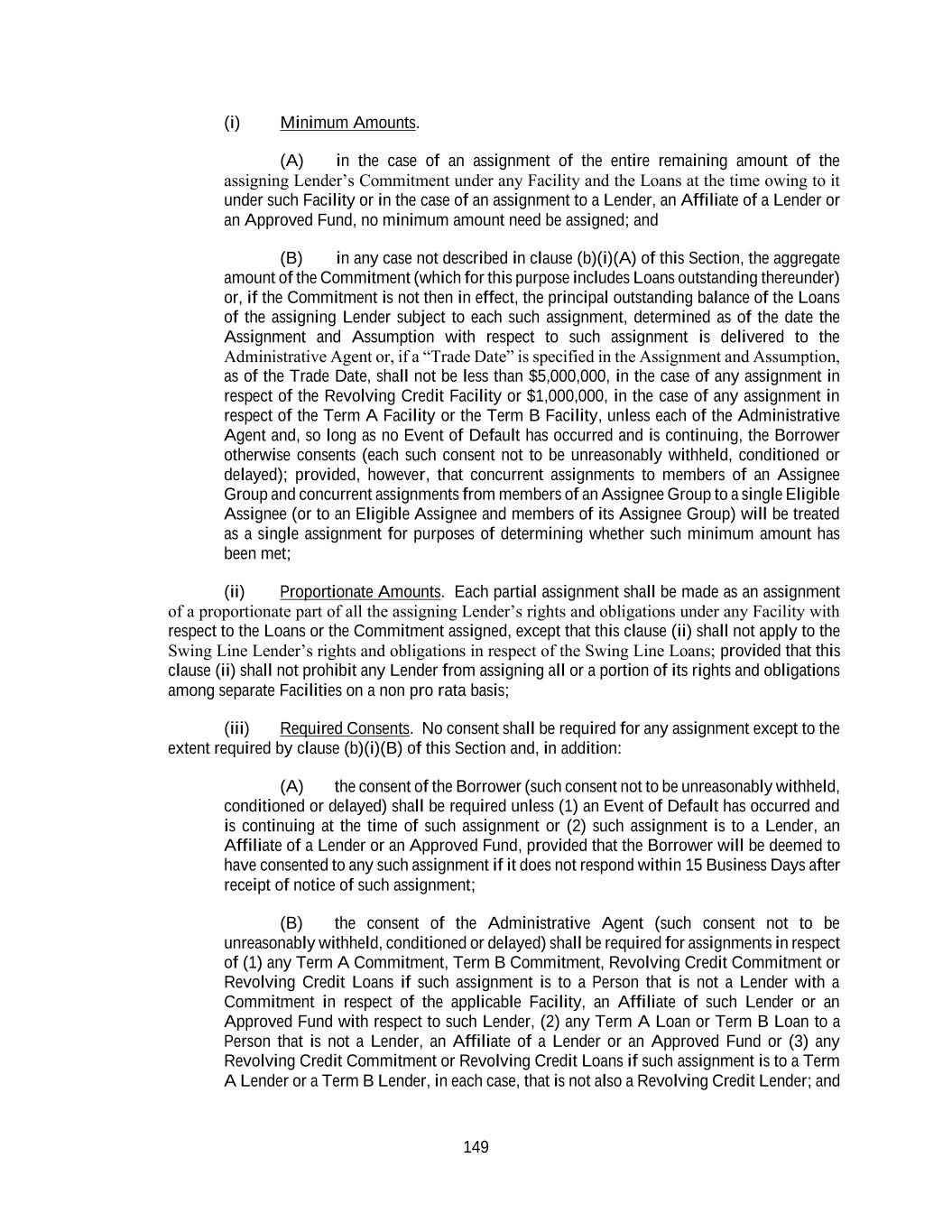149(i)最低数额。(a)如转让转让贷款人在任何融资项下的承诺的全部剩余金额及当时根据该融资项下欠其的贷款,或如转让予贷款人、贷款人的附属公司或认可基金,则无须转让最低金额;及(b)在本条(b)(i)(a)条未有描述的任何情况下,承诺的总金额(为此目的包括根据该承诺项下未偿还的贷款),或如该承诺当时并无生效,受每项该等转让规限的转让贷款人的贷款的未偿还本金余额,在有关该等转让的转让和假设交付给行政代理人之日确定,或如在转让和假设中指明“交易日期”,则在交易日期确定,在有关循环信贷融资的任何转让的情况下,不低于5000000美元,或在有关A期融资或B期融资的任何转让的情况下,不低于1000000美元,除非每一行政代理人和,只要没有发生违约事件并且仍在继续,借款人以其他方式同意(每项此类同意不得被无理拒绝、附加条件或延迟);但前提是,向受让人集团成员的并行转让以及受让人集团成员向单一合格受让人(或向合格受让人及其受让人集团成员)的并行转让将被视为单一转让,以确定是否已满足此种最低金额;(ii)比例数额。每项部分转让均应作为转让贷款人在任何融资项下与所转让贷款或所转让承诺相关的所有权利和义务的相应部分的转让,但本条款(ii)不适用于周转线贷款人在周转线贷款方面的权利和义务;但本条款(ii)不得禁止任何贷款人在不同融资项下非按比例转让其全部或部分权利和义务;(iii)所需同意。任何转让无须取得同意,但本条(b)(i)(b)条所规定的范围除外,此外:(a)须取得借款人的同意(该同意不得被无理拒绝、附加条件或延迟),除非(1)违约事件已经发生,并在该项转让时仍在继续,或(2)该项转让是向贷款人、贷款人的附属公司或认可基金作出,前提是,如果借款人在收到转让通知后15个工作日内未作出回应,则将被视为已同意任何此类转让;(b)就(1)任何期限A承诺、期限B承诺、循环信贷承诺或循环信用贷款(如果此类转让是向不是就适用融资作出承诺的贷款人的人)进行的转让,则应要求行政代理人的同意(此类同意不得被无理拒绝、附加条件或延迟),该等贷款人的联属公司或与该等贷款人有关的认可基金,(2)向并非贷款人的人、贷款人的联属公司或认可基金提供的任何A期贷款或B期贷款,或(3)任何循环信贷承诺或循环信贷贷款,如该等转让是向某一期限贷款人或B期贷款人作出的,在每种情况下,亦非循环信贷贷款人;及