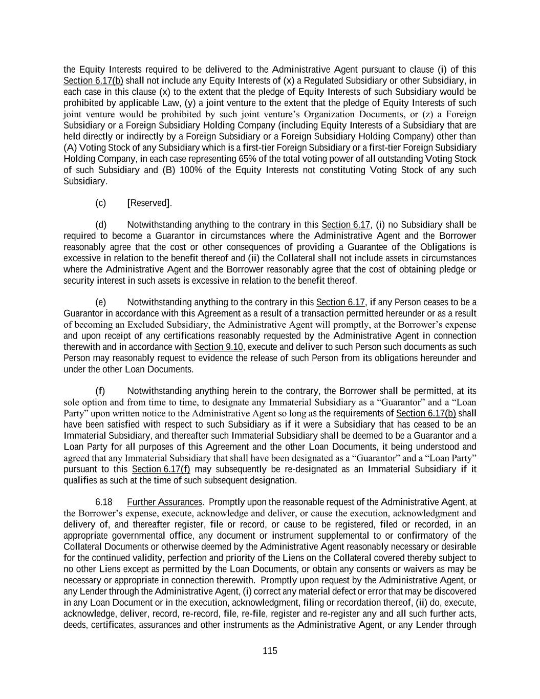 115根据本条第6.17(b)款第(i)款要求交付给行政代理人的股权不应包括(x)受监管子公司或其他子公司的任何股权,在本条款的每一种情况下(x)该子公司的股权质押将被适用法律禁止,(y)该合资企业的股权质押将被该合资企业的组织文件禁止,或(z)外国子公司或外国子公司控股公司(包括由外国子公司或外国子公司控股公司直接或间接持有的子公司的股权),但(a)属于外国一级子公司或外国一级子公司控股公司的任何子公司的表决权股份,在每种情况下均代表该子公司所有已发行表决权股份总投票权的65%,以及(b)不构成任何该等子公司表决权股份的100%股权。(c)[保留]。(d)尽管本条第6.17条另有相反规定,(i)在行政代理人和借款人合理同意为债务提供担保的成本或其他后果相对于其利益而言过高的情况下,不得要求任何附属公司成为担保人;(ii)在行政代理人和借款人合理同意获得此类资产的质押或担保权益的成本相对于其利益而言过高的情况下,担保物不得包括资产。(e)尽管本条第6.17条另有相反规定,如任何人因根据本协议许可的交易或因成为被排除的附属公司而根据本协议不再是担保人,则该行政代理人将迅速、由借款人负担费用,并在收到行政代理人就此合理要求并根据第9.10条提供的任何证明后,签署并向该人交付该人可能合理要求的文件,以证明该人免除其在本协议项下和其他贷款文件项下的义务。(f)尽管本协议另有相反规定,只要第6.17(b)节的要求已就该附属公司得到满足,犹如该附属公司已不再是一家非实质性附属公司一样,则应允许借款人在向行政代理人发出书面通知后,自行选择并不时指定任何非实质性附属公司为“担保人”和“贷款方”,此后,就本协议和其他贷款文件的所有目的而言,该非实质性附属公司应被视为担保人和贷款方,据了解并同意,根据本第6.17(f)条应被指定为“担保人”和“贷款方”的任何非实质性子公司,如果在随后的指定时符合资格,则可随后被重新指定为非实质性子公司。6.18进一步保证。迅速应行政代理人的合理请求,由借款人负担费用,执行、确认和交付,或促使执行、确认和交付,并随后在适当的政府办公室登记、归档或记录,或促使在适当的政府办公室登记、归档或记录,或促使行政代理人认为合理必要或适宜的任何文件或文书,以保持由此涵盖的担保物上的留置权的有效性、完善性和优先权,但除贷款文件许可外,不存在其他留置权,或取得与此有关的任何必要或适当的同意或放弃。经行政代理人或任何贷款人透过行政代理人要求,迅速(i)更正任何贷款文件或其执行、确认、备案或记录中可能发现的任何重大缺陷或错误,(ii)作为行政代理人作出、执行、确认、交付、记录、重新记录、归档、重新归档、登记及重新登记任何及所有该等进一步行为、契据、证明、保证及其他文书,或任何贷款人透过