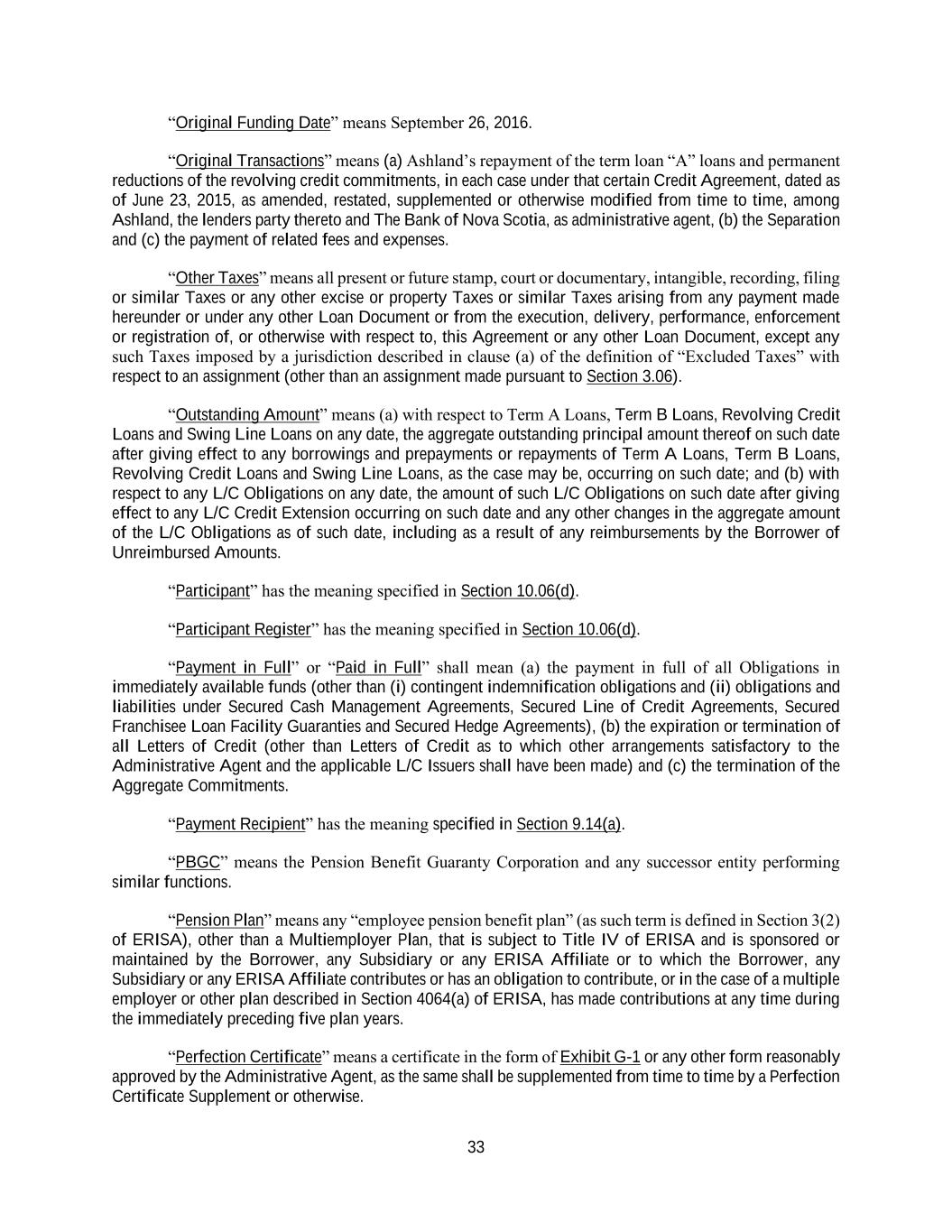 33“原始资助日期”指2016年9月26日。“原始交易”是指(a)亚什兰、贷款方和作为行政代理人的新斯科舍银行之间根据截至2015年6月23日经修订、重述、补充或不时修改的特定信贷协议偿还定期贷款“A”贷款和永久减少循环信贷承诺,(b)分离和(c)支付相关费用和开支。“其他税项”是指根据本协议或根据任何其他贷款文件支付的任何款项或本协议或任何其他贷款文件的执行、交付、履行、强制执行或登记或以其他方式与本协议或任何其他贷款文件有关的所有现有或未来的印章、法院或文件、无形的、记录、备案或类似的税项或任何其他消费税或财产税或类似的税项,但“不包括税项”定义(a)条所述的司法管辖区就一项转让(根据第3.06条作出的转让除外)征收的任何此类税款除外。“未偿还金额”是指(a)就任何日期的A期贷款、B期贷款、循环信用贷款和周转额度贷款而言,在该日期发生的任何借款和A期贷款、B期贷款、循环信用贷款和周转额度贷款(视情况而定)的预付款或还款生效后,其在该日期的未偿还本金总额;及(b)就任何日期的任何信用证债务而言,在该日期发生的任何信用证信贷延期生效后,该日期的该等信用证债务的金额,以及截至该日期的信用证债务总额的任何其他变化,包括借款人偿还未偿还金额的结果。“参与者”具有第10.06(d)节规定的含义。“参与者名册”具有第10.06(d)节规定的含义。“全额支付”或“全额支付”是指(a)以即时可用资金全额支付所有义务((除(i)或有赔偿义务和(ii)有担保现金管理协议、有担保信贷额度协议、有担保特许人贷款融资担保和有担保对冲协议项下的义务和负债),(b)所有信用证(已作出行政代理人和适用的信用证发行人满意的其他安排的信用证除外)的到期或终止,以及(c)合计承诺的终止。“付款受款人”具有第9.14(a)节规定的含义。“PBGC”是指Pension Benefit Guaranty Corporation和任何履行类似职能的继任实体。“养老金计划”是指任何“雇员养老金福利计划”(该术语在ERISA第3(2)节中定义),但多雇主计划除外,受ERISA标题IV约束,并由借款人、任何子公司或任何ERISA关联公司赞助或维持,或由借款人、任何子公司或任何ERISA关联公司出资或有义务出资,或在ERISA第4064(a)节中描述的多雇主或其他计划的情况下,在紧接前五个计划年度的任何时间均已出资。“完美证书”是指以附件 G-1形式或经行政代理人合理批准的任何其他形式的证书,该证书应不时以完美证书补充或其他方式予以补充。