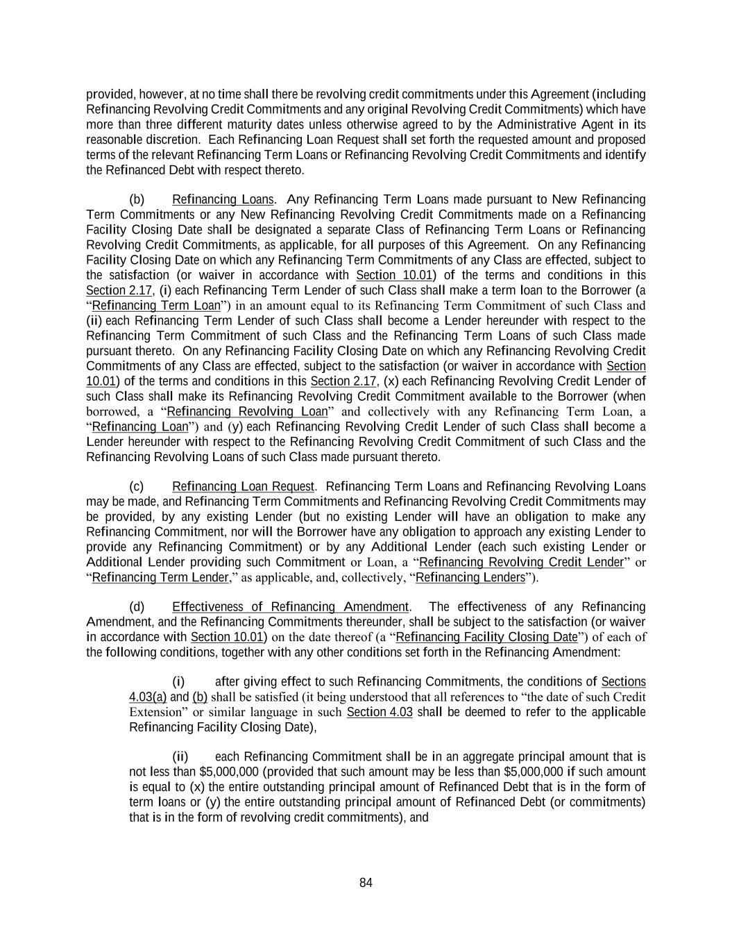 84规定,但本协议项下的循环信贷承诺(包括再融资循环信贷承诺和任何原始循环信贷承诺)在任何时候均不得有超过三个不同到期日,除非行政代理人在其合理酌情权下另有约定。每份再融资贷款请求应列出相关再融资定期贷款或再融资循环信用承诺的请求金额和拟议条款,并确定与此相关的再融资债务。(b)再融资贷款。根据新的再融资期限承诺提供的任何再融资定期贷款或在再融资融资融资截止日期作出的任何新的再融资循环信贷承诺应为本协议的所有目的(如适用)指定单独类别的再融资定期贷款或再融资循环信贷承诺。在任何类别的任何再融资期限承诺生效的任何再融资融资融资截止日期,但须符合(或根据第10.01条豁免)本条第2.17条的条款及条件,(i)该类别的每名再融资定期贷款人须向借款人提供一笔定期贷款(“再融资定期贷款”),金额相等于其该类别的再融资定期承诺;及(ii)该类别的每名再融资定期贷款人须就该类别的再融资定期承诺及依据该类别作出的再融资定期贷款成为本协议项下的贷款人。在任何类别的任何再融资循环信贷承诺生效的任何再融资融资融资截止日期,但须符合(或根据第10.01条豁免)本条第2.17条的条款及条件,(x)该类别的每名再融资循环信贷贷款人须向借款人提供其再融资循环信贷承诺(如借入,则为“再融资循环贷款”,并与任何再融资定期贷款合称,a“再融资贷款”)及(y)就该类别的再融资循环信贷承诺及据此作出的该类别的再融资循环贷款而言,每名该类别的再融资循环信贷贷款人须成为本协议项下的贷款人。(c)再融资贷款申请。再融资定期贷款和再融资循环贷款可由任何现有贷款人(但没有任何现有贷款人将有义务作出任何再融资承诺,借款人也没有义务与任何现有贷款人接洽以提供任何再融资承诺)或由任何额外贷款人(每个此类现有贷款人或提供此类承诺或贷款的额外贷款人,“再融资循环信贷贷款人”或“再融资定期贷款人”(如适用),以及统称为“再融资贷款人”)提供再融资期限承诺和再融资循环信贷承诺。(d)再融资修订的有效性。任何再融资修订的有效性及其项下的再融资承诺,须在其日期(“再融资融资融资截止日期”)满足(或根据第10.01条豁免)以下各项条件,连同再融资修订中规定的任何其他条件:(i)在该等再融资承诺生效后,第4.03(a)和(b)条的条件应得到满足(有一项理解,即此类第4.03条中所有提及“此类信贷延期的日期”或类似语言的内容应被视为提及适用的再融资融资融资截止日期),(ii)每项再融资承诺的本金总额应不少于5,000,000美元(但如该等金额等于(x)以定期贷款形式出现的再融资债务的全部未偿本金金额或(y)以循环信贷承诺形式出现的再融资债务(或承诺)的全部未偿本金金额,则该等金额可少于5,000,000美元),及