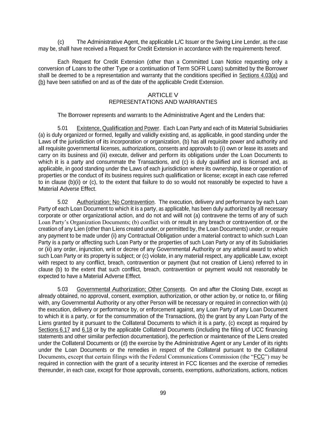 99(c)行政代理人、适用的信用证发行人或周转额度贷款人(视情况而定)应已收到按照本协议要求的授信延期请求。借款人提交的每一项信贷延期请求(承诺贷款通知要求仅将贷款转换为其他类型或延续定期SOFR贷款除外)应被视为在适用的信贷延期之日及截至该日已满足第4.03(a)和(b)条规定的条件的陈述和保证。第五条代表和保证借款人向行政代理人和出借人陈述和保证:5.01存在、资格和权力。每一贷款方及其每一重要子公司(a)均已正式组织或组建,合法有效地存在,并酌情在其成立或组织的司法管辖区的法律下具有良好信誉,(b)拥有所有必要的权力和权力以及所有必要的政府许可、授权、同意和批准,以(i)拥有或租赁其资产并开展其业务,以及(ii)执行、交付和履行其作为一方当事人的贷款文件项下的义务并完成交易,以及(c)具有适当资格并获得许可,并酌情,在其对财产的所有权、租赁或经营或其业务的开展需要此种资格或许可的每个司法管辖区的法律下具有良好信誉;除(b)(i)或(c)条所述的每种情况外,在合理地预计不这样做不会产生重大不利影响的范围内。5.02授权;不得违反。每一贷款方执行、交付和履行其作为一方当事人的每一份贷款文件(如适用)均已获得所有必要的公司或其他组织行动的正式授权,并且不会也不会(a)违反任何此类贷款方组织文件的条款;(b)与任何违反或违反,或产生任何留置权(根据贷款文件设定的留置权或由贷款文件允许的留置权除外)相冲突,或要求根据(i)该贷款方为一方当事人的重要合同项下的任何合同义务或影响该贷款方或其任何子公司的财产或(ii)任何政府当局的任何命令、强制令、令状或法令或该贷款方或其财产所受的任何仲裁裁决支付任何款项;或(c)在任何重大方面违反任何适用法律,但任何冲突、违约除外,(b)条所指的违反或付款(但不是设定留置权),但以合理地预期此类冲突、违反、违反或付款不会产生重大不利影响为限。5.03政府授权;其他同意。在截止日期当日及之后,除已取得的情况外,任何政府当局或任何其他人的批准、同意、豁免、授权或其他行动,或向任何其他人发出通知,或向任何其他人提交文件,将不会在(a)任何贷款方签署、交付或履行其作为当事方的任何贷款文件或对其强制执行,或为完成交易,(b)任何贷款方授予其根据其作为当事方的抵押文件所授予的留置权方面有需要或需要,(c)除第6.17和6.18条或适用的抵押文件(包括提交UCC融资报表和其他类似的完善文件)要求外,抵押文件项下设定的留置权的完善或维持,或(d)行政代理人或任何贷款人根据抵押文件行使其在贷款文件下的权利或就抵押文件采取的补救措施,除非在授予FCC许可的担保权益和根据该许可行使补救措施方面可能需要向联邦通信委员会(“FCC”)提交某些文件,在每种情况下,这些批准、同意、豁免、授权、行动、通知除外