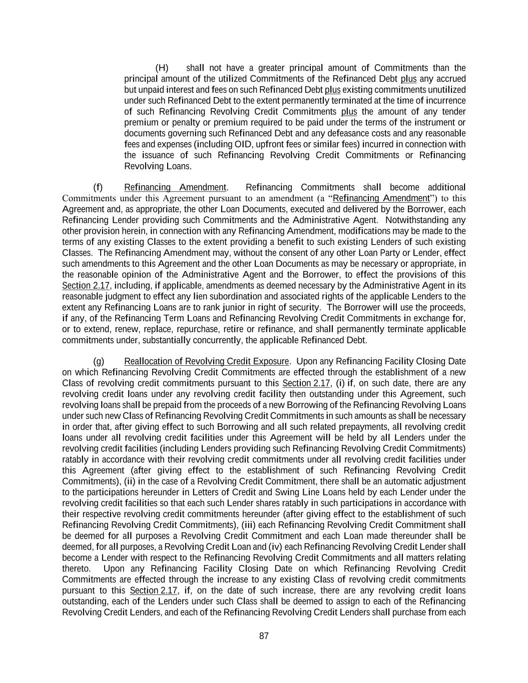 87(h)的承诺本金不得高于已使用的再融资债务承诺本金加上该等再融资债务的任何应计但未支付的利息和费用加上该等再融资债务下未使用的现有承诺,但以在发生该等再融资循环信贷承诺时永久终止为限加上根据管辖该等再融资债务的文书或文件的条款要求支付的任何投标溢价或罚款或溢价的金额以及任何撤销费用和任何合理的费用和开支(包括OID,预付费用或类似费用)因发行该等再融资循环信贷承诺或再融资循环贷款而产生。(f)再融资修正案。再融资承诺应根据对本协议的修订(“再融资修订”)以及酌情由借款人、提供此类承诺的每个再融资贷款人和行政代理人签署和交付的其他贷款文件,成为本协议项下的额外承诺。尽管本文有任何其他规定,但就任何再融资修订而言,可对任何现有类别的条款作出修改,以向该等现有类别的该等现有贷款人提供利益为限。再融资修正案可在不征得任何其他贷款方或贷款人同意的情况下,对本协议和其他贷款文件进行行政代理人和借款人合理认为必要或适当的修改,以实现本条第2.17款的规定,包括(如适用)行政代理人在其合理判断中认为必要的修改,以在任何再融资贷款在担保权上排名较后的范围内实现适用贷款人的任何留置从属地位和相关权利。借款人将使用再融资定期贷款和再融资循环信贷承诺的收益(如有)来交换或展期、续期、替换、回购、退休或再融资,并应永久终止适用的再融资债务项下的适用承诺,基本上同时。(g)重新分配循环信贷敞口。在根据本条第2.17款通过设立新类别循环信贷承诺实现再融资循环信贷承诺的任何再融资融资融资截止日期,(i)如果在该日期有任何循环信贷融资项下的任何循环信贷贷款,然后根据本协议未偿还,则该循环贷款应从该新类别再融资循环信贷承诺项下的再融资循环贷款的新借款的收益中预付,其数额应为,在该等借款及所有该等相关预付款生效后,本协议项下所有循环信贷额度下的所有循环信贷贷款将由循环信贷额度下的所有贷款人(包括提供该等再融资循环信贷承诺的贷款人)根据其在本协议项下所有循环信贷额度下的循环信贷承诺(在该等再融资循环信贷承诺成立生效后)按比例持有,(ii)在循环信贷承诺的情况下,应自动调整每个贷款人在循环信贷额度下持有的信用证和周转额度贷款在本协议下的参与,以便每个该等贷款人根据其各自在本协议下的循环信贷承诺(在该等再融资循环信贷承诺成立生效后)按比例分享该等参与,(iii)每个再融资循环信贷承诺就所有目的而言均应被视为循环信贷承诺,而根据该承诺作出的每笔贷款就所有目的而言均应被视为,a循环信贷贷款及(iv)每名再融资循环信贷贷款人须就再融资循环信贷承诺及所有有关事宜成为贷款人。在根据本条第2.17款通过增加到任何现有类别的循环信贷承诺而实现再融资循环信贷承诺的任何再融资融资融资截止日期,如果在该增加日期有任何未偿还的循环信贷贷款,则该类别下的每一贷款人应被视为转让给每一再融资循环信贷贷款人,而每一再融资循环信贷贷款人应从每一