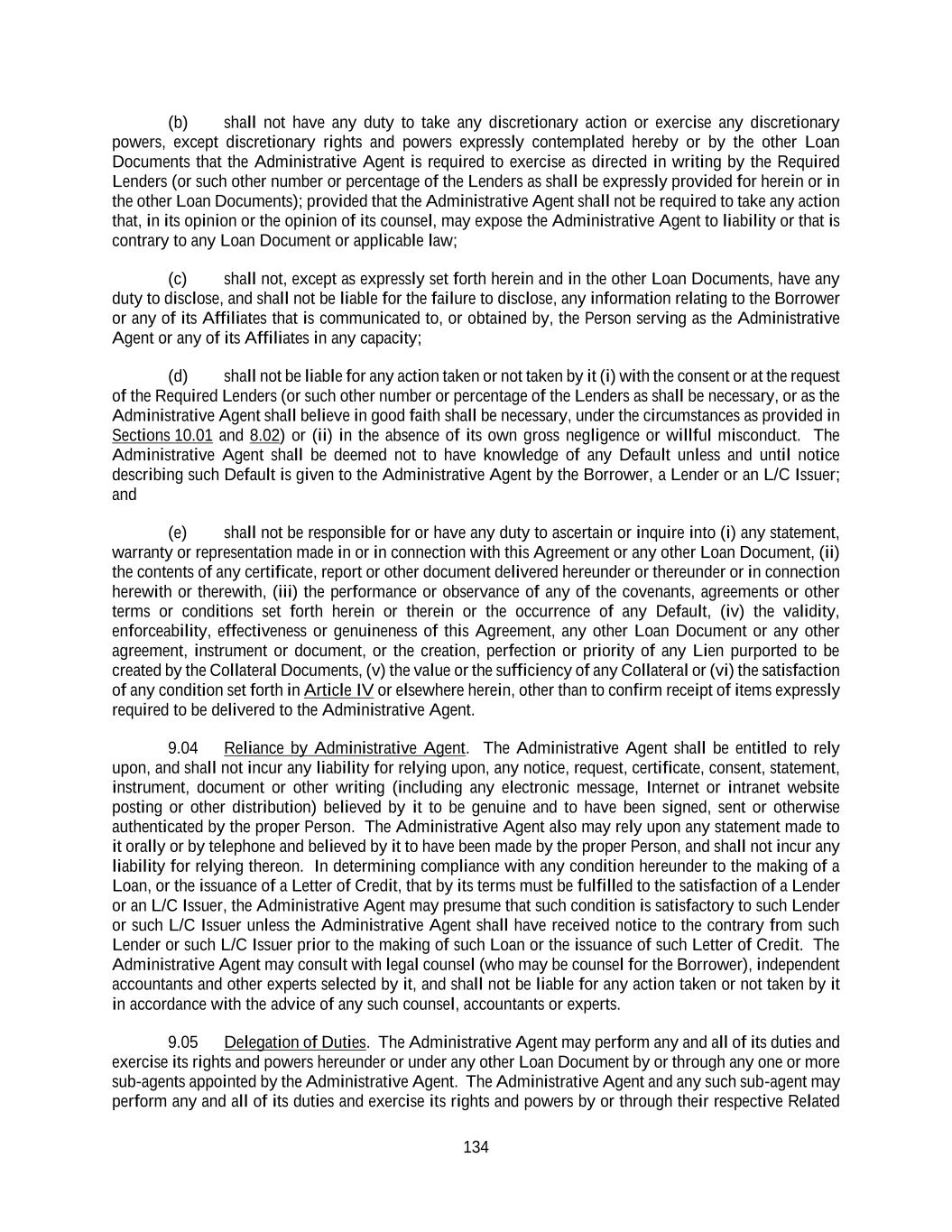 134(b)没有任何责任采取任何酌情权行动或行使任何酌情权,但特此明确设想的酌情权和权力或要求行政代理人按规定贷款人(或此处或其他贷款文件中明确规定的贷款人的其他数目或百分比)书面指示行使的其他贷款文件所规定的酌情权和权力除外;但不得要求行政代理人采取其认为或其律师认为,可以使行政代理人承担责任或违反任何贷款文件或适用法律的责任;(c)除本文和其他贷款文件中明确规定的情况外,不承担任何披露义务,也不对未能披露与借款人或其任何关联机构有关的任何信息承担责任,这些信息是传达给或由其获得的,以任何身分担任行政代理人或其任何联属公司的人;(d)对其(i)经所需贷款人同意或在要求下(或在第10.01及8.02条所规定的情况下,或(ii)在其本身并无重大过失或故意不当行为的情况下,或在行政代理人认为有诚意所需的其他数目或百分比的贷款人的要求下所采取或未采取的任何行动不承担法律责任。行政代理人应被视为不知道任何违约,除非且直至借款人、贷款人或信用证发行人向行政代理人发出说明该违约的通知;(e)不负责或有任何义务查明或查询(i)在本协议或任何其他贷款文件中作出或与其有关的任何陈述、保证或陈述,(ii)根据本协议或根据本协议或与本协议或与本协议或与本协议有关的任何证书、报告或其他文件的内容,(iii)履行或遵守本协议或其中所列的任何契诺、协议或其他条款或条件,或发生任何违约,(iv)本协议、任何其他贷款文件或任何其他协议、文书或文件的有效性、可执行性、有效性或真实性,或声称由抵押文件设定的任何留置权的设定、完善或优先权,(v)任何抵押品的价值或充分性,或(vi)满足第IV条或本协议其他地方所列的任何条件,确认收到明确要求交付给行政代理人的物品除外。9.04行政代理人的依赖。行政代理人有权依赖任何其认为真实的通知、请求、证明、同意、声明、文书、文件或其他书面(包括任何电子电文、互联网或内网网站张贴或其他分发),并经适当人员签字、发送或以其他方式认证,而不因依赖而承担任何责任。行政代理人也可以依赖以口头或电话方式向其作出并被其认为是由适当的人作出的任何陈述,不因依赖该陈述而承担任何责任。行政代理人在确定贷款的发放或信用证的签发符合本协议项下的任何条件时,其条款必须得到满足以使贷款人或信用证开证人满意,行政代理人可以推定该条件令该贷款人或该信用证开证人满意,除非该行政代理人在发放该贷款或签发该信用证之前已收到该贷款人或该信用证开证人的相反通知。行政代理人可以咨询法律顾问(可以是借款人的法律顾问)、独立会计师和其选聘的其他专家,对其按照任何此类法律顾问、会计师或专家的建议采取或不采取的任何行动不承担责任。9.05职责下放。行政代理人可以由或通过行政代理人指定的任何一名或多名次级代理人履行其在本协议项下或在任何其他贷款文件项下的任何和所有职责并行使其权利和权力。行政代理人及任何该等分代理人可藉由或透过其各自的有关