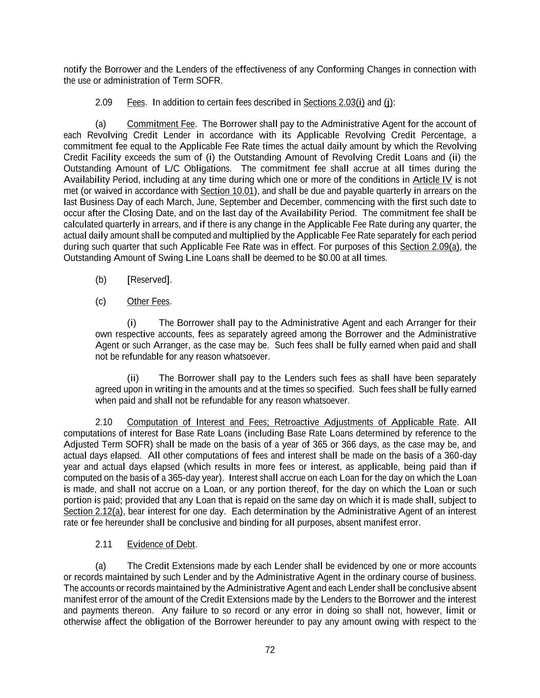 72通知借款人和贷款人与使用或管理定期SOFR有关的任何一致变更的有效性。2.09费用。除第2.03(i)和(j)节所述的某些费用外:(a)承诺费。借款人应按照其适用的循环信贷百分比向各循环信贷贷款人账户的行政代理人支付一笔承诺费,该承诺费等于适用的费率乘以循环信贷融资超过(i)循环信贷贷款未偿还金额和(ii)信用证债务未偿还金额之和的实际每日金额。承诺费应在可用期内的所有时间累积,包括在第四条中的一项或多项条件未得到满足(或根据第10.01条被免除)的任何时间,并应在每年3月、6月、9月和12月的最后一个营业日、自截止日期后发生的第一个此类日期开始,以及在可用期的最后一天按季度到期支付。承诺费应按季度计算拖欠,任何季度适用费率发生变化的,应按该适用费率生效的季度内每一期间的实际每日金额分别计算乘以适用费率。就本条第2.09(a)款而言,周转额度贷款的未偿金额在任何时候均应视为0.00美元。(b)[保留]。(c)其他费用。(i)借款人应向行政代理人及每名安排人各自的账户支付借款人与行政代理人或该安排人(视情况而定)另行约定的费用。此类费用应在缴纳时全额赚取,不得以任何理由予以退还。(ii)借款人须按如此指明的款额及时间,向贷款人支付已另行书面议定的费用。此类费用应在缴纳时全额赚取,不得以任何理由予以退还。2.10利息和费用的计算;适用利率的追溯调整。基准利率贷款(包括参照调整后期限SOFR确定的基准利率贷款)的所有利息计算应以一年365或366天(视情况而定)和实际经过的天数为基础。所有其他费用和利息的计算应以一年360天和实际经过的天数为基础(这将导致支付的费用或利息(如适用)多于以一年365天为基础计算的费用或利息)。每笔贷款须于作出贷款当日产生利息,而贷款或其任何部分在支付贷款或该部分当日不得产生利息;但在作出贷款当日偿还的任何贷款,除第2.12(a)条另有规定外,须承担一天的利息。行政代理人对本协议项下利率或费用的每一项确定均为结论性的,对所有目的均具有约束力,无明显错误。2.11债务证据。(a)每一贷款人作出的信贷展期,应以该贷款人和行政代理人在正常业务过程中维持的一个或多个账户或记录为证据。行政代理人与各出借人保持的账户或记录,在没有明显错误的情况下,出借人向借款人办理的授信展期的金额及其利息和付款,应当是结论性的。然而,任何未如此记录或这样做时的任何错误均不应限制或以其他方式影响借款人根据本协议支付任何欠款的义务