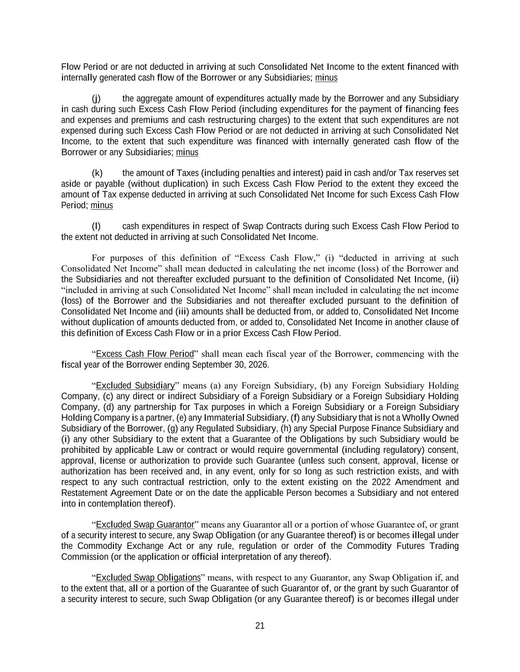 21流动期间或在以借款人或任何子公司的内部产生的现金流量融资的范围内在得出该合并净收益时不予以扣除;减去(j)借款人和任何子公司在该超额现金流期内以现金实际发生的支出总额(包括支付融资费用和支出及溢价和现金重组费用的支出),但该等支出在该超额现金流期内未予支出或在得出该合并净收益时未予扣除,在此种支出以借款人或任何子公司的内部产生的现金流量提供资金的范围内;减去(k)在该超额现金流期内以现金和/或预留或应付(不重复)的税收准备金支付的税额(包括罚款和利息),但以其超过在该超额现金流期内为得出该等合并净收益而扣除的税项费用的数额为限;减去(l)在该超额现金流期内为得出该等合并净收益而未扣除的与掉期合同有关的现金支出。就“超额现金流”这一定义而言,(一)“在得出该等合并净收益时扣除”系指在计算借款人及其附属公司的净收益(亏损)时扣除且其后未根据合并净收益定义予以排除的,(二)“在得出该等合并净收益时计入”系指在计算借款人及其附属公司的净收益(亏损)时计入且其后未根据合并净收益定义予以排除的,以及(三)金额应从合并净收益中扣除或增加,但未重复扣除或增加的金额,这一定义的另一条款中关于超额现金流或在之前的超额现金流期的合并净收益。“超额现金流期”是指借款人的每个会计年度,从借款人截至2026年9月30日的会计年度开始。“被排除的子公司”是指(a)任何外国子公司,(b)任何外国子公司控股公司,(c)外国子公司或外国子公司控股公司的任何直接或间接子公司,(d)外国子公司或外国子公司控股公司为合伙人的任何税务合伙企业,(e)任何非实质性子公司,(f)任何不是借款人全资子公司的子公司,(g)任何受监管的子公司,(h)任何特殊目的融资附属公司和(i)任何其他附属公司,前提是该附属公司对债务的担保将被适用法律或合同禁止,或将需要政府(包括监管机构)同意、批准、许可或授权才能提供此类担保(除非已收到此类同意、批准、许可或授权,并且在任何情况下,仅限于存在此类限制,并且就任何此类合同限制而言,仅限于在2022年修订及重述协议日期存在的范围内或在适用人士成为附属公司的日期存在且未在考虑该等事宜时订立)。“被排除的掉期担保人”是指根据《商品交易法》或商品期货交易委员会的任何规则、条例或命令(或其中任何一项的申请或官方解释),其对任何掉期义务(或其任何担保)的担保或授予担保权益的全部或部分是非法的或成为非法的任何担保人。“除外掉期义务”是指,就任何担保人而言,如果该担保人的全部或部分担保,或该担保人为担保而授予的担保权益(或其任何担保)是或成为非法的,则该任何掉期义务