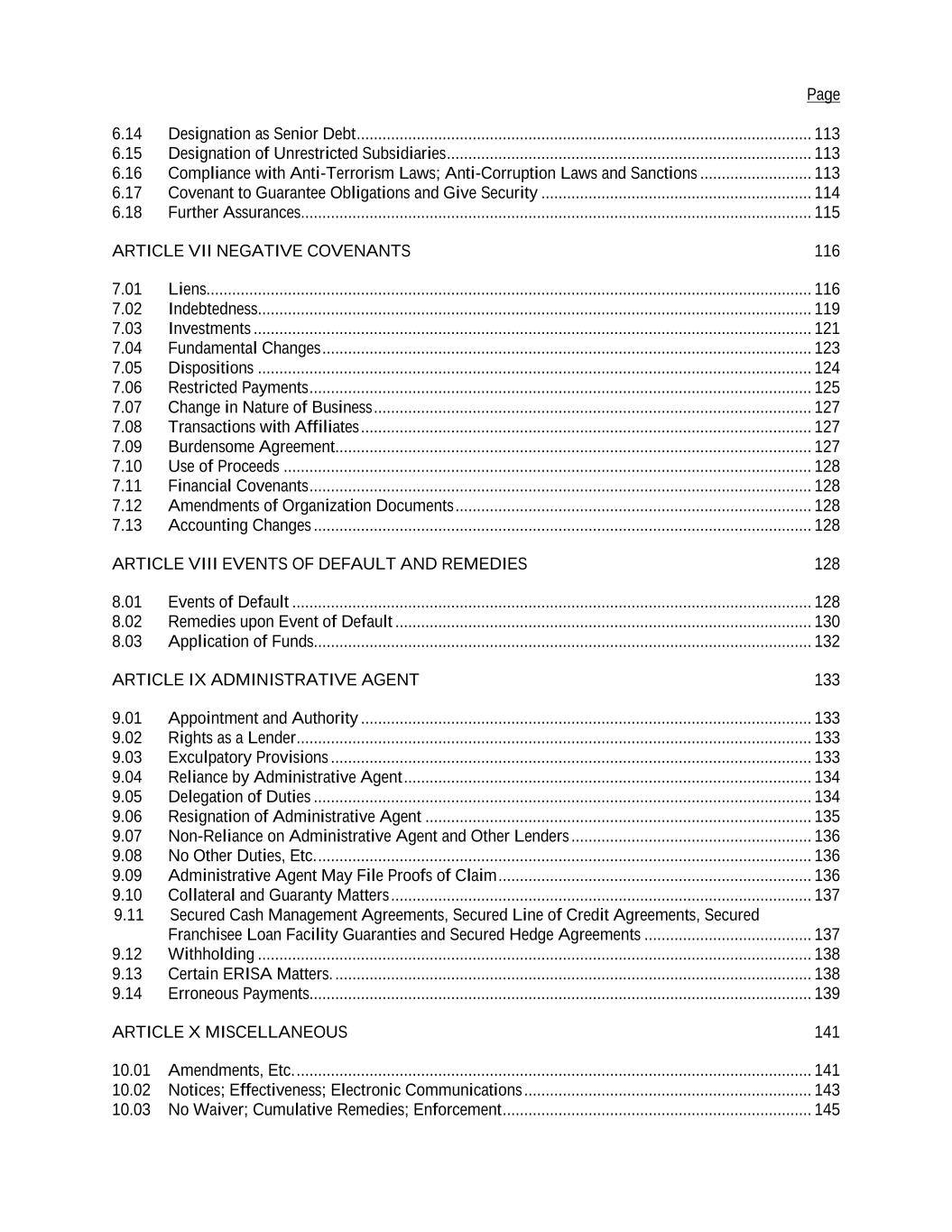 第6.14页指定为优先债务......................................................................................................1 136.15指定非限制性子公司..................................................................................1 136.16遵守反恐怖主义法律;反腐败法和制裁..................................1 136.17保证义务的契约并给予担保......................................................................1 146.18进一步保证......................................................................................................1 15条第七条否定盟约1167.01留置权....................................................................................................................................1 167.02负债....................................................................................1 197.03投资....................................................................................1 127.04基本变化....................................................................................................1 127.05处置....................................................................................................................1 247.06受限制的付款....................................................................1 257.07业务性质变更....................................................................................1 277.08与关联公司的交易................................................................................................1 277.09繁重的协议....................................................................................................1 277.10所得款项用途...................................................................................................。......................1 28.13会计变更....................................................................................................................12 8第八条违约事件和补救措施1288.01违约事件......................................................................................................................1 88.02违约事件的补救措施......................................................................................1 308.03资金运用......................................................................................13 2第九条行政代理人1339.01任用和授权....................................................................................................................13 39.02作为出借人的权利....................................................................................13 39.03免责规定....................................................................................................13 39.04行政代理人的依赖....................................................................................13 49.05职责的下放....................................................................................13 49.06行政代理人的离职....................................................................................13 59.07不依赖行政代理人和其他出借人....................................................................1 369.08不承担其他职责等....................................................................................1 369.09行政代理人可以提出债权证明....................................................................................................1 36.9 有担保的特许经营商贷款融资担保和有担保的对冲协议...................................................1 379.12代扣...................................................................................................................................1 389.13某些ERISA事项。.......................................................................................................1 389.14误缴款.......................................................................................................1 39第X条杂项14110.01修正案等......................................................................................................1 410.02通知;效力;电子通信...................................................................14 310.03不放弃;累计补救办法;强制执行......................................................................................1 45