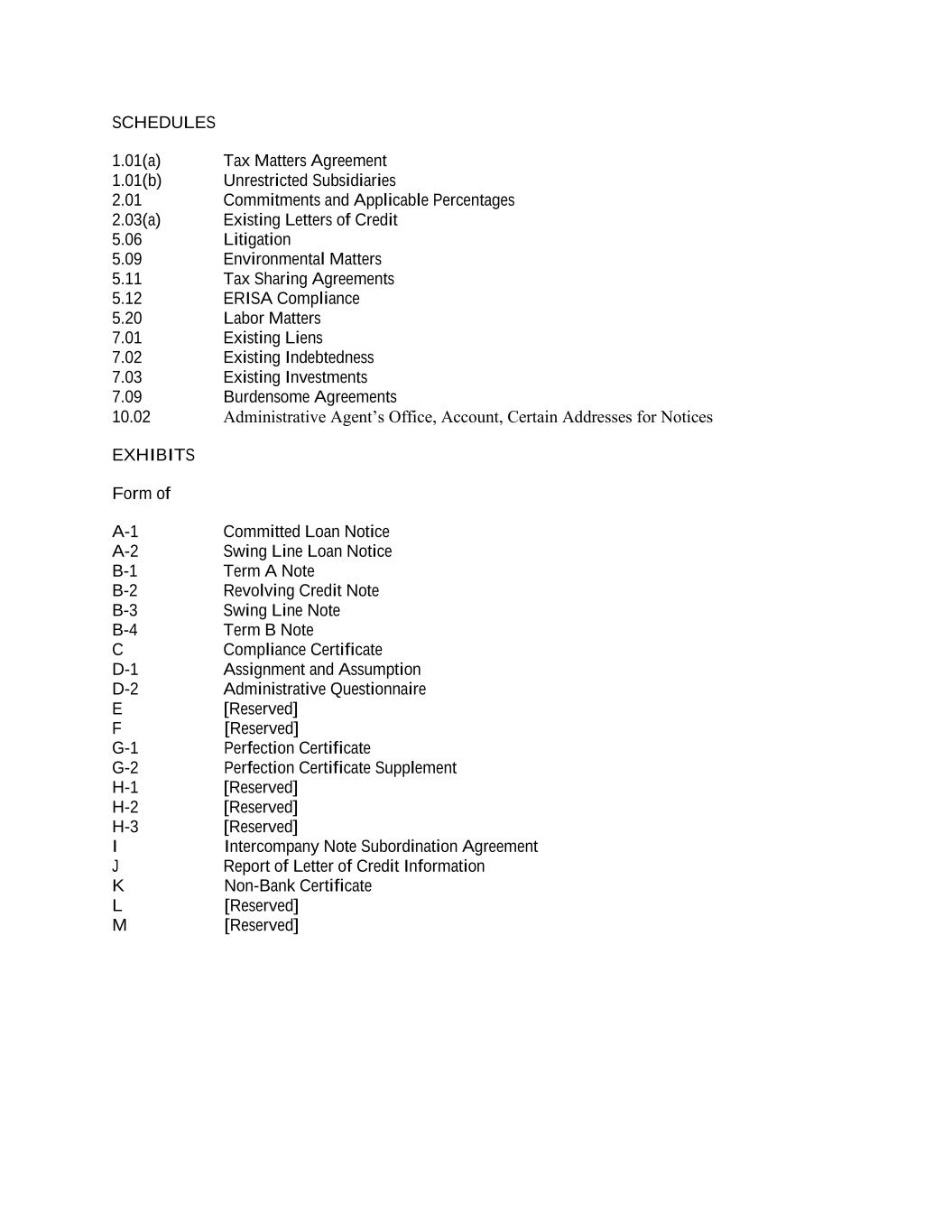 附表1.01(a)税务事项协议1.01(b)非限制性子公司2.01承诺和适用百分比2.03(a)现有信用证5.06诉讼5.09环境事项5.11税收共享协议5.12 ERISA合规5.20劳动事项7.01现有留置权7.02现有债务7.03现有投资7.09负担协议10.02行政代理人办公室、账户、通知的若干地址A-1承诺贷款通知的展示表A-2周转额度贷款通知B-1期限A票据B-2循环信用票据B-3周转额度票据B-4期限B票据C合规凭证D-1转让和假设D-2行政调查问卷e [保留] F [保留] G-1完善证G-2完善证补充H-1 [保留] H-2 [保留] H-3 [保留] i公司间票据从属协议J信用证信息的报告K非银行凭证L [保留] m [保留]