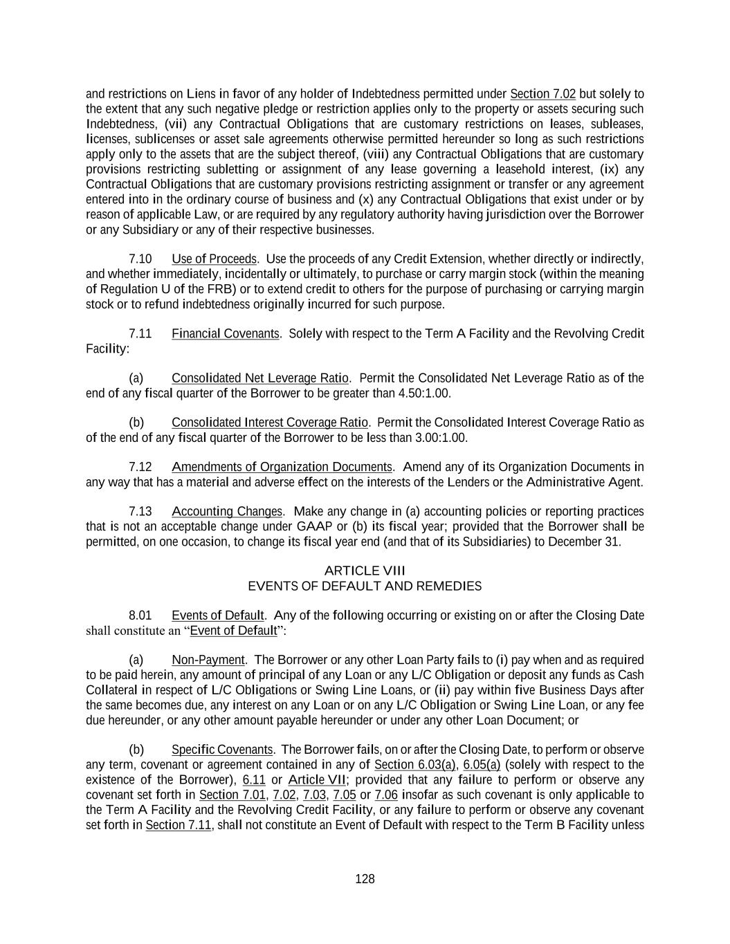 128以及对有利于第7.02条允许的任何债务持有人的留置权的限制,但仅限于任何此类负面质押或限制仅适用于为此类债务提供担保的财产或资产,(vii)任何合同义务,即对租赁、转租、许可、分许可或资产出售协议的惯常限制,只要此类限制仅适用于作为其标的的资产,(viii)任何合同义务,即限制管辖租赁权益的任何租赁的转租或转让的惯常规定,(ix)属于限制转让或转让的习惯规定的任何合同义务或在正常业务过程中订立的任何协议,以及(x)根据适用法律或由于适用法律而存在的任何合同义务,或对借款人或任何附属公司或其各自的任何业务具有管辖权的任何监管当局所要求的任何合同义务。7.10收益用途。使用任何信贷展期的收益,无论是直接或间接的,以及无论是立即、偶然或最终的,购买或持有保证金股票(在FRB条例U的含义内)或为购买或持有保证金股票的目的向他人提供信贷或退还最初为此目的而产生的债务。7.11财政盟约。仅就期限A融资和循环信贷融资而言:(a)综合净杠杆率。允许借款人截至任何财政季度末的合并净杠杆率大于4.50:1.00。(b)合并利息覆盖率。允许借款人截至任何财政季度末的合并利息覆盖率低于3.00:1.00。7.12组织文件的修改。以任何对出借人或行政代理人利益有重大不利影响的方式修改其任何组织文件。7.13会计变更。在(a)会计政策或报告惯例方面作出任何改变,但根据公认会计原则或(b)其财政年度,这是不可接受的改变;但有一次应允许借款人将其财政年度结束(及其子公司的财政年度结束)改为12月31日。第八条违约事件及补救措施8.01违约事件。在截止日期当日或之后发生或存在的下列任何一项,均构成“违约事件”:(a)不付款。借款人或任何其他贷款方未能(i)支付任何贷款或任何信用证债务的任何金额的本金,或就信用证债务或周转额度贷款存入任何资金作为现金抵押品,或(ii)在该款项到期后五个营业日内支付任何贷款或任何信用证债务或周转额度贷款的任何利息,或根据本协议到期的任何费用,或根据本协议或根据任何其他贷款文件应付的任何其他金额;或(b)特定契诺。借款人在截止日期当日或之后,未能履行或遵守第6.03(a)、6.05(a)条(仅就借款人的存在)、6.11条或第七条所载的任何条款、契诺或协议;但任何未能履行或遵守第7.01、7.02、7.03、7.05或7.06条所载的任何契诺的情况,只要该契诺仅适用于期限A融资和循环信贷融资,或任何未能履行或遵守第7.11条所载的任何契诺,不得构成B期融资的违约事件,除非