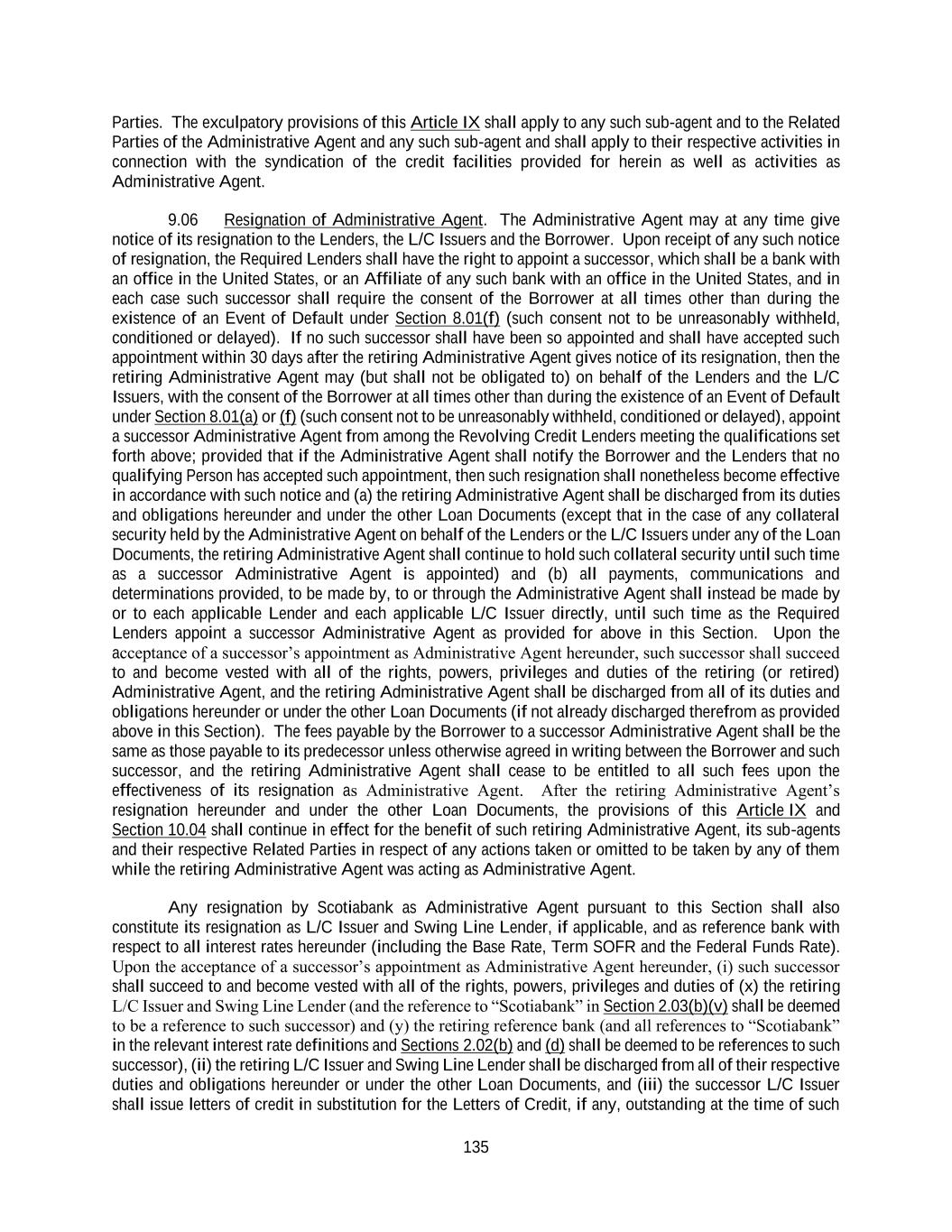 135个缔约方。第IX条的开脱条款适用于任何此类次级代理机构以及行政代理机构和任何此类次级代理机构的关联方,并适用于其各自与本协议规定的信贷便利的银团有关的活动以及作为行政代理机构的活动。9.06行政代理人辞职。行政代理人可以随时向出借人、信用证发行人和借款人发出离职通知。在收到任何此类辞职通知后,所需贷款人应有权指定继任者,该继任者应为在美国设有办事处的银行,或任何此类银行在美国设有办事处的关联公司,并且在每种情况下,该继任者应在根据第8.01(f)条存在违约事件期间以外的所有时间要求借款人同意(此种同意不得被无理拒绝、附加条件或延迟)。如没有该等继任人获如此委任,并须在退任行政代理人发出辞职通知后30天内接受该等委任,则该退任行政代理人可(但无须)代表贷款人及信用证发行人,在根据第8.01(a)或(f)条存在违约事件期间以外的任何时间,经借款人同意(该同意不得被无理拒绝、附加条件或延迟),从符合上述资格的循环信贷贷款人中指定继任行政代理人;但该行政代理人应通知借款人和贷款人没有符合资格的人接受该任命的,则该辞职仍须根据该通知生效,且(a)退任行政代理人须解除其在本协议项下及其他贷款文件项下的职责及义务(但如行政代理人代表贷款人或任何贷款文件项下的信用证发行人持有任何抵押担保,则退任行政代理人须继续持有该抵押担保,直至委任继任行政代理人为止)及(b)所有付款、通讯及所提供的决定,由,改为由每一适用的贷款人和每一适用的信用证发行人直接向或通过行政代理人作出,直至规定的贷款人按本条上述规定指定继任行政代理人为止。继任人根据本协议获委任为行政代理人后,该继任人应继承并被赋予退任(或退任)行政代理人的所有权利、权力、特权和义务,退任行政代理人应解除其根据本协议或根据其他贷款文件承担的所有职责和义务(如尚未按本条上述规定解除)。借款人向继任行政代理人支付的费用,除借款人与继任行政代理人另有书面约定外,与向其前任行政代理人支付的费用相同,退任行政代理人自辞去行政代理人职务生效之日起,不再享有上述全部费用。退任行政代理人在本合同项下和其他借款单证项下离职后,对于退任行政代理人在担任行政代理人期间所采取或不采取的任何行动,本条第九款和第10.04款的规定为该退任行政代理人、其次级代理人及其各自的关联方的利益继续有效。丰业银行根据本节辞去行政代理人的任何职务,也应构成其辞去信用证发行人和周转额度贷款人(如适用)以及就本协议项下所有利率(包括基准利率、定期SOFR和联邦基金利率)作为参考银行的职务。在根据本协议接受继任者作为行政代理人的任命后,(i)该继任者应继承并被赋予(x)退休信用证发行人和周转额度贷款人的所有权利、权力、特权和义务(而第2.03(b)(v)节中提及“丰业银行”应被视为对该继任者的提及)和(y)退休参考银行(相关利率定义和第2.02(b)和(d)节中所有提及“丰业银行”应被视为对该继任者的提及),(ii)退任信用证发行人及周转线贷款人须获解除各自在本协议或其他贷款文件项下的所有责任及义务,及(iii)继任信用证发行人须签发信用证以取代信用证(如有的话), 在此类情况发生时未偿还