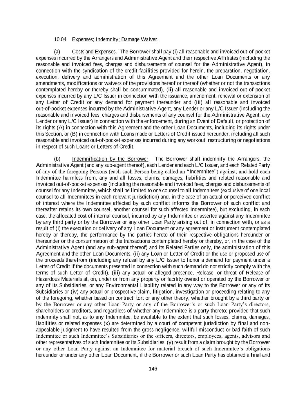 14610.04费用;赔偿;损害免责。(a)成本和费用。借款人应支付(i)安排人和行政代理人及其各自关联机构因本协议规定的信贷便利的银团、本协议及其他贷款文件的编制、谈判、执行、交付和管理或对本协议或其条款的任何修改、修改或放弃(无论本协议或其所设想的交易是否应完成)而产生的所有合理且已开具发票的自付费用(包括为行政代理人提供的律师的合理和已开具发票的费用、收费和付款),(ii)任何信用证发行人就任何信用证的签发、修订、续期或延期或根据该信用证提出的任何付款要求而招致的所有合理及已开票的自付费用,及(iii)行政代理人、任何贷款人或任何信用证发行人就强制执行、在违约事件期间或保护其与本协议及其他贷款文件有关的权利(a)而招致的所有合理及已开票的自付费用(包括行政代理人、任何贷款人或任何信用证发行人的任何大律师的合理及已开票的费用、收费及付款,包括其根据本条享有的权利,或(b)与根据本协议作出的贷款或签发的信用证有关的权利,包括在任何有关此类贷款或信用证的工作、重组或谈判期间发生的所有此类合理且已开具发票的自付费用。(b)借款人的赔偿。借款人应向安排人、行政代理人(及其任何次级代理人)、每个贷款人和每个信用证发行人以及前述任何人的每一关联方(每一此类人被称为“受偿人”)进行赔偿,并使每一受偿人免受任何和所有损失、索赔、损害、责任以及相关的合理和开具发票的自付费用(包括任何受偿人的合理和开具发票的律师费用、收费和支出,这些费用应限于所有受偿人的一名律师(不包括每个相关司法管辖区的所有受偿人的一名当地律师),并且,在发生实际或感知到的利益冲突的情况下,受此种冲突影响的受偿人将此种冲突通知借款人并随后保留其自己的律师,则此种受影响的受偿人的另一名律师),但在每种情况下均不包括内部律师的分配费用,由任何受偿人承担,或由任何第三方或由借款人或任何其他贷款方对任何受偿人提出主张,这些费用是由于(i)执行或交付任何贷款文件或在此或由此设想的任何协议或文书而产生、与此有关或由于此而产生的,本协议各方履行各自在本协议项下或本协议项下的义务或完成本协议项下或本协议项下拟进行的交易,或在仅涉及行政代理人(及其任何分代理人)及其关联方的情况下,管理本协议及其他贷款文件,(ii)任何贷款或信用证或其所得款项的使用或建议用途(包括任何信用证发行人拒绝根据信用证履行付款要求,但与该要求有关的文件并不严格遵守该信用证的条款),(iii)在借款人或其任何附属公司拥有或经营的任何财产或设施上、上、下或从其拥有或经营的任何财产或设施上实际或指称存在、释放或威胁释放危险材料,或以任何方式与借款人或其任何附属公司有关的任何环境责任,或(iv)与上述任何一项有关的任何实际或预期的申索、诉讼、调查或程序,不论是否基于合约、侵权或任何其他理论,不论由第三方或由借款人或任何其他贷款方或借款人或该贷款方的任何董事、股东或债权人提出,亦不论任何受偿人是否为其当事人;但就任何受偿人而言,该等弥偿不得在该等损失、债权、损害赔偿、责任或相关费用(x)由有管辖权的法院通过最终且不可上诉的判决确定为是由于该受偿人或该受偿人的子公司或该受偿人或其子公司的高级职员、董事、雇员、代理人、顾问和其他代表的重大过失、故意不当行为或恶意造成的,(y)是由于借款人或任何其他贷款方因重大违反该受偿人在本协议项下或任何其他贷款文件项下的义务而向受偿人提出的索赔,如果借款人或该贷款方已获得最终和