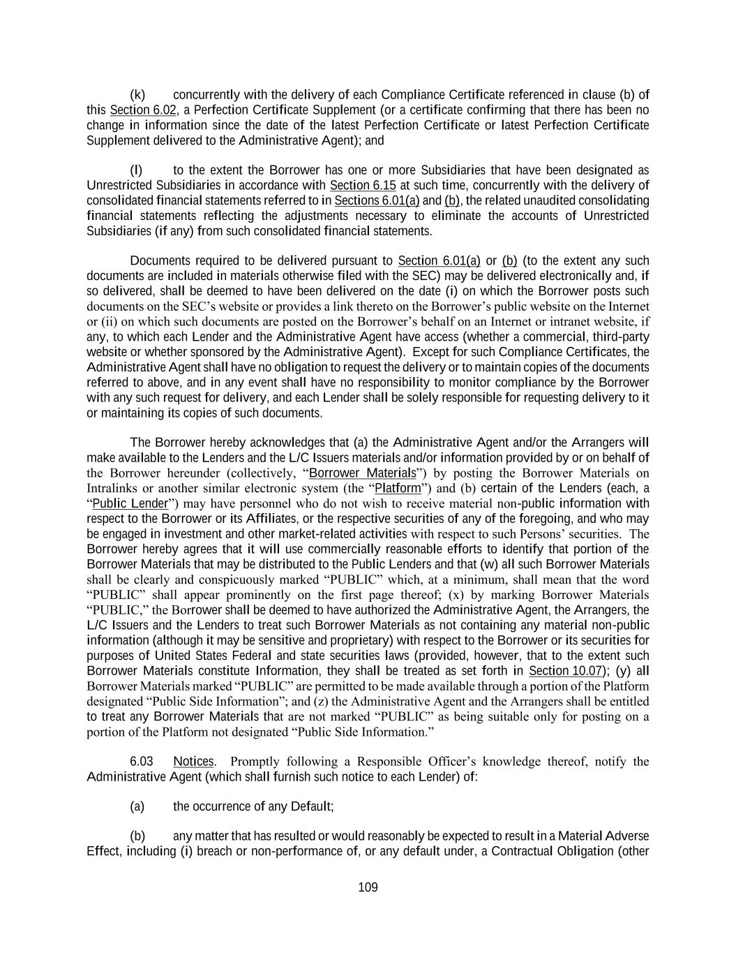 109(k)在交付本条第6.02条(b)款所提述的每份合规证书的同时,一份完美证书补充(或一份确认自最近一次完美证书或最近一次完美证书补充交付给行政代理人之日起信息没有变化的证书);及(l)在借款人拥有一个或多个根据当时第6.15条被指定为非限制性子公司的范围内,同时交付第6.01(a)和(b)条所提述的合并财务报表,相关未经审核综合财务报表,反映为从该等综合财务报表中剔除非受限制附属公司(如有)的账目而作出的必要调整。根据第6.01(a)或(b)节要求交付的文件(只要任何此类文件包含在以其他方式向SEC提交的材料中)可以电子方式交付,如果如此交付,则应被视为已在(i)借款人在SEC网站上发布此类文件或在借款人的互联网公共网站上提供链接或(ii)借款人在互联网或内联网网站(如有)上代表借款人发布此类文件之日交付,每个贷款人和行政代理人都可以访问的网站(无论是商业网站、第三方网站还是由行政代理人赞助的网站)。除此类合规证明外,行政代理人没有义务要求交付或保存上述文件的副本,并且在任何情况下都没有责任监督借款人对任何此类交付请求的遵守情况,每个贷款人应全权负责向其请求交付或保存其此类文件的副本。借款人在此确认,(a)行政代理人和/或安排人将通过在Intralinks或其他类似电子系统(“平台”)上张贴借款人材料,向贷款人和信用证发行人提供材料和/或由借款人或代表借款人提供的信息(统称“借款人材料”),以及(b)某些贷款人(各自称为“公共贷款人”)可能有人员不希望收到与借款人或其关联机构有关的重大非公开信息,或上述任何相关证券,以及可能从事与这些人的证券有关的投资和其他市场相关活动的人。借款人在此同意,其将使用商业上合理的努力来识别可能分发给公共贷款人的那部分借款人材料,并且(w)所有此类借款人材料应明确和显眼地标记“PUBLIC”,这至少意味着“PUBLIC”字样应出现在其第一页的显眼位置;(x)通过标记借款人材料“PUBLIC,”借款人应被视为已授权行政代理人、安排人、信用证发行人和贷款人将此类借款人材料视为不包含任何与借款人或其证券有关的重大非公开信息(尽管它可能是敏感和专有的),以符合美国联邦和州证券法的目的(但前提是,在此类借款人材料构成信息的范围内,按第10.07条规定处理);(y)允许所有标有“PUBLIC”的借款人材料通过平台指定的“公共侧信息”部分提供;(z)行政代理人和安排人有权将任何未标有“PUBLIC”的借款人材料视为仅适合在平台未指定的“公共侧信息”部分发布。6.03通知。迅速根据负责人员的知情情况,将以下情况通知行政代理人(应向每个贷款人提供此类通知):(a)任何违约的发生;(b)已导致或合理预期将导致重大不利影响的任何事项,包括(i)违反或不履行合同义务,或根据合同义务发生的任何违约(其他