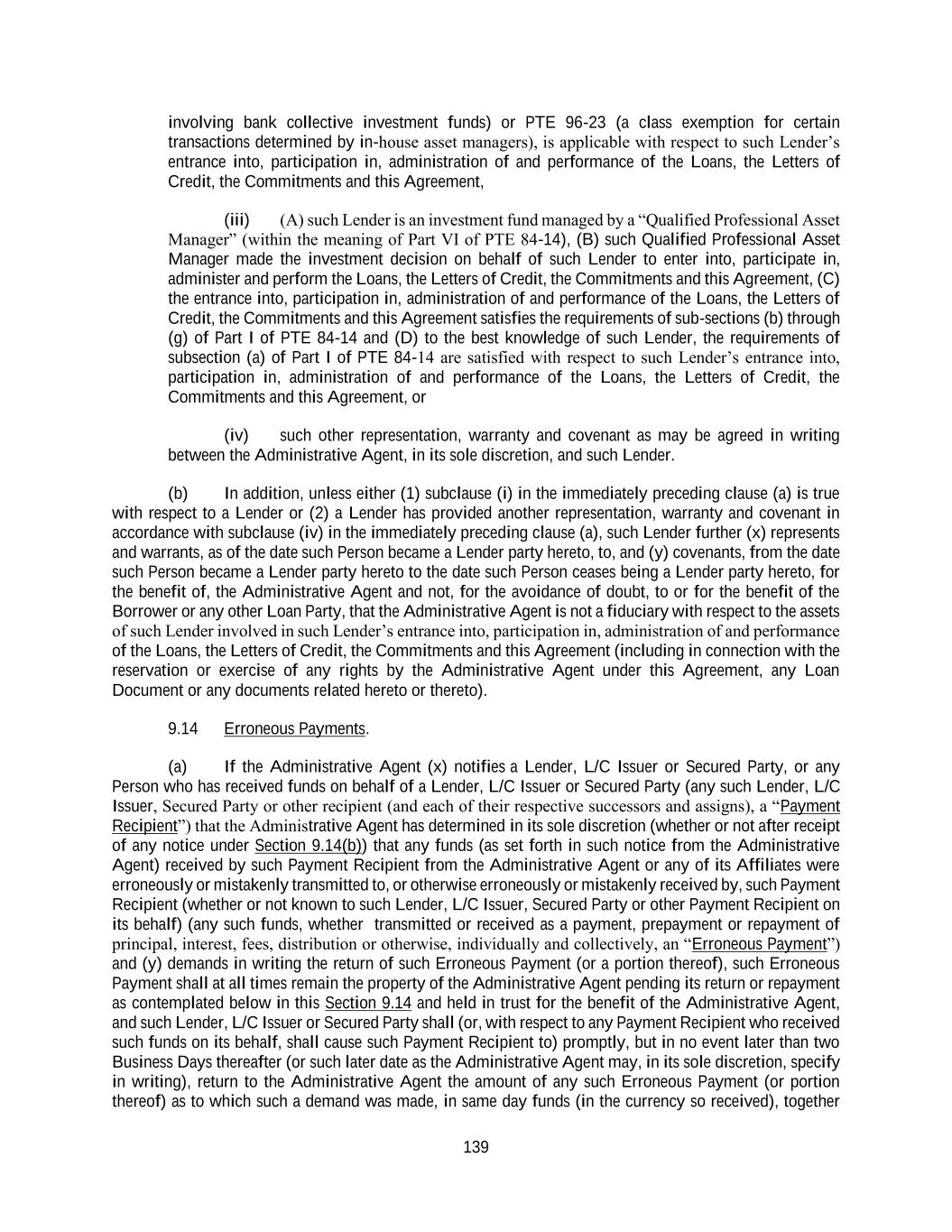 139涉及银行集体投资基金)或PTE 96-23(由内部资产管理人确定的某些交易的类别豁免),适用于该贷款人进入、参与、管理和履行贷款、信用证、承诺和本协议,(iii)(a)该贷款人是由“合格专业资产管理人”(在PTE 84-14第VI部分的含义内)管理的投资基金,(b)该合格专业资产管理人代表该贷款人作出投资决定以订立、参与、管理和履行贷款,信用证、承诺和本协议,(c)贷款、信用证、承诺和本协议的进入、参与、管理和履行满足了PTE 84-14第I部分(b)至(g)小节的要求,以及(d)据该贷款人所知,该贷款人就该贷款人进入、参与、管理和履行贷款、信用证、承诺和本协议、或(iv)该等其他陈述而满足了TERM84-14第I部分(a)小节的要求,行政代理人全权酌情决定与该贷款人之间可能以书面约定的保证和契诺。(b)此外,除非紧接前款(a)中的第(1)款(i)项就贷款人而言是真实的,或(2)贷款人已按照紧接前款(a)中的第(iv)款提供另一项陈述、保证和契诺,否则该贷款人进一步(x)表示并保证,自该人成为本协议的贷款方之日起,至(y)契诺,自该人成为本协议的贷款方之日起至该人不再是本协议的贷款方之日止,为行政代理人的利益而非,为免生疑问,对借款人或任何其他贷款方或为其利益,该行政代理人就该贷款人进入、参与、管理和履行贷款、信用证、承诺和本协议(包括与行政代理人保留或行使本协议项下的任何权利、任何贷款文件或与本协议或其有关的任何文件)所涉及的该贷款人的资产而言,不是受托人。9.14错误付款。(a)如行政代理人(x)通知贷款人、信用证发行人或担保方,或任何已代表贷款人、信用证发行人或担保方(任何该等贷款人、信用证发行人、担保方或其他接收方(及其各自的继承人和受让人)收取资金的人,“付款受让人”)指行政代理人已全权酌情决定(不论是否在收到根据第9.14(b)条发出的任何通知后)该付款受让人从行政代理人或其任何附属公司收到的任何资金(如该通知所述)被错误或错误地传送给该付款受让人,或由该付款受让人(不论该贷款人、信用证发行人、担保方或代其行事的其他付款受让人是否知情)(任何该等资金,不论是否作为付款传送或接收,提前偿还或偿还本金、利息、费用、分配或以其他方式,个别和集体的“错误付款”)和(y)以书面要求返还该错误付款(或其一部分),该错误付款应在任何时候仍为行政代理人的财产,以待其按本条第9.14条下文所设想的归还或偿还,并为行政代理人的利益而以信托方式持有,且该贷款人、信用证发行人或担保方应(或就任何代其收取该资金的付款受让人而言,应促使该付款受让人)迅速,但在任何情况下,不得迟于其后两个营业日(或行政代理人全权酌情以书面指明的较后日期),向行政代理人退回作出该要求的任何该等错误付款(或其部分)的金额,以当日资金(以如此收取的货币计算),合