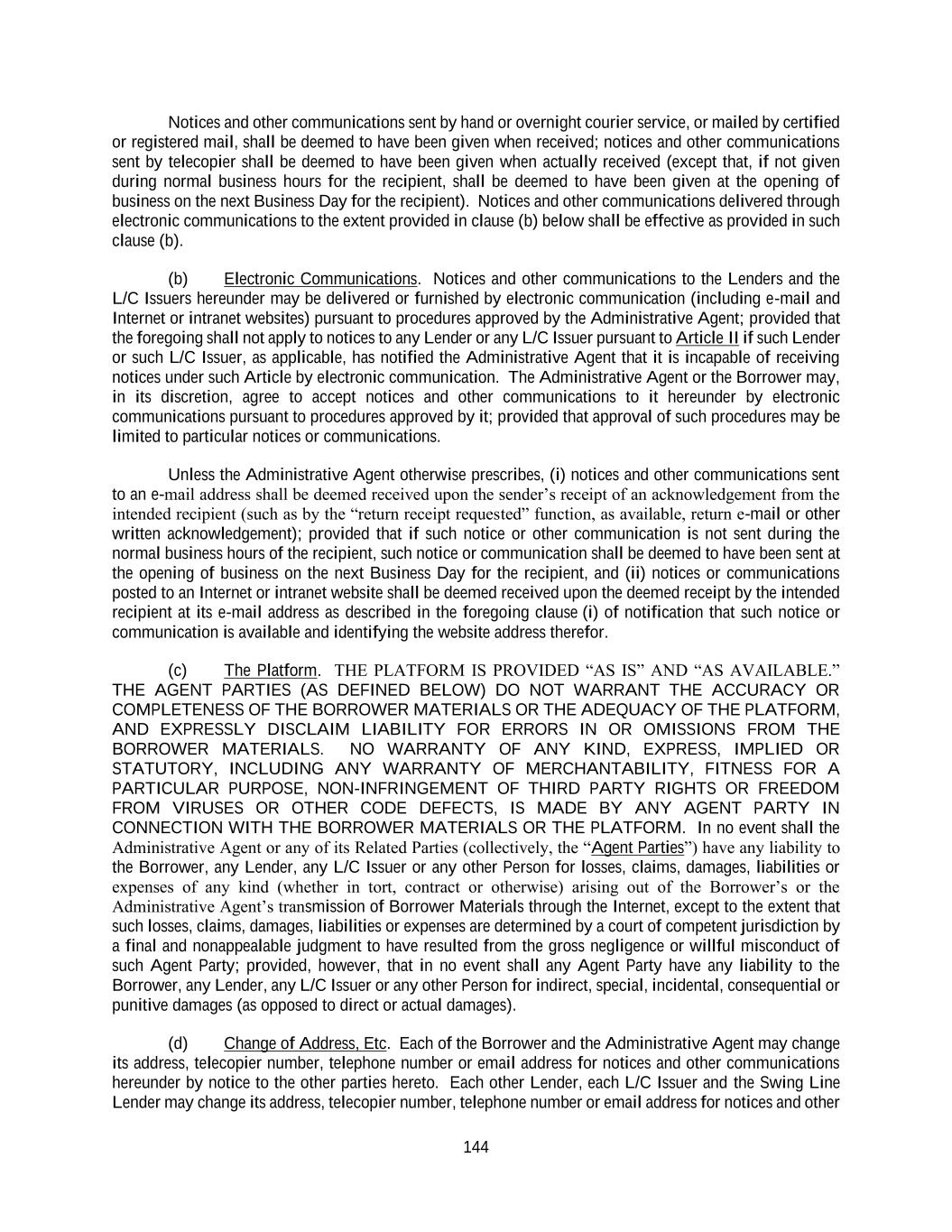 144以专人送达或隔夜快递服务方式发出的通知和其他通信,或以挂号信、挂号信方式发出的,在收到时视为已发出;以电传复印机方式发出的通知和其他通信,在实际收到时视为已发出(但未在收件人正常营业时间内发出的,在收件人下一个营业日营业时视为已发出的除外)。在下文(b)条规定的范围内通过电子通信交付的通知和其他通信,应具有该(b)条规定的效力。(b)电子通信。本协议项下向贷款人和信用证发行人发出的通知和其他通信,可以依照行政代理人批准的程序,以电子通讯方式(包括电子邮件和互联网或内网网站)送达或提供;但上述规定不适用于根据第二条向任何贷款人或任何信用证发行人发出的通知,如果该贷款人或该信用证发行人(如适用)已通知行政代理人其无法以电子通讯方式接收该条款下的通知。行政代理人或借款人可酌情同意按照其批准的程序,接受根据本协议以电子通信方式向其发出的通知和其他通信;但此种程序的批准可限于特定的通知或通信。除行政代理人另有规定外,(i)发送至电子邮件地址的通知和其他通信,在发件人收到预定收件人的确认(如通过“请求回执”功能,如可用,则视为收到回执电子邮件或其他书面确认)时视为收到;但如未在收件人的正常营业时间内发送该通知或其他通信,则该通知或通信应视为在收件人的下一个营业日营业时已发送,(ii)张贴在互联网或内联网网站上的通知或通讯,如上述通知第(i)条所述的预期收件人在其电子邮件地址当作收到通知或通讯时,即视为已收到该通知或通讯,并指明该通知或通讯的网站地址。(c)平台。该平台按“原样”和“可用”提供。代理当事人(定义如下)不对借款人材料的准确性或完整性或平台的充分性进行保证,对借款人材料中的错误或遗漏明示免责。任何代理方不得就借款方材料或平台作出任何形式的明示、暗示或法定保证,包括任何关于适销性、特定目的适当性、不侵犯第三方权利或免受病毒或其他代码缺陷影响的保证。在任何情况下,行政代理人或其任何关联方(统称“代理当事人”)均不得就借款人或行政代理人通过互联网传送借款人材料所引起的损失、索赔、损害、责任或任何种类的费用(不论是侵权、合同或其他方面的)对借款人、任何贷款人、任何信用证发行人或任何其他人承担任何责任,但该等损失、索赔、损害、责任或费用由有管辖权的法院通过最终且不可上诉的判决确定为该代理方的重大过失或故意不当行为所致;但条件是,在任何情况下,任何代理方均不得就间接、特殊、附带、后果性或惩罚性损害(而不是直接或实际损害)对借款人、任何贷款人、任何信用证发行人或任何其他人承担任何责任。(d)地址变更等。借款人和行政代理人可以通知其他当事人的方式变更本协议项下通知和其他通信的地址、电传复印号码、电话号码或电子邮件地址。互为出借人、各信用证发行人和周转线出借人可变更其地址、电传复印号码、通知电话或电子邮件地址等其他