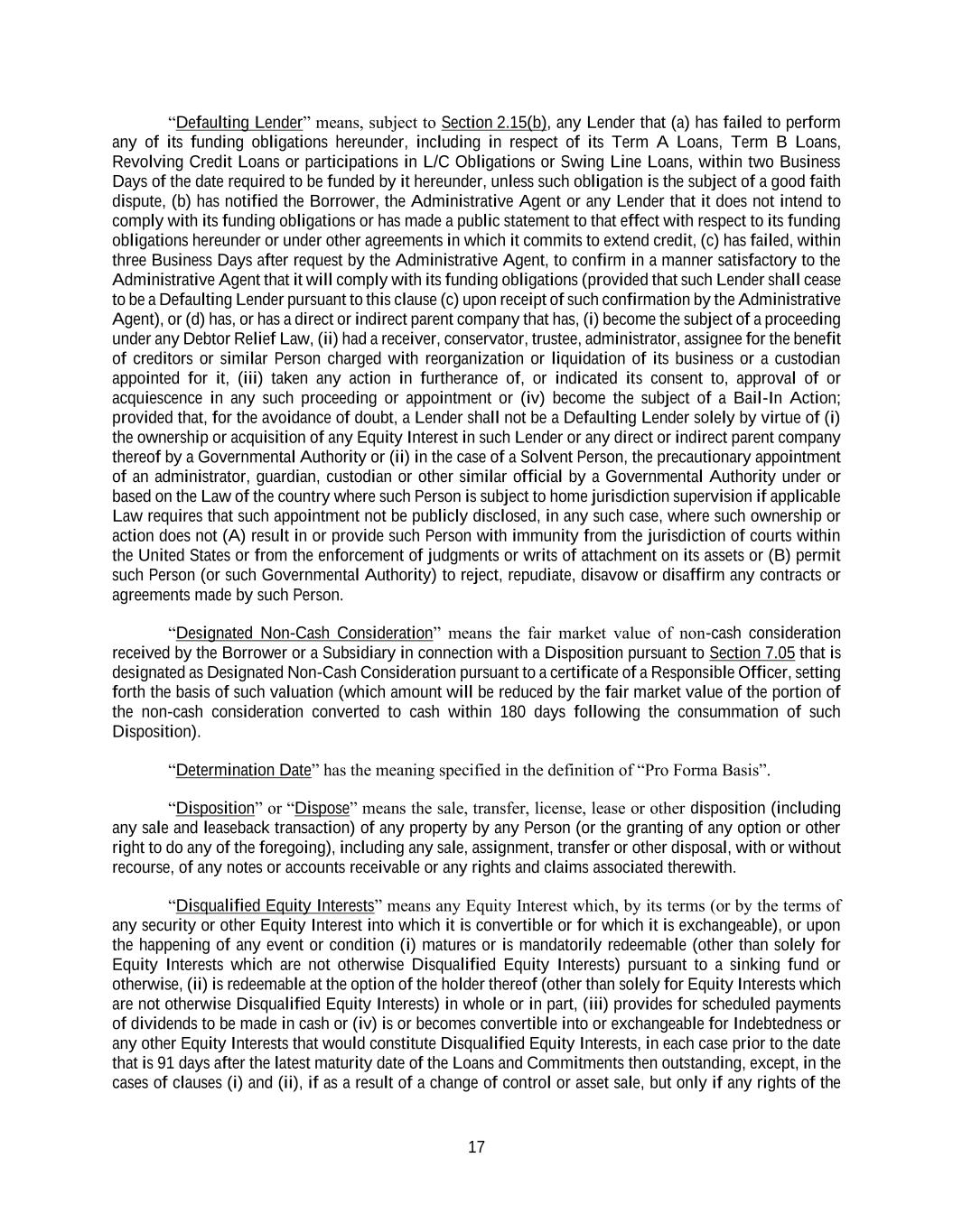 17“违约贷款人”是指,在不违反第2.15(b)节的情况下,任何贷款人(a)未能履行其在本协议项下的任何筹资义务,包括其A期贷款、B期贷款、循环信用贷款或参与信用证债务或周转额度贷款,在其根据本协议要求提供资金之日起两个营业日内,除非该债务是善意争议的标的,(b)已通知借款人,行政代理人或任何贷款人表示,其不打算遵守其资金义务,或已就其根据本协议或根据其承诺提供信贷的其他协议承担的资金义务作出大意如此的公开声明,(c)在行政代理人提出请求后三个营业日内未能,以行政代理人满意的方式确认其将遵守其筹资义务(但该贷款人在收到行政代理人的此种确认后,即根据本条款(c)款不再是违约贷款人),或(d)拥有或拥有一家直接或间接的母公司,该母公司已(i)成为任何债务人救济法下的程序的主体,(ii)为债权人或被控对其业务进行重组或清算的类似人员或为其指定的托管人的利益而拥有接管人、保管人、受托人、管理人、受让人,(iii)采取任何行动以促进或表明其同意、批准或默许任何该等法律程序或委任,或(iv)成为保释诉讼的标的;但为免生疑问,贷款人不得仅凭(i)政府当局拥有或取得该贷款人或其任何直接或间接母公司的任何股权,或(ii)如属偿付能力人,则须审慎委任管理人、监护人,如果适用法律要求不公开披露此种任命,在任何此种情况下,此种所有权或行动不会(a)导致或提供此种人不受美国境内法院管辖权或对其资产执行判决或扣押令状的豁免,或(b)允许此种人(或此种政府当局)拒绝、否定,则政府当局根据或基于此种人受本国管辖监督的国家的法律指定的监护人或其他类似官员,否认或否认该人订立的任何合约或协议。“指定非现金对价”是指借款人或子公司根据第7.05条就处置收到的非现金对价的公允市场价值,该非现金对价根据负责人员的证明被指定为指定非现金对价,其中载明了该估值的基础(该金额将减去在该处置完成后180天内转换为现金的非现金对价部分的公允市场价值)。“确定日期”具有“备考基准”定义中规定的含义。“处置”或“处置”是指任何人对任何财产的出售、转让、许可、租赁或其他处置(包括任何售后回租交易)(或授予任何选择权或其他权利以进行上述任何一项),包括任何出售、转让、转让或其他处置,无论是否有追索权,任何票据或应收账款或与之相关的任何权利和债权。“不合格股权”是指任何股权,根据其条款(或根据其可转换或可交换的任何证券或其他股权的条款),或在任何事件或条件(i)发生时到期或根据偿债基金或其他方式强制赎回(但仅用于不是其他不合格股权的股权),(ii)可由其持有人选择全部或部分赎回(仅用于不是其他不合格股权的股权除外),(iii)就按计划以现金支付股息作出规定,或(iv)可或可转换为或可交换债务或任何其他将构成不合格股权的股权,在每宗个案中,均在当时未偿还的贷款及承诺的最后到期日后91天的日期之前,但在第(i)及(ii)条的情况下,如由于控制权变更或资产出售,但仅限于该等任何权利的情况下