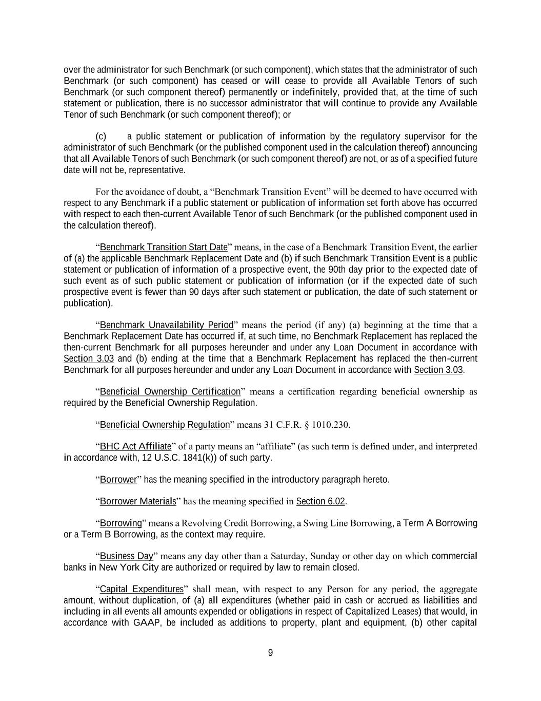 9超过此种基准(或此种组成部分)的管理人,其中说明此种基准(或此种组成部分)的管理人已停止或将停止永久或无限期地提供此种基准(或其此种组成部分)的所有可用期限,但条件是,在此种声明或公布时,没有继任管理人将继续提供此类基准(或其此类组成部分)的任何可用期限;或(c)监管主管为此类基准(或其计算中使用的已发布组成部分)的管理人发表公开声明或公布信息,宣布此类基准(或其此类组成部分)的所有可用期限不具有代表性,或截至指定的未来日期将不具有代表性。为免生疑问,如果就该基准的每个当时可用期限(或计算该期限时使用的已公布部分)发生了上述公开声明或信息的公布,则将被视为就任何基准发生了“基准过渡事件”。“基准过渡开始日期”是指,在基准过渡事件的情况下,(a)适用的基准替换日期和(b)如果该基准过渡事件是公开声明或发布预期事件的信息,则为该事件的预期日期截至该公开声明或发布信息之日前第90天(或如果该预期事件的预期日期在该声明或发布后少于90天,则为该声明或发布日期)中较早者。“基准不可用期间”是指(如有的话)(a)自基准更换日期发生之时开始的期间,如果此时没有根据第3.03节和(b)节为本协议项下和根据任何贷款文件项下的所有目的更换基准当时的基准,并且在根据第3.03节为本协议项下和根据任何贷款文件项下的所有目的更换基准当时的基准时结束。“实益所有权证明”是指《实益所有权条例》要求的关于实益所有权的证明。“实益所有权监管”是指31 C.F.R. § 1010.230。一方的“BHC Act Affiliate”是指该方的“关联方”(该术语在12 U.S.C. 1841(k)下定义并根据其解释)。“借款人”具有本协议引言段落中规定的含义。“借款人材料”具有第6.02条规定的含义。“借款”是指循环信用借款、周转额度借款、期限A借款或期限B借款,视文意而定。“营业日”是指除周六、周日或法律授权或要求纽约市商业银行继续关闭的其他日子以外的任何一天。“资本支出”是指,就任何人而言,在任何时期,(a)所有支出(无论是以现金支付还是作为负债应计,在所有情况下都包括与资本化租赁有关的所有支出或义务)的总额,不重复,根据公认会计原则,这些支出将被列为不动产、厂房和设备的增加,(b)其他资本