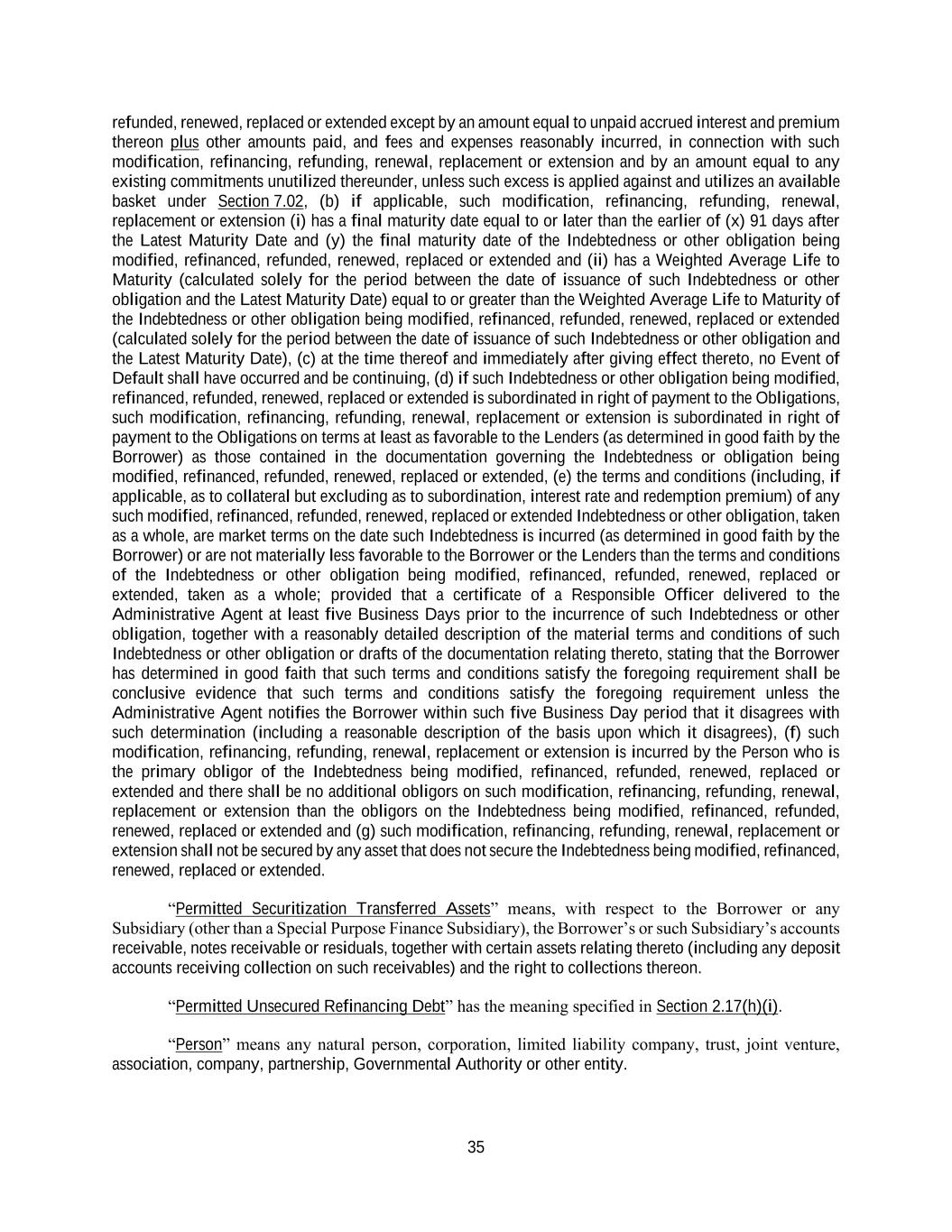 35退还、续期、替换或延期,但与此种修改、再融资、退款、续期、替换或延期有关的未付应计利息和溢价加上已支付的其他金额以及合理产生的费用和开支,以及与此种修改、再融资、退款、续期、替换或延期有关的金额相等的任何现有承付款项,除非此种超额部分适用于并利用第7.02条规定的可用篮子,(b)款如适用,此种修改、再融资、退款、续期,置换或展期(i)的最终到期日等于或晚于(x)最近到期日后91天和(y)债务或其他义务被修改、再融资、退还、续期、替换或展期的最终到期日中较早者,以及(ii)的加权平均到期日(仅计算该债务或其他义务的发行日与最近到期日之间的期间)等于或大于债务或其他义务被修改、再融资、退还、续期的加权平均到期日,置换或展期(仅计算该等债务或其他义务的发行日至最近到期日之间的期间),(c)在该债务或其他义务发行时及紧接其生效后,不得发生任何违约事件且仍在继续,(d)如该等债务或其他义务被修改、再融资、退还、展期、替换或展期在受付权上从属于该等债务,则该等修改、再融资、退还、展期,置换或延期在受偿权上从属于债务,其条款至少与有关债务或债务被修改、再融资、退还、续期、替换或延期的文件所载的条款(由借款人善意确定)相同,(e)任何此类经修改、再融资、退还、续期、替换或延期的债务或其他义务的条款和条件(如适用,包括关于抵押品,但不包括关于从属地位、利率和赎回溢价),作为一个整体,是在该等债务发生之日(由借款人善意确定)的市场条款,或对借款人或贷款人的有利程度不低于整体上修改、再融资、退款、续期、替换或延长的债务或其他义务的条款和条件;但须在该等债务或其他义务发生前至少五个营业日交付给行政代理人的负责人员的证明,连同对此种债务的重要条款和条件的合理详细描述或与此有关的其他义务或文件草稿,说明借款人已善意地确定此类条款和条件满足前述要求,应为此类条款和条件满足前述要求的确凿证据,除非行政代理人在该五个营业日期间内通知借款人其不同意该确定(包括对其不同意的依据进行合理描述),(f)此类修改、再融资、退款、展期,置换或展期是由被修改、再融资、退还、续期、置换或展期的债务的主要义务人发生的,且该等修改、再融资、退还、续期、置换或展期的义务人不得多于被修改、再融资、退还、续期、置换或展期的债务的义务人,且(g)该等修改、再融资、退还、续期、置换或展期不得以不担保被修改、再融资、续期、置换或展期的债务的任何资产作担保。“许可证券化转让资产”是指,就借款人或任何附属公司(特殊目的融资附属公司除外)而言,借款人或该附属公司的应收账款、应收票据或剩余款,连同与之相关的某些资产(包括就该等应收款项接受收款的任何存款账户)及其收款权利。“获准无担保再融资债务”具有第2.17(h)(i)节规定的含义。“人”是指任何自然人、公司、有限责任公司、信托、合营企业、协会、公司、合伙企业、政府机关或其他实体。