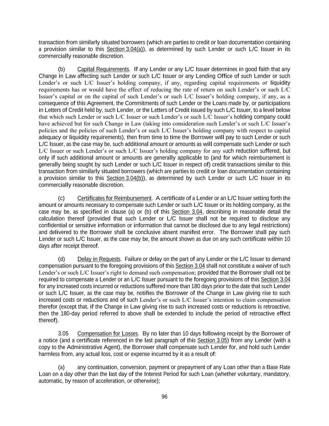 96来自类似情况的借款人(这些借款人是载有类似于本节3.04(a)的规定的信贷或贷款文件的当事人)的交易,由此类贷款人或此类信用证发行人在其商业上合理的酌处权确定。(b)资本要求。如任何贷款人或任何信用证发行人善意地确定影响该贷款人或该信用证发行人或该贷款人或该贷款人或该信用证发行人的控股公司的任何贷款办公室(如有)有关资本要求或流动性要求的任何法律变更已经或将产生降低该贷款人或该信用证发行人的资本或该贷款人或该信用证发行人的控股公司的资本回报率(如有)的影响,则由于本协议、该贷款人的承诺或由,或参与该贷款人持有的信用证或该信用证发行人签发的信用证,其水平低于该贷款人或该信用证发行人或该贷款人或该信用证发行人的控股公司本可达到的水平,但若无此类法律变更(考虑到该贷款人或该信用证发行人的政策以及该贷款人或该信用证发行人的控股公司关于资本充足率或流动性要求的政策),则借款人将不时向该贷款人或该信用证发行人付款,视情况而定,将补偿该贷款人或该信用证发行人或该贷款人或该信用证发行人的控股公司所遭受的任何该等减少的额外金额或金额,但前提是该等额外金额或金额一般适用于(且该贷款人或该信用证发行人一般正在就该等金额寻求补偿)来自类似情况的借款人(这些借款人是载有类似于本条3.04(b)款规定的信贷或贷款文件的当事人)的与本次交易类似的信贷交易,由该贷款人或该信用证发行人在其商业上合理的酌情权决定。(c)报销证明。贷款人或信用证发行人的证明书,载列根据本条第3.04条(a)或(b)款指明的向该贷款人或该信用证发行人或其控股公司(视属何情况而定)作出赔偿所需的金额或金额,并合理详细地说明其计算(但该贷款人或信用证发行人不得被要求披露任何因任何法律限制而无法披露的机密或敏感信息或信息),交付给借款人的证明,在没有明显错误的情况下,应是结论性的。借款人应在收到任何该等凭证后10天内向该贷款人或该信用证发行人(视情况而定)支付该等凭证上显示的到期金额。(d)请求延误。任何贷款人或信用证发行人未按本条第3.04条前述规定要求赔偿或迟延要求赔偿,不构成放弃该贷款人或该信用证发行人要求赔偿的权利;但不得要求借款人根据本条第3.04条前述规定向贷款人或信用证发行人赔偿在该贷款人或该信用证发行人(视情况而定)的日期前180天以上发生的任何增加的费用或遭受的任何减少,通知借款人导致此类增加的费用或减少的法律变更以及此类贷款人或此类信用证发行人打算就此要求赔偿的情况(但如果导致此类增加的费用或减少的法律变更具有追溯力,则上述180天期限应予延长,以包括其追溯效力的期间)。3.05赔偿损失。在借款人收到任何贷款人的通知(以及本条第3.05条最后一款所提述的证明)后不迟于10天内(连同一份抄送行政代理人的副本),借款人应赔偿该贷款人,并使该贷款人免受其因以下原因而招致的任何实际损失、成本或开支:(a)基准利率贷款以外的任何贷款在该贷款的利息期最后一天以外的任何一天(不论是自愿、强制、自动,由于加速,或其他原因);