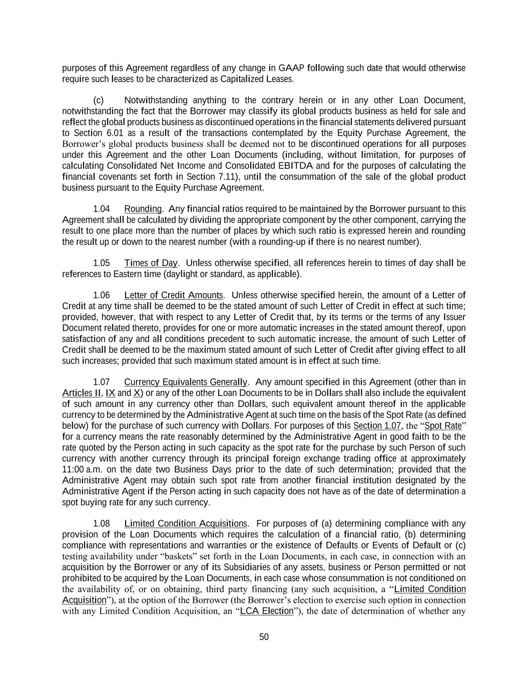 本协议的50个目的,无论在该日期之后GAAP发生任何变化,否则将要求将此类租赁定性为资本化租赁。(c)尽管本文或任何其他贷款文件中有任何相反的规定,尽管由于股权购买协议所设想的交易,借款人可将其全球产品业务归类为持有待售,并在根据第6.01节交付的财务报表中将全球产品业务反映为已终止经营,但就本协议和其他贷款文件(包括但不限于,为计算合并净收益和合并EBITDA以及为计算第7.11节规定的财务契约),直至根据股权购买协议完成出售全球产品业务。1.04四舍五入。借款人根据本协议要求保持的任何财务比率,应通过将适当的组成部分除以另一组成部分计算,将结果带到比此处表示该比率的地方数多一个地方,并将结果向上或向下四舍五入到最接近的数字(如果没有最接近的数字,则四舍五入)。每日1.05次。除非另有说明,本文对一天中时间的所有引用均应是对东部时间的引用(如适用,为日光或标准时间)。1.06信用证金额。除本文另有规定外,信用证在任何时候的金额均应被视为在该时间有效的该信用证的规定金额;但条件是,就任何信用证而言,根据其条款或与之相关的任何发行人文件的条款,规定在满足该自动增加的任何和所有先决条件后,对其规定的金额进行一次或多次自动增加,该信用证的金额在所有该等增加生效后,应被视为该信用证的最高规定金额;但该最高规定金额在该时间有效。1.07货币等价物一般。本协议(第II、IX和X条除外)或任何其他贷款文件中规定的以美元为单位的任何金额,还应包括以美元以外的任何货币为单位的该金额的等值金额,该金额以适用货币为单位的等值金额,由行政代理人在该时间根据以美元购买该货币的即期汇率(定义见下文)确定。为施行本条第1.07款,一种货币的“即期汇率”是指行政代理人善意合理确定的汇率,为该人以该身份通过其主要外汇交易场所于该确定之日前两个营业日上午11:00左右以另一种货币购买该货币的即期汇率所报的汇率;但该行政代理人可以从该行政代理人指定的其他金融机构取得该即期汇率如果以该身份行事的人截至确定之日没有任何此类货币的即期买入汇率。1.08有限条件收购。为(a)确定遵守贷款文件中要求计算财务比率的任何规定,(b)确定遵守陈述和保证或存在违约或违约事件,或(c)在贷款文件中规定的“篮子”下测试可用性,在每种情况下,与借款人或其任何子公司收购贷款文件允许或不禁止获得的任何资产、业务或个人有关,在每种情况下,其完成不以是否获得或获得为条件,第三方融资(任何该等收购,“有限条件收购”),根据借款人的选择(借款人选择就任何有限条件收购行使该选择权,“LCA选择”),确定是否有
