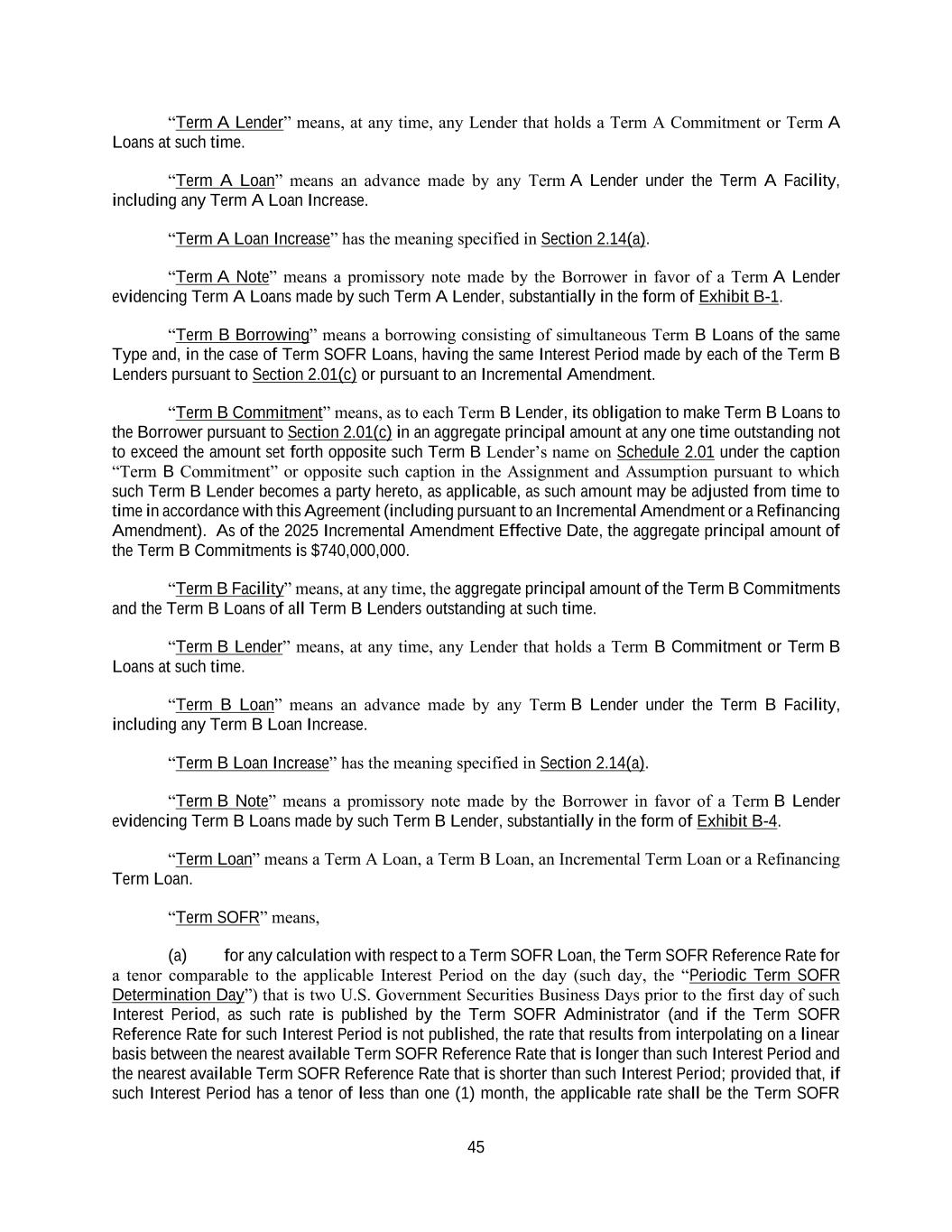 45“期限A贷款人”是指在任何时候持有期限A承诺或期限A贷款的任何贷款人。“A期贷款”是指任何A期贷款人根据A期贷款提供的预付款,包括任何A期贷款增加。“期限A贷款增加”具有第2.14(a)节规定的含义。“期限A票据”是指借款人以期限A贷款人为受益人、证明该期限A贷款人提供的贷款的本票,基本上以附件 B-1的形式存在。“B期借款”是指由同一类型的同步B期贷款组成的借款,在SOFR定期贷款的情况下,每个B期贷款人根据第2.01(c)节或根据增量修订作出的利息期限相同。“B期承诺”是指,就每个B期贷款人而言,其根据第2.01(c)节向借款人提供的B期贷款的义务,在任何一次未偿还的本金总额不超过附表2.01上该B期贷款人在“B期承诺”标题下的名称对面或该B期贷款人成为本协议一方的转让和假设中的该标题对面所规定的金额(如适用),作为该等金额可根据本协议(包括根据增量修订或再融资修订)不时作出调整。截至2025年增量修正生效日期,B期承诺的本金总额为740,000,000美元。“B期贷款”是指在任何时候,所有B期贷款人在该时间未偿还的B期承诺和B期贷款的本金总额。“B期贷款人”是指在任何时候持有B期承诺或B期贷款的任何贷款人。“B期贷款”是指任何B期贷款人根据B期融资进行的垫款,包括任何B期贷款增加。“B期贷款增加”具有第2.14(a)节规定的含义。“B期票据”是指借款人以B期贷款人为受益人、证明该B期贷款人所作B期贷款的本票,其主要形式为附件 B-4。“定期贷款”是指A期贷款、B期贷款、增量定期贷款或再融资定期贷款。“定期SOFR”是指,(a)就定期SOFR贷款进行的任何计算,与该利息期首日(该日,“定期SOFR确定日”)的适用利息期相当的期限的定期SOFR参考利率为该利息期首日之前的两个美国政府证券营业日,因为该利率由定期SOFR管理人公布(如果该利息期的定期SOFR参考利率未公布,比该计息期更长的最接近的可用期限SOFR参考利率与比该计息期更短的最接近的可用期限SOFR参考利率之间的线性插值所产生的利率;但如果该计息期的期限少于一(1)个月,则适用的利率为期限SOFR
