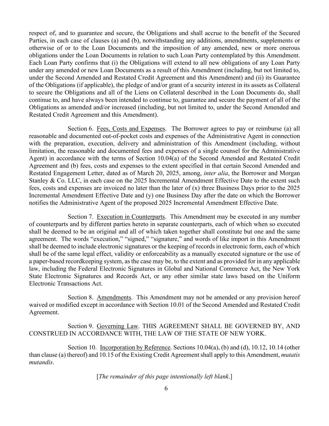 6尊重、担保和担保这些义务,并且在(a)和(b)条的每一情况下,应为有担保当事人的利益而产生,尽管贷款文件有任何增加、修订、补充或其他内容,或对贷款文件施加任何经修订、新的或更繁重的义务,并且根据贷款文件对本修正案所设想的与该贷款方有关的义务。各贷款方确认,(i)债务将延伸至任何贷款方因本修订而在任何经修订或新的贷款文件下的所有新债务(包括但不限于根据第二次经修订和重述的信贷协议和本修订),以及(ii)其对债务的担保(如适用)、质押和/或授予其资产上的担保权益作为担保债务的担保物以及贷款文件中所述的对担保物的所有留置权,应继续,并且一直打算继续,担保和担保支付经修订和/或增加的所有义务(包括但不限于根据第二次经修订和重述的信贷协议和本修订)。第6节。费用、成本和开支。借款人同意根据第二份经修订和重述的信贷协议第10.04(a)节的条款支付或偿还(a)行政代理人与准备、执行、交付和管理本修正案有关的所有合理和有文件证明的自付费用和开支(包括但不限于行政代理人的单一律师的合理和有文件证明的费用和开支)和(b)截至2025年3月20日的某些第二份经修订和重述的聘书中规定的范围内的费用、成本和开支,除其他外,借款人和摩根士丹利 & Co. LLC,在每种情况下,在2025年增量修订生效日期,只要这些费用、成本和开支不迟于2025年增量修订生效日期之前的(x)三个工作日和(y)借款人将拟议的2025年增量修订生效日期通知行政代理人之日之后的一个工作日(以较晚者为准)开具发票。第7节。在对口部门执行。本修正案可在任意数目的对应方中执行,也可由不同的对应方在不同的对应方中执行,每一方在如此执行时应被视为正本,所有这些内容加在一起构成的只是一份相同的协议。“执行”、“签名”、“签名”等字样和本修正案中具有相同重要性的词语应被视为包括电子签名或以电子形式保存记录,每一项均应在任何适用法律(包括《全球和国家商务联邦电子签名法》、《纽约州电子签名和记录法》或基于《统一电子交易法》的任何其他类似州法律的范围内和规定的范围内,与手工执行的签名或使用纸质记录系统(视情况而定)具有相同的法律效力、有效性或可执行性。第8节。修正。除非根据第二份经修订和重述的信贷协议第10.01条,否则不得修改本修订或放弃或修改本协议的任何条款。第9节。管辖法律。本协议应受纽约州法律管辖,并根据纽约州法律进行构建。第10节。以引用方式并入。现有信贷协议第10.04(a)、(b)及(d)条、第10.12、10.14条(其中(a)条除外)及第10.15条须作比照适用于本修订。【本页其余部分有意留白】
