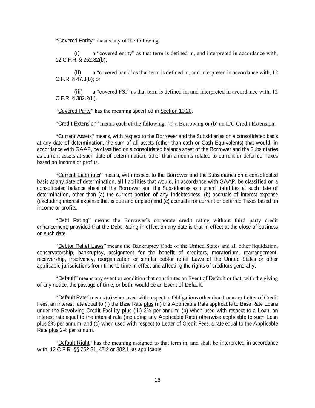 16“涵盖实体”是指以下任一情形:(i)“涵盖实体”,该术语在12 C.F.R. § 252.82(b)中定义并按照其解释;(ii)“涵盖银行”,因为该术语在12 C.F.R. § 47.3(b)中定义并按照其解释;或(iii)“涵盖FSI”,该术语在12 C.F.R. § 382.2(b)中定义并按照其解释。“被覆盖方”具有第10.20条规定的含义。“信用展期”是指以下各项:(a)借款或(b)信用证信用展期。“流动资产”是指,就借款人和子公司而言,在任何确定日期,根据公认会计原则,在借款人和子公司的合并资产负债表上将被归类为流动资产的所有资产(现金或现金等价物除外)的总和,但与基于收入或利润的当期或递延税项相关的金额除外。“流动负债”是指,就借款人和子公司而言,在任何确定日期,根据公认会计原则,在借款人和子公司的合并资产负债表上将在该确定日期分类为流动负债的所有负债,但(a)任何债务的流动部分,(b)应计利息费用(不包括到期未付的利息费用)和(c)基于收入或利润的当期或递延税项的应计费用除外。“债项评级”是指借款人的企业信用评级,无第三方增信;前提是在任何日期有效的债项评级为在该日期营业结束时有效的债项评级。“债务人救济法”是指美国《破产法》和所有其他清算、监管、破产、为债权人利益而转让、暂停、重新安排、接管、破产、重组或美国或其他适用法域不时生效并普遍影响债权人权利的类似债务人救济法。“违约”是指构成违约事件的任何事件或条件,或随着任何通知的发出,时间的推移,或两者兼而有之,将构成违约事件。“违约率”是指(a)就贷款或信用证费用以外的债务使用时,利率等于(i)基准利率加上(ii)循环信贷融资下适用于基准利率贷款的适用利率加上(iii)每年2%;(b)就贷款使用时,利率等于该贷款以其他方式适用的利率(包括任何适用利率)加上每年2%;(c)就信用证费用使用时,利率等于适用利率加上每年2%。“违约权”具有12 C.F.R. § 252.81、47.2或382.1(如适用)中赋予该词的含义,并应根据该含义进行解释。