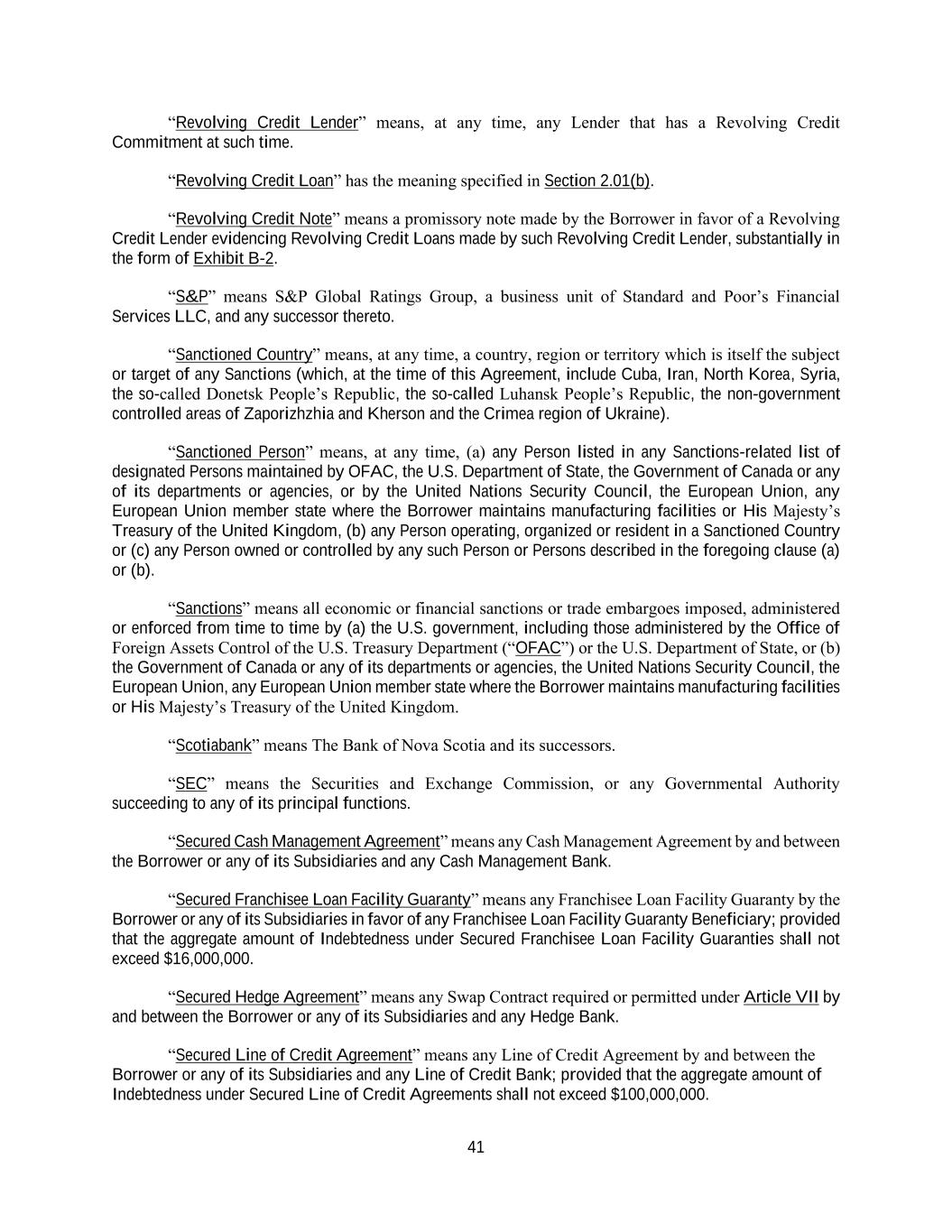 41“循环信贷贷款人”是指,在任何时候,任何在这种时候有循环信贷承诺的贷款人。“循环信用贷款”具有第2.01(b)节规定的含义。“循环信用票据”是指借款人以循环信贷贷款人为受益人、证明该循环信贷贷款人所作循环信用贷款的本票,其主要形式为附件 B-2。“标普”是指标准普尔金融服务有限责任公司(Standard and Poor’s Financial Services LLC)的业务部门标普全球评级集团及其任何继任者。“被制裁国”在任何时候都是指本身就是任何制裁对象或目标的国家、地区或领土(在本协定时,这些国家、地区或领土包括古巴、伊朗、朝鲜、叙利亚、所谓的顿涅茨克人民共和国、所谓的卢甘斯克人民共和国、扎波罗热和赫尔松的非政府控制地区以及乌克兰的克里米亚地区)。“受制裁人员”是指,在任何时候,(a)OFAC、美国国务院、加拿大政府或其任何部门或机构,或联合国安全理事会、欧盟、借款人拥有制造设施的任何欧盟成员国或英国国王陛下的财政部维持的任何与制裁相关的指定人员名单中所列的任何人,(b)在被制裁国家经营、组织或居住的任何人,或(c)由上述(a)或(b)条所述的任何此类人员或人员拥有或控制的任何人。“制裁”是指(a)美国政府不时实施、管理或执行的所有经济或金融制裁或贸易禁运,包括由美国财政部外国资产控制办公室(“OFAC”)或美国国务院管理的制裁或贸易禁运,或(b)加拿大政府或其任何部门或机构、联合国安全理事会、欧盟、借款人拥有制造设施的任何欧盟成员国或英国国王陛下的财政部。“丰业银行”是指新斯科舍银行及其继任者。“SEC”是指证券交易委员会,或接替其任何主要职能的任何政府机构。“担保现金管理协议”是指借款人或其任何子公司与任何现金管理银行之间的任何现金管理协议。“有担保的特许经营商贷款融资担保”是指借款人或其任何子公司为任何特许经营商贷款融资担保受益人提供的任何特许经营商贷款融资担保;但有担保的特许经营商贷款融资担保项下的债务总额不得超过16,000,000美元。“担保对冲协议”是指借款人或其任何子公司与任何对冲银行之间根据第七条要求或允许的任何掉期合同。“担保信贷额度协议”是指借款人或其任何子公司与任何信贷额度银行之间的任何信贷额度协议;条件是担保信贷额度协议项下的债务总额不得超过100,000,000美元。