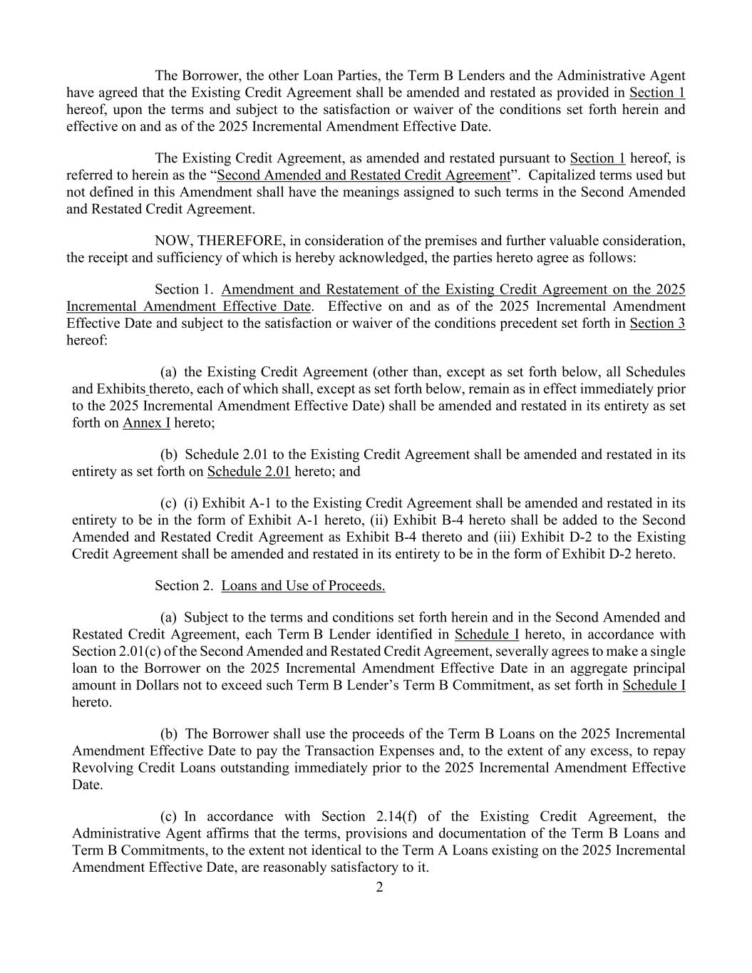 2借款人、其他贷款方、B期贷款人和行政代理人已同意,现有信贷协议应根据本协议第1节的规定,根据本协议规定的条款并在满足或放弃本协议规定的条件的前提下进行修订和重述,并自2025年增量修订生效之日起生效。根据本协议第1节修订和重述的现有信贷协议在本协议中被称为“第二次经修订和重述的信贷协议”。本修订中使用但未定义的大写术语应具有第二份经修订和重述的信贷协议中赋予此类术语的含义。现据此,考虑到房地及进一步的有价对价,特此确认其收受及充分性,双方约定如下:第一节。2025年增量修订生效日期现有信贷协议的修订及重述。自2025年增量修正生效日期起生效,并在满足或放弃本协议第3节规定的先决条件的前提下:(a)现有信贷协议(除以下所列情况外,所有附表及其附件除外,除以下所列情况外,每一附表及附件均应,如紧接2025年增量修订生效日期前一样保持有效)应按本协议附件一所述进行全部修订和重述;(b)现有信贷协议附表2.01应按本协议附表2.01所述进行全部修订和重述;(c)(i)现有信贷协议的附件附件 A-1应进行全部修订和重述,以本协议附件一的形式,(ii)本协议所含的附件 B-4应添加到第二份经修订和重述的信贷协议中,作为其所含的附件 B-4和(iii)现有信贷协议所含的附件 D-2应予以修订和重述,使其全部内容以本协议所含的附件附件 D-2的形式存在。第2节。贷款及所得款项用途。(a)在符合本协议及第二份经修订及重述信贷协议所载的条款及条件下,根据第二份经修订及重述信贷协议第2.01(c)节,本协议附表I所指明的每名B期贷款人,各自同意于2025年增量修订生效日期向借款人作出一笔本金总额不超过本协议附表I所列的该B期贷款人的B期承诺的本金总额为美元的单一贷款。(b)借款人应使用2025年增量修订生效日期的B期贷款收益支付交易费用,并在任何超额的情况下,偿还紧接2025年增量修订生效日期之前未偿还的循环信用贷款。(c)根据现有信贷协议第2.14(f)节,行政代理人申明,B期贷款和B期承诺的条款、规定和文件,在与2025年增量修正生效日期存在的A期贷款不相同的范围内,是其合理满意的。