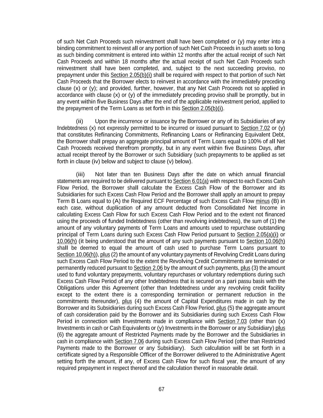 67该等现金净收益该等再投资应已完成,或(y)可订立具约束力的承诺,将该等现金净收益的全部或任何部分再投资于该等资产,只要该等具约束力的承诺在该等现金净收益实际收到后12个月内及该等现金净收益实际收到后18个月内订立,该等再投资应已完成,且在符合下一个后续但书的情况下,对于借款人根据紧接前一条款(x)或(y)选择再投资的这部分净现金收益,无需根据本条第2.05(b)(i)款提前还款;但进一步规定,任何未根据紧接前一但书(x)或(y)款如此适用的净现金收益应迅速但无论如何在适用的再投资期结束后五个工作日内适用于本条第2.05(b)(i)款规定的定期贷款的提前还款。(ii)在借款人或其任何附属公司发生或发行任何根据第7.02或(y)条未明确准许发生或发行的构成再融资承诺、再融资贷款或再融资等值债务的债务(x)时,借款人应立即预付相当于从其收到的所有现金收益净额的100%的定期贷款本金总额,但无论如何应在五个营业日内,在借款人或该附属公司实际收到后(以下第(iv)款所述并在符合以下第(v)款的情况下适用的预付款项)。(iii)不迟于根据第6.01(a)节就每个超额现金流期要求交付年度财务报表之日起十个营业日内,借款人应计算借款人及其子公司在该超额现金流期的超额现金流量,借款人应应用等于(a)所需的该超额现金流量的百分比减去(b)的B期贷款预付款项的金额,不重复计算该超额现金流期超额现金流量时从合并净收益中扣除的任何金额,且在未使用已融资债务(循环债务除外)收益融资的范围内,(1)根据第2.05(a)(i)或10.06(h)条在该超额现金流期内自愿支付定期贷款的金额和用于回购未偿还定期贷款本金的金额之和(但有一项理解,即根据第10.06(h)条支付的任何此类款项的金额应被视为等于根据第10.06(h)条购买定期贷款所使用的现金金额),加上(2)根据第2.06条终止或永久减少循环信贷承诺的循环信贷贷款在该超额现金流期内的任何自愿付款的金额,再加上(3)用于为自愿预付款提供资金的金额,在此种超额现金流期内自愿回购或自愿赎回与本协议项下义务同等权益担保的任何其他债务(任何循环信贷额度下的债务除外,除非相应终止或永久减少项下的承诺),加上(4)借款人及其子公司在此种超额现金流期内以现金支付的资本支出金额,加上(5)借款人及其子公司在该超额现金流期内就遵守第7.03条作出的投资((x)现金或现金等价物投资或(y)对借款人或任何子公司的投资除外)支付的现金对价总额加上(6)借款人及其子公司在该超额现金流期内按照第7.06条以现金作出的限制性付款总额(对借款人或任何子公司作出的限制性付款除外)。此类计算将在一份由借款人的一名负责官员签署的交付给行政代理人的证明中列出,其中列出该财政年度的超额现金流量金额(如有)、任何所需预付款项的金额以及合理详细的计算。