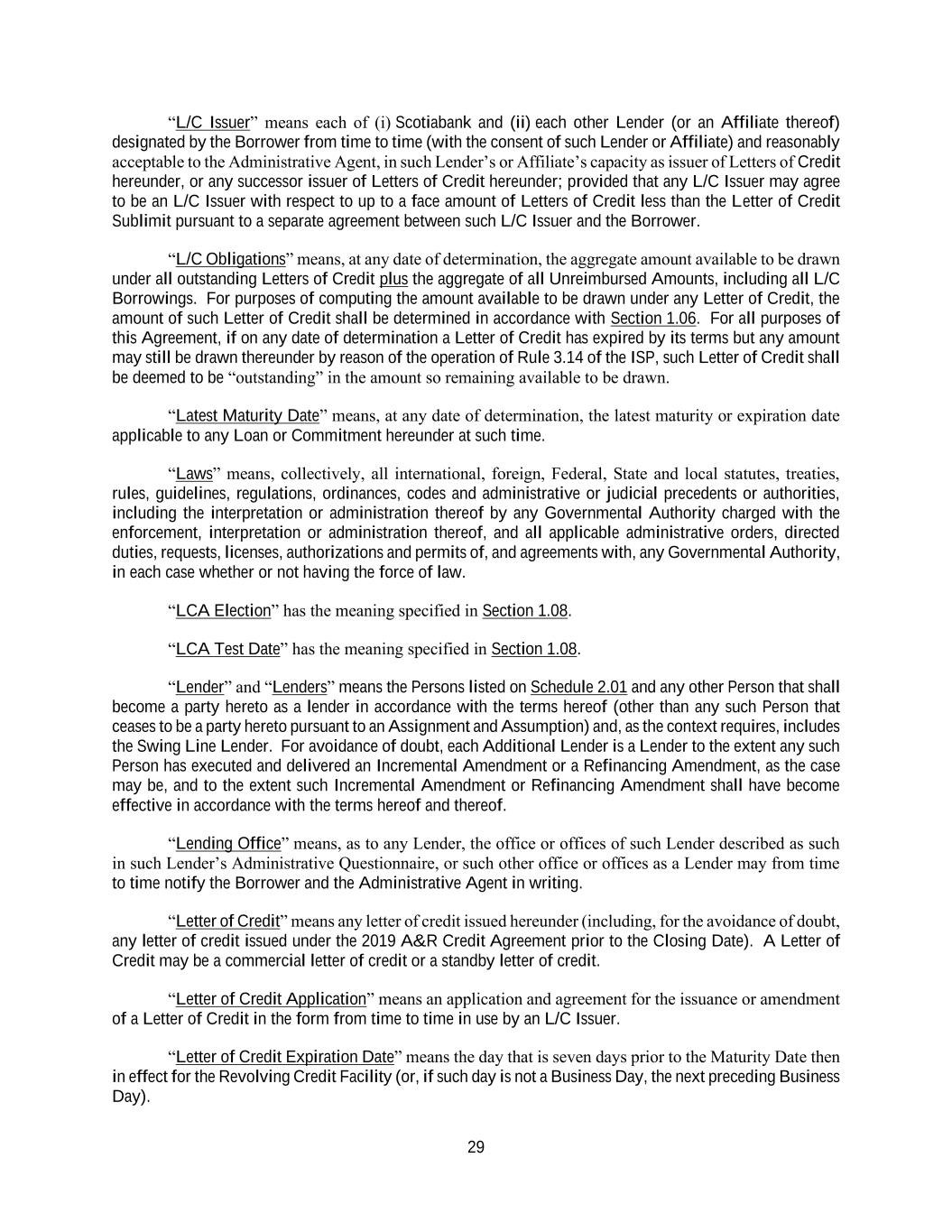 29“信用证发行人”是指(i)丰业银行和(ii)借款人不时(经该贷款人或关联公司同意)指定并为行政代理人合理接受的(以该贷款人或关联公司作为本协议项下信用证发行人的身份)彼此贷款人(或其关联公司)中的每一个,或本协议项下信用证的任何后续开证人;但任何信用证开证人可根据该信用证开证人与借款人之间的单独协议约定,就不超过信用证分限额的面额的信用证作为信用证开证人。“信用证义务”是指,在任何确定日期,所有未偿信用证项下可供提取的总金额加上所有未偿还金额的总和,包括所有信用证借款。为计算任何信用证项下可供提取的金额,该信用证的金额应根据第1.06节确定。就本协议的所有目的而言,如果在任何确定日期,信用证已按其条款到期,但由于ISP规则3.14的运作,仍可根据该条款提取任何金额,则该信用证应被视为剩余可提取金额中的“未结清”。“最晚到期日”是指在任何确定日期,在该时间适用于本协议项下任何贷款或承诺的最晚到期日或到期日。“法律”统称为所有国际、外国、联邦、州和地方法规、条约、规则、指导方针、条例、法令、法典和行政或司法先例或当局,包括由负责执行、解释或管理其的任何政府当局解释或管理其,以及任何政府当局的所有适用行政命令、指示职责、请求、许可、授权和许可,以及与其达成的协议,在每种情况下,无论是否具有法律效力。“LCA选举”具有第1.08条规定的含义。“LCA测试日期”具有第1.08节规定的含义。“贷款人”和“贷款人”是指附表2.01所列人员以及根据本协议条款应作为贷款人成为本协议一方的任何其他人员(根据转让和假设不再是本协议一方的任何此类人员除外),并根据上下文要求,包括周转线贷款人。为免生疑问,在任何该等人已签立及交付增量修订或再融资修订(视属何情况而定)的范围内,每名额外贷款人均为贷款人,且在该等增量修订或再融资修订已根据本协议及其条款生效的范围内。“出借处”是指,就任何贷款人而言,该贷款人的行政调查问卷中所描述的该贷款人的一个或多个办事处,或作为贷款人的其他一个或多个办事处可能不时以书面通知借款人和行政代理人。“信用证”指根据本协议签发的任何信用证(为免生疑问,包括在截止日期之前根据2019年A & R信用协议签发的任何信用证)。信用证可以是商业信用证,也可以是备用信用证。“信用证申请”是指信用证开证人不时使用的关于开具或修改信用证格式的申请和协议。“信用证到期日”指循环信贷融资当时有效的到期日(或,如该日不是营业日,则为前一个营业日)的第7天之前的那一天。