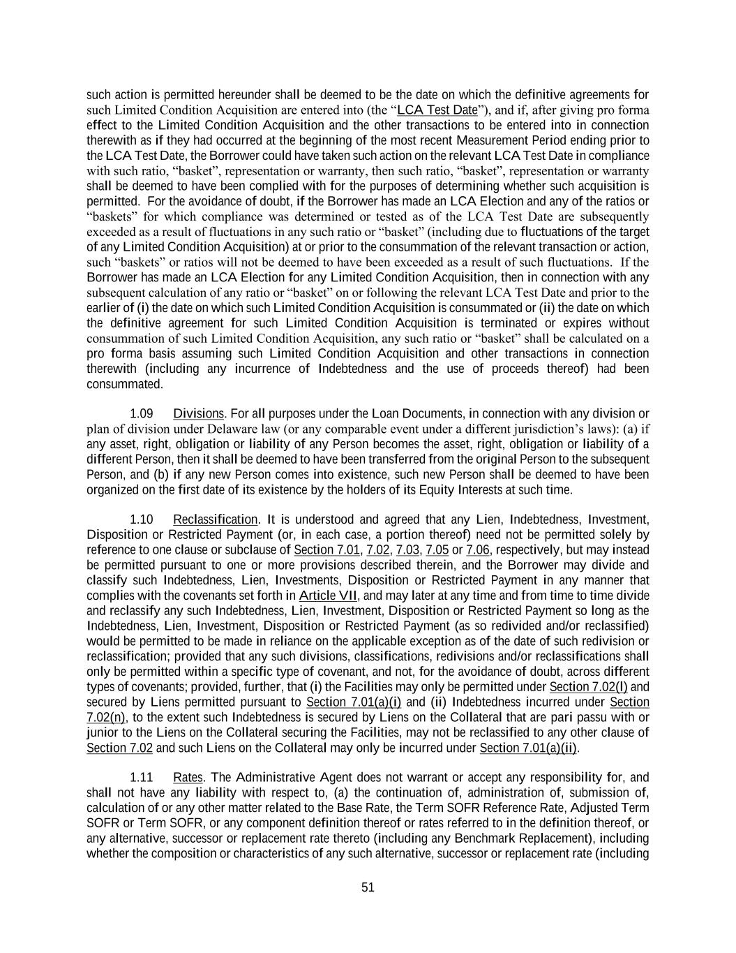 51本协议项下允许的该等行动应被视为就该等有限条件收购订立最终协议的日期(“LCA测试日期”),且如果在给予有限条件收购及将就该等收购订立的其他交易形式上的影响后,如同它们发生在截止于LCA测试日期之前的最近一个计量期开始时一样,借款人本可在相关的LCA测试日期根据该等比率、“篮子”、陈述或保证采取该等行动,则该比率,“篮子”、陈述或保证应被视为已得到遵守,以确定是否允许此类收购。为免生疑问,如借款人已作出LCA选择,且由于在相关交易或行动完成时或之前任何该等比率或“篮子”的波动(包括由于任何有限条件收购的目标的波动),随后超出截至LCA测试日期为其确定或测试的合规性的任何该等比率或“篮子”,则该等“篮子”或“比率”将不会被视为因该等波动而超出。如借款人已就任何有限条件收购作出LCA选择,则就任何其后于相关LCA测试日期或之后且在(i)该等有限条件收购完成之日或(ii)该等有限条件收购的最终协议终止或到期而该等有限条件收购未完成之日(以较早者为准)之前的任何比率或“一篮子”的计算而言,任何该等比率或“一篮子”须在假设该等有限条件收购及与之有关的其他交易(包括任何债务的产生及其所得款项用途)已完成的情况下,按备考基准计算。1.09司。就贷款文件项下的所有目的而言,就特拉华州法律下的任何分立或分立计划(或不同司法管辖区法律下的任何类似事件)而言:(a)如果任何人的任何资产、权利、义务或负债成为另一人的资产、权利、义务或负债,则应视为已从原始人转移至随后的人,以及(b)如果任何新的人出现,该等新人应被视为在其存在的第一个日期被其股权持有人在该时间组织。1.10重新分类。据了解并同意,任何留置权、债务、投资、处分或受限制的付款(或在每种情况下,其中的一部分)不必仅通过分别提及第7.01、7.02、7.03、7.05或7.06节的一个条款或分款而被允许,而是可以根据其中所述的一项或多项条款被允许,借款人可以按照符合第七条所述契约的任何方式对此类债务、留置权、投资、处分或受限制的付款进行划分和分类,并且可以在以后的任何时间并不时对任何此类债务、留置权、投资、处分或限制性付款进行划分和重新分类,只要该债务、留置权、投资、处分或限制性付款(如此重新划分和/或重新分类)将被允许依据截至该重新划分或重新分类之日的适用例外情况进行;但任何此类划分、分类、重新划分和/或重新分类仅应在特定类型的契诺内允许,而为免生疑问,不得跨越不同类型的契诺;此外,但前提是,(i)该等融资只可根据第7.02(l)条获准,并可根据第7.01(a)(i)及(ii)条所准许的留置权作为担保,但如该等债务是由与担保该等融资的抵押品上的留置权同等权益或低于该抵押品上的留置权所担保,则不得重新分类至第7.02条的任何其他条款,而该抵押品上的该等留置权只可根据第7.01(a)(ii)条招致。1.11利率。行政代理人不保证或接受任何责任,也不应对以下方面承担任何责任:(a)延续、管理、提交、计算或任何其他与基本利率、定期SOFR参考利率、调整后的定期SOFR或定期SOFR有关的事项,或其任何组成部分定义或其定义中提及的费率,或其任何替代、继承或替代率(包括任何基准替代),包括任何此类替代、继承或替代率的组成或特征(包括
