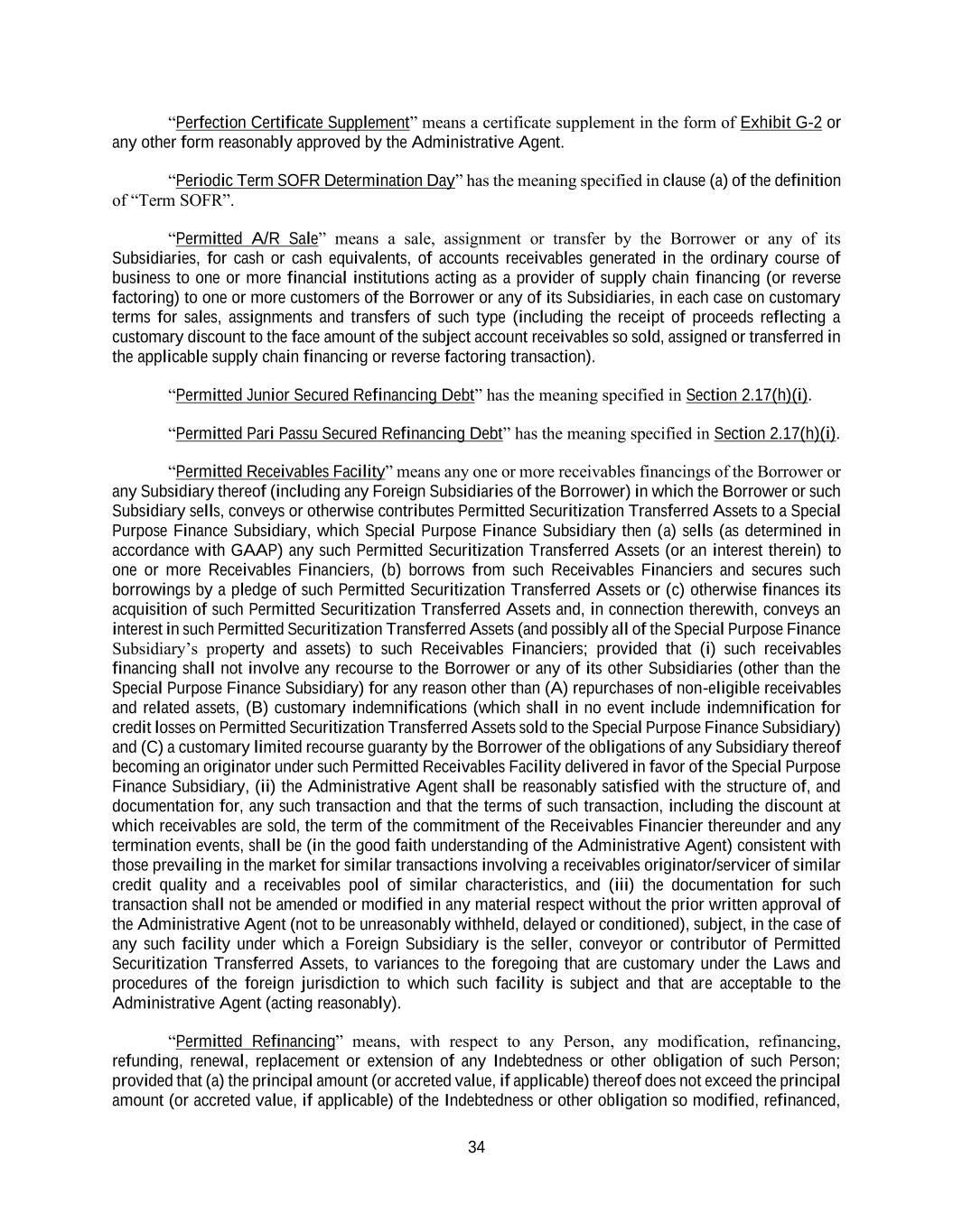 34“Perfection Certificate Supplement”是指以附件 G-2或行政代理人合理认可的任何其他形式的证书补充。“定期期限SOFR确定日”具有“期限SOFR”定义(a)条规定的含义。“允许的A/R出售”是指借款人或其任何子公司将在正常业务过程中产生的应收账款以现金或现金等价物出售、转让或转让给一家或多家金融机构,作为向借款人或其任何子公司的一名或多名客户提供供应链融资(或反向保理)的提供者,在每种情况下均按此类类型的销售、转让和转让的惯常条款(包括收到反映如此出售的标的应收账款面值的惯常折扣的收益,在适用的供应链融资或反向保理交易中转让或转让)。“获准初级担保再融资债务”具有第2.17(h)(i)节规定的含义。“许可的Pari Passu担保再融资债务”具有第2.17(h)(i)节规定的含义。“许可应收款融资”是指借款人或其任何子公司(包括借款人的任何外国子公司)的任何一项或多项应收款融资,其中借款人或该子公司向特殊目的融资子公司出售、转让或以其他方式提供许可的证券化转让资产,该特殊目的融资子公司随后(a)向一名或多名应收款融资人出售(根据公认会计原则确定)任何此类许可的证券化转让资产(或其中的权益),(b)向该等应收款项融资人借款,并以该等获准证券化转让资产的质押作为该等借款的担保,或(c)以其他方式为其收购该等获准证券化转让资产提供资金,并就此而言,向此类应收账款融资方转让此类获准证券化转让资产(可能还有特殊目的融资子公司的所有财产和资产)的权益;但前提是(i)此类应收账款融资不应涉及对借款人或其任何其他子公司(特殊目的融资子公司除外)的任何追索权,而非(a)回购不符合条件的应收账款和相关资产,(b)惯常赔偿(在任何情况下均不包括对出售给特殊目的融资子公司的许可证券化转让资产的信用损失的赔偿)和(c)借款人对其任何子公司成为该许可应收款融资项下以特殊目的融资子公司为受益人交付的发端人的义务的惯常有限追索权担保,(ii)行政代理人应合理地对任何此类交易的结构和文件感到满意,并认为此类交易的条款,包括出售应收款的折扣,应收款融资人在其项下的承诺期限和任何终止事件,应(在行政代理人的善意理解下)与市场上涉及类似信用质量的应收款发端/服务商和具有类似特征的应收款池的类似交易的通行做法一致,并且(iii)未经行政代理人事先书面批准,不得在任何重大方面修改或修改此类交易的文件(不得无理扣留、延迟或附加条件),主题,在外国子公司作为许可证券化转让资产的出卖人、转让人或出资人的任何此类便利的情况下,出现此类便利所适用的外国司法管辖区的法律和程序下的惯常做法以及行政代理人(合理行事)可以接受的与上述规定的差异。“许可再融资”就任何人而言是指对该人的任何债务或其他义务的任何修改、再融资、退款、续期、替换或延期;但前提是(a)其本金金额(或增值价值,如适用)不超过如此修改、再融资的债务或其他义务的本金金额(或增值价值,如适用),